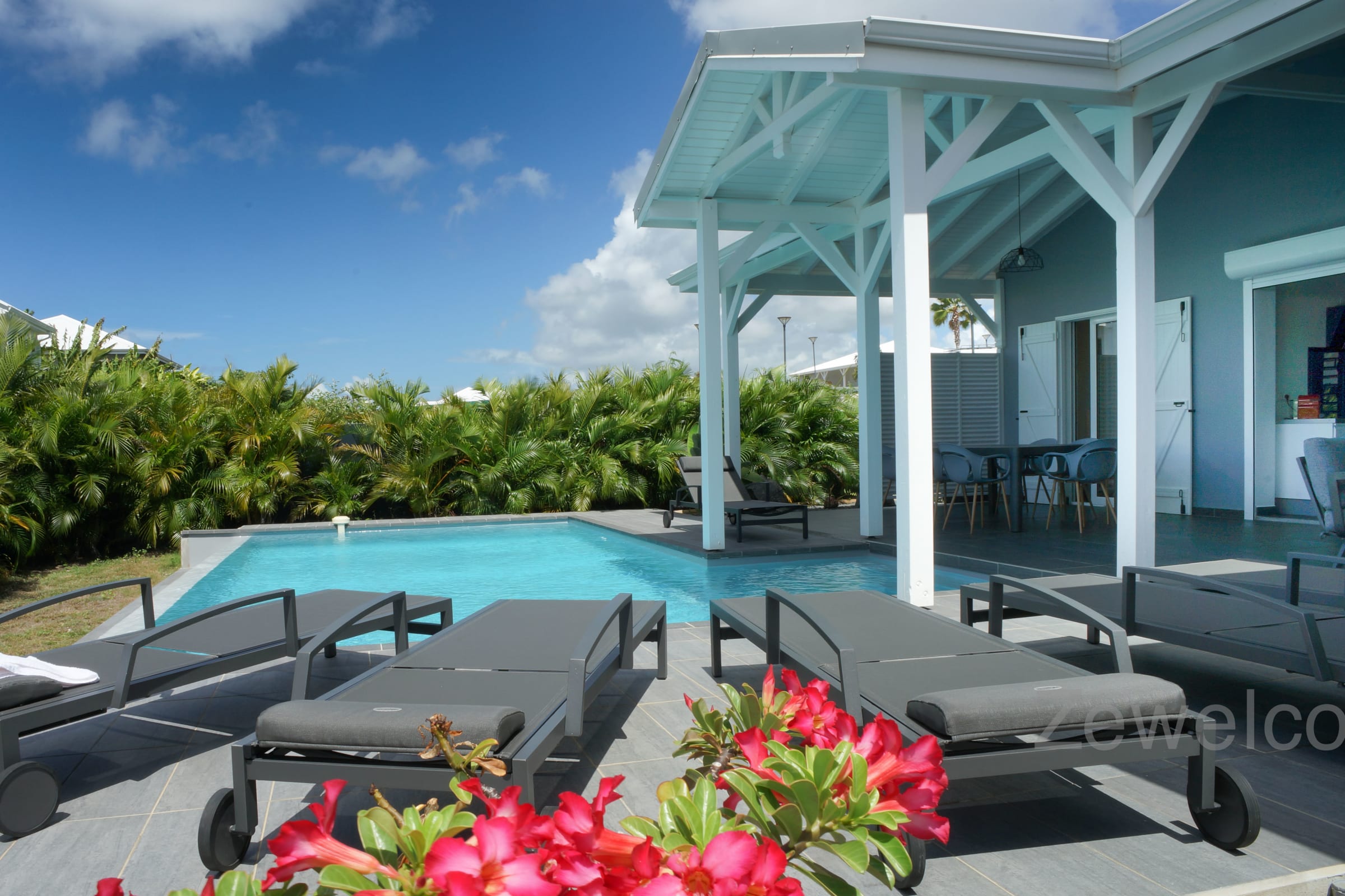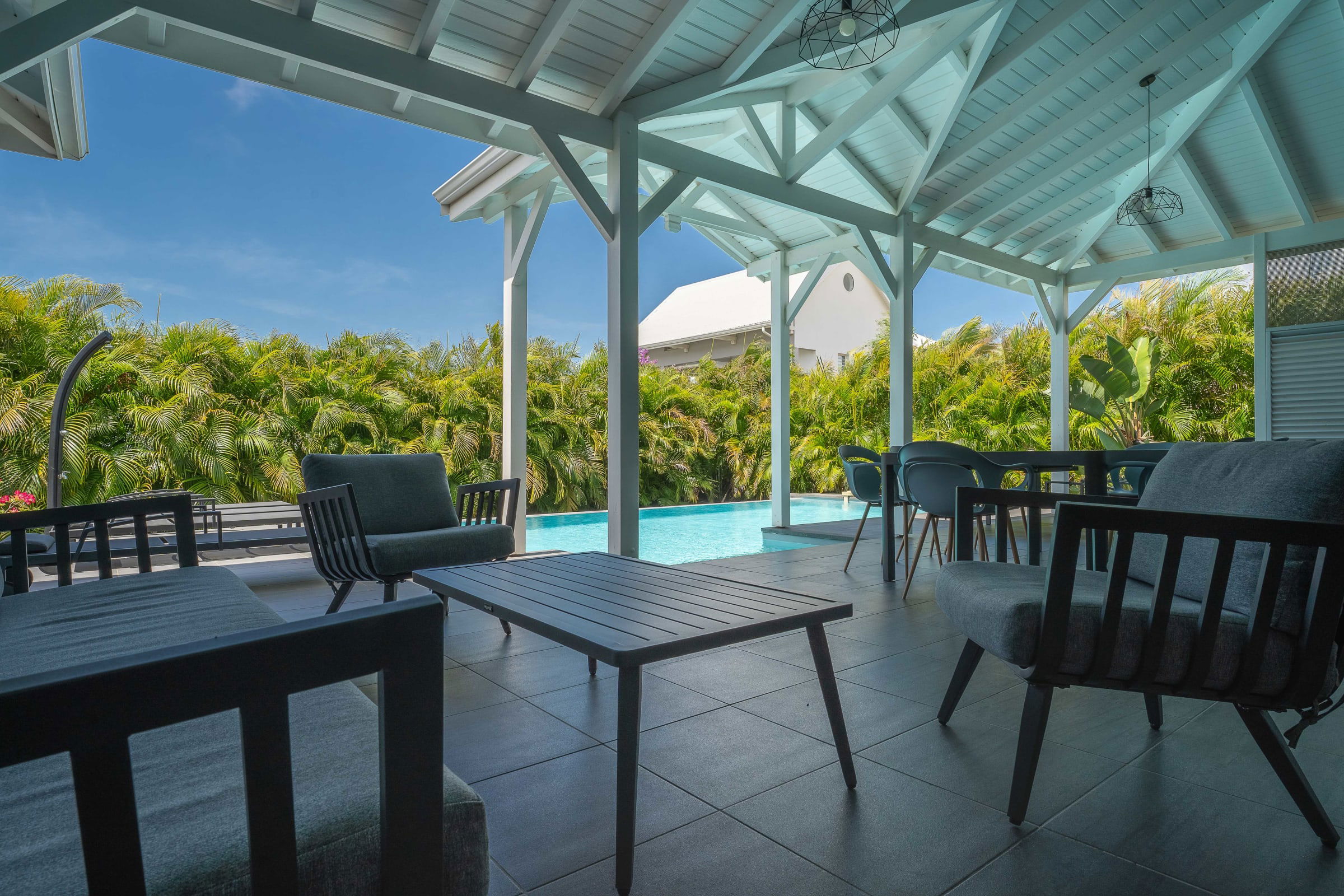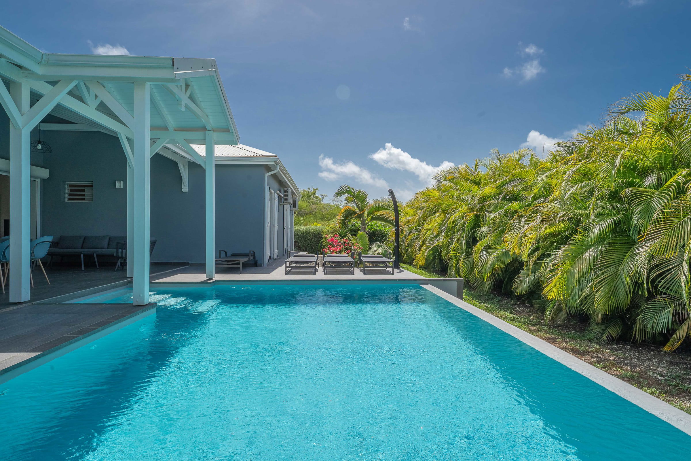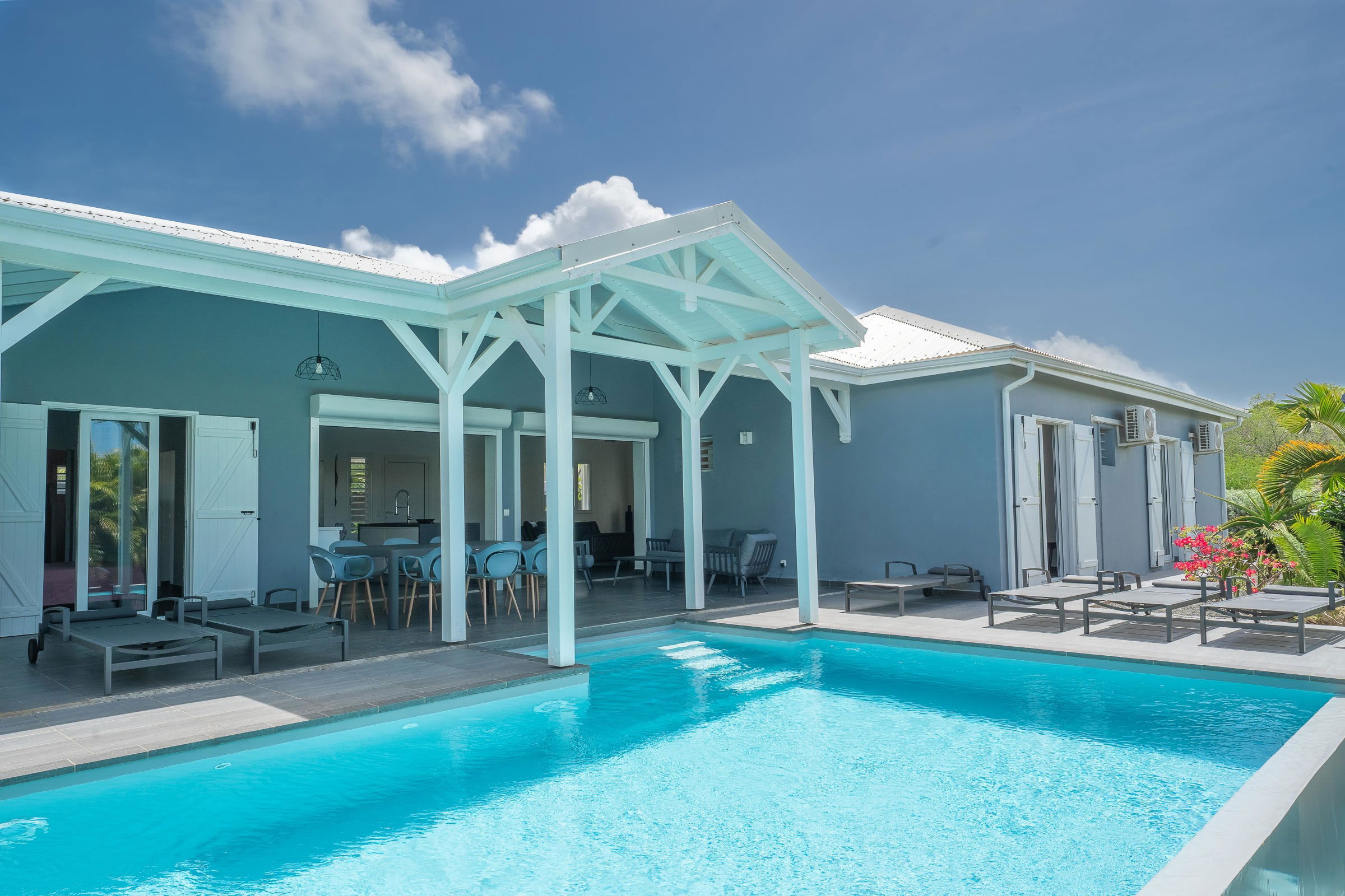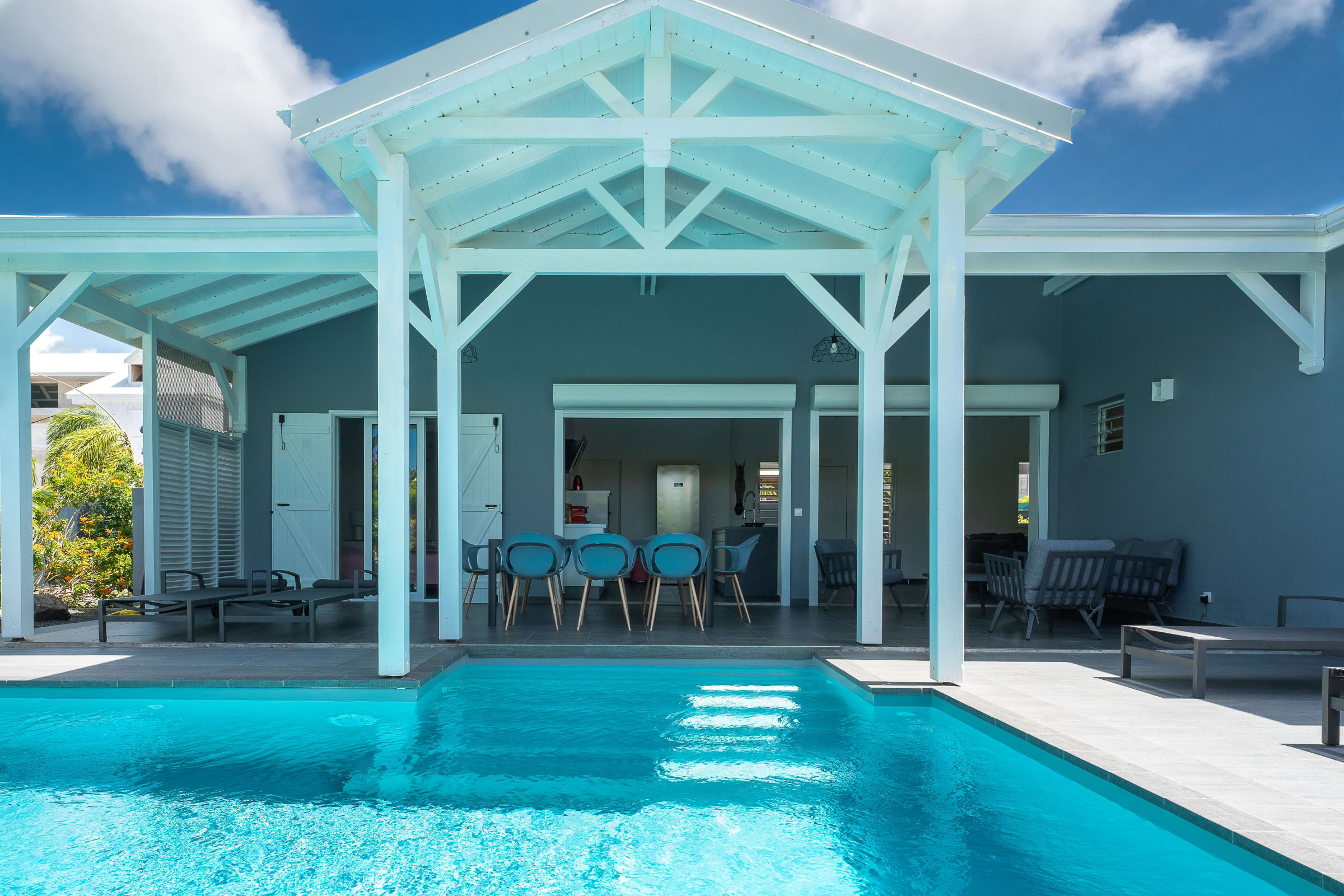 Anamangue, luxury villa is located at the entrance of the city of St. Francois in the residence San Francisco Garden residential complex. Contemporary design. Vast terrace on swimming pool. Beautiful ventilated living room. 4 air-conditioned bedrooms with private shower room.
