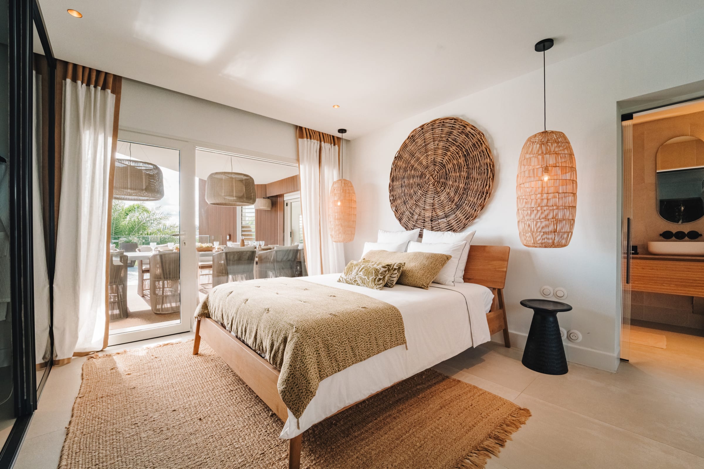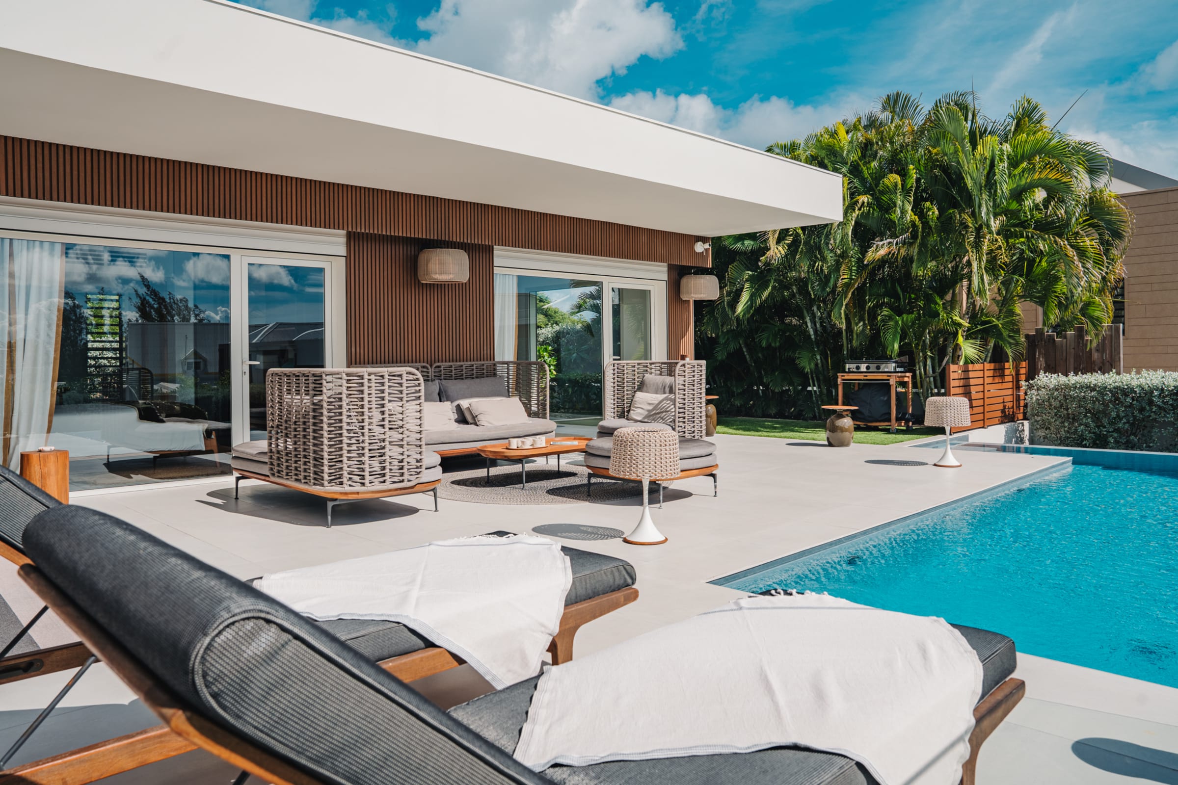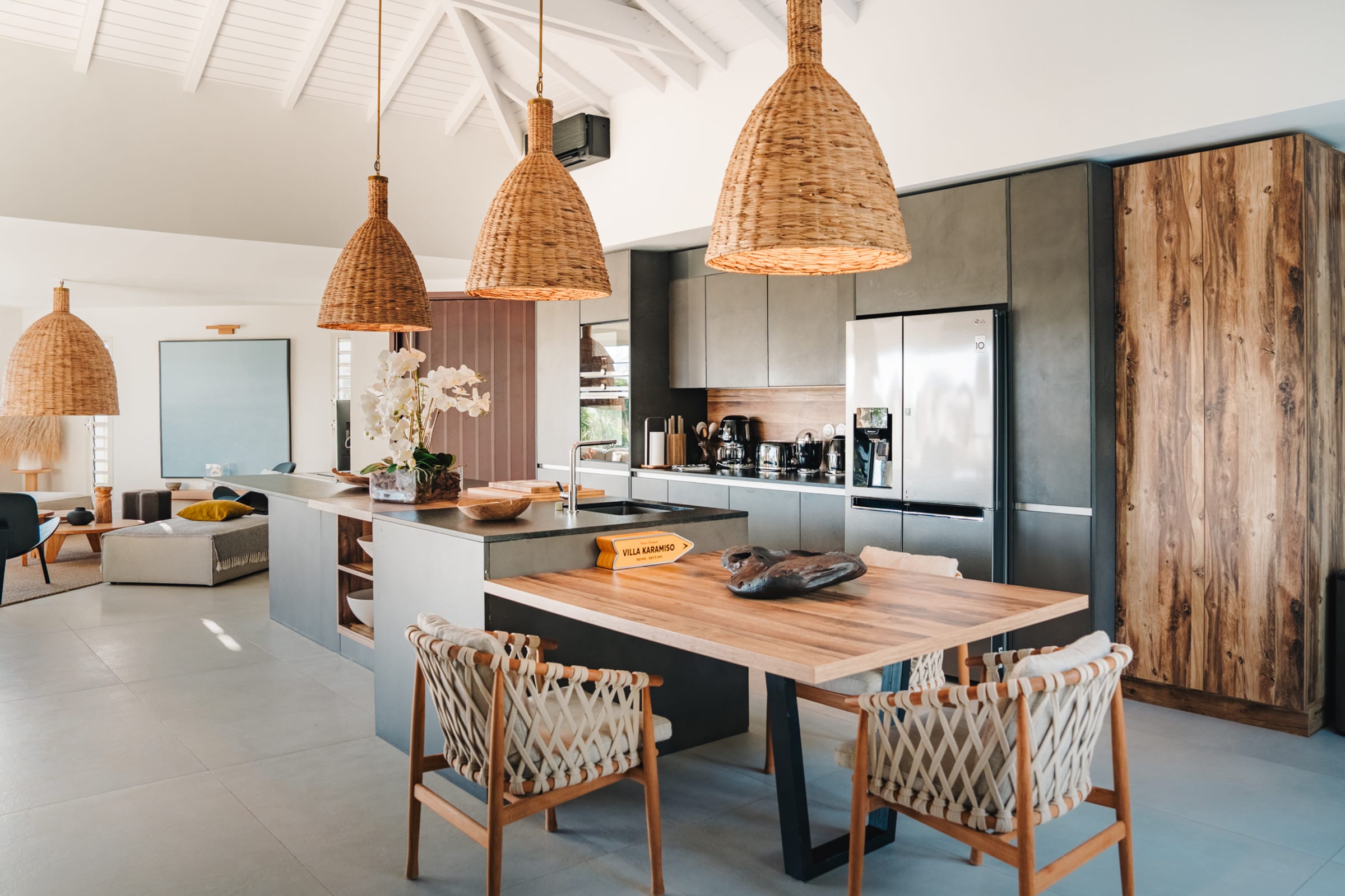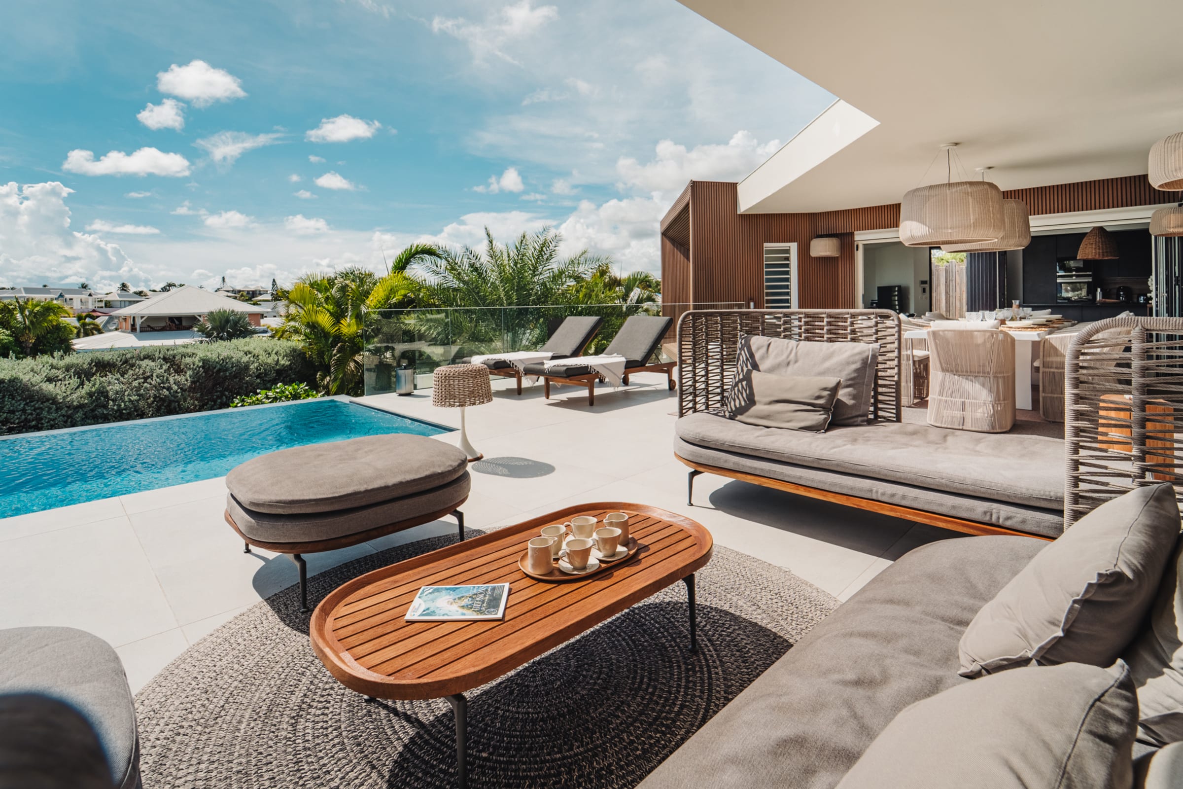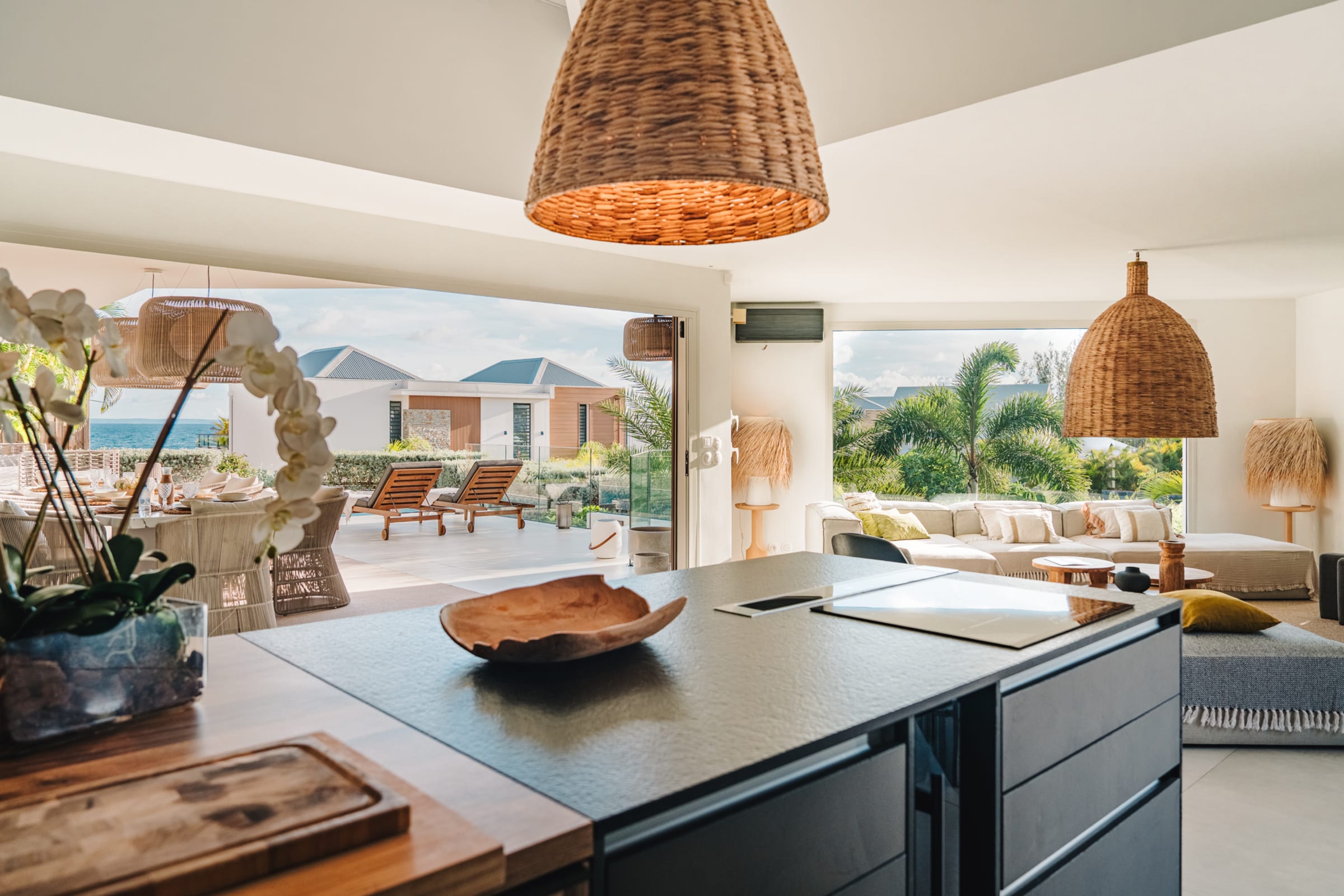 The bright and airy living room combines noble materials with a warm atmosphere. The modern kitchen is fully equipped, with integrated storage and high-quality appliances, allowing you to cook freely. Both the kitchen and the living room are air-conditioned, offering optimal comfort to enjoy your favorite shows or gather for meals around the central island or the large outdoor dining table.