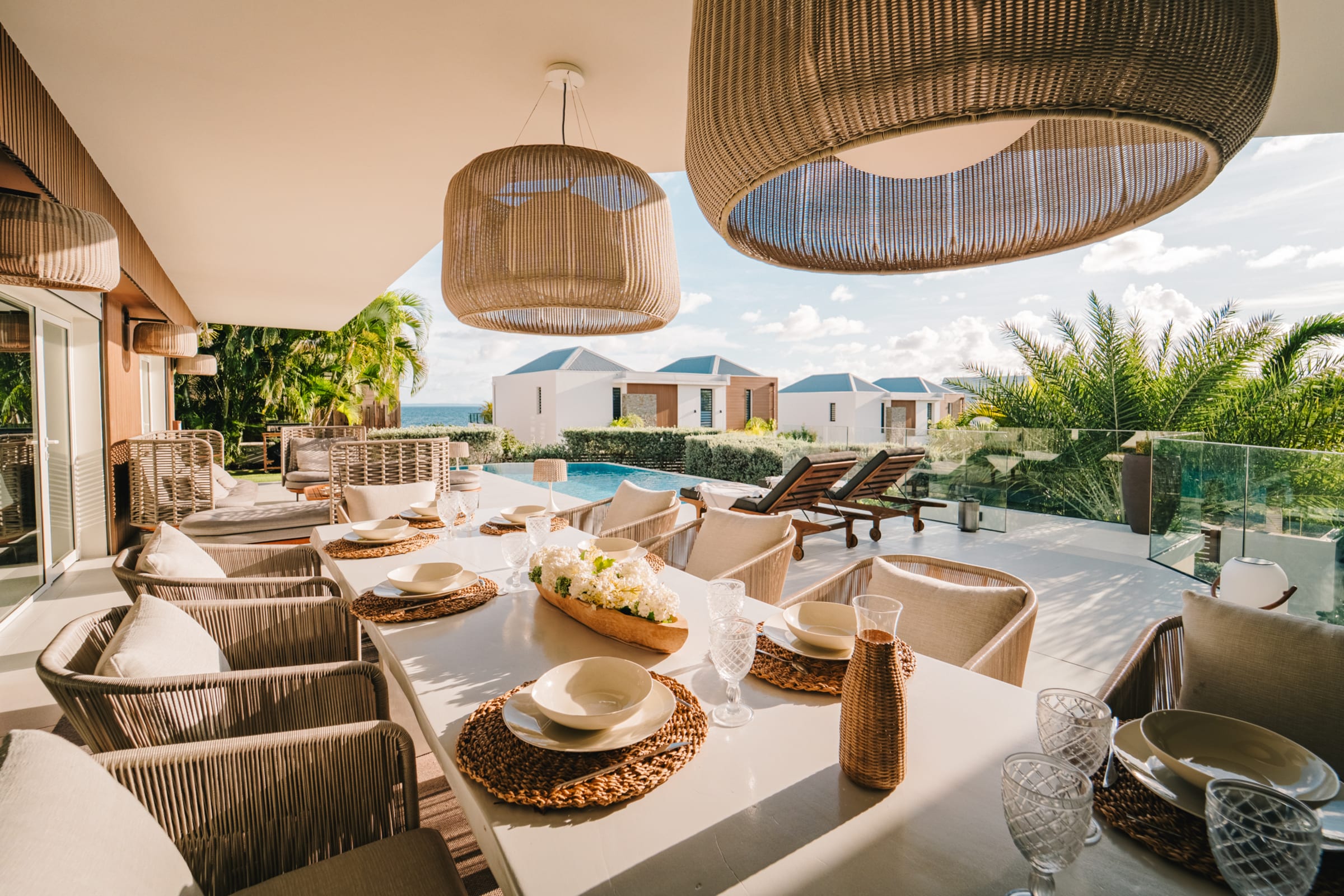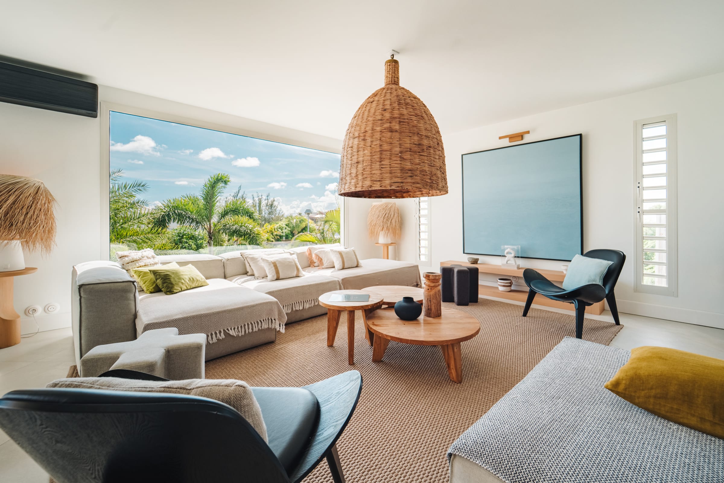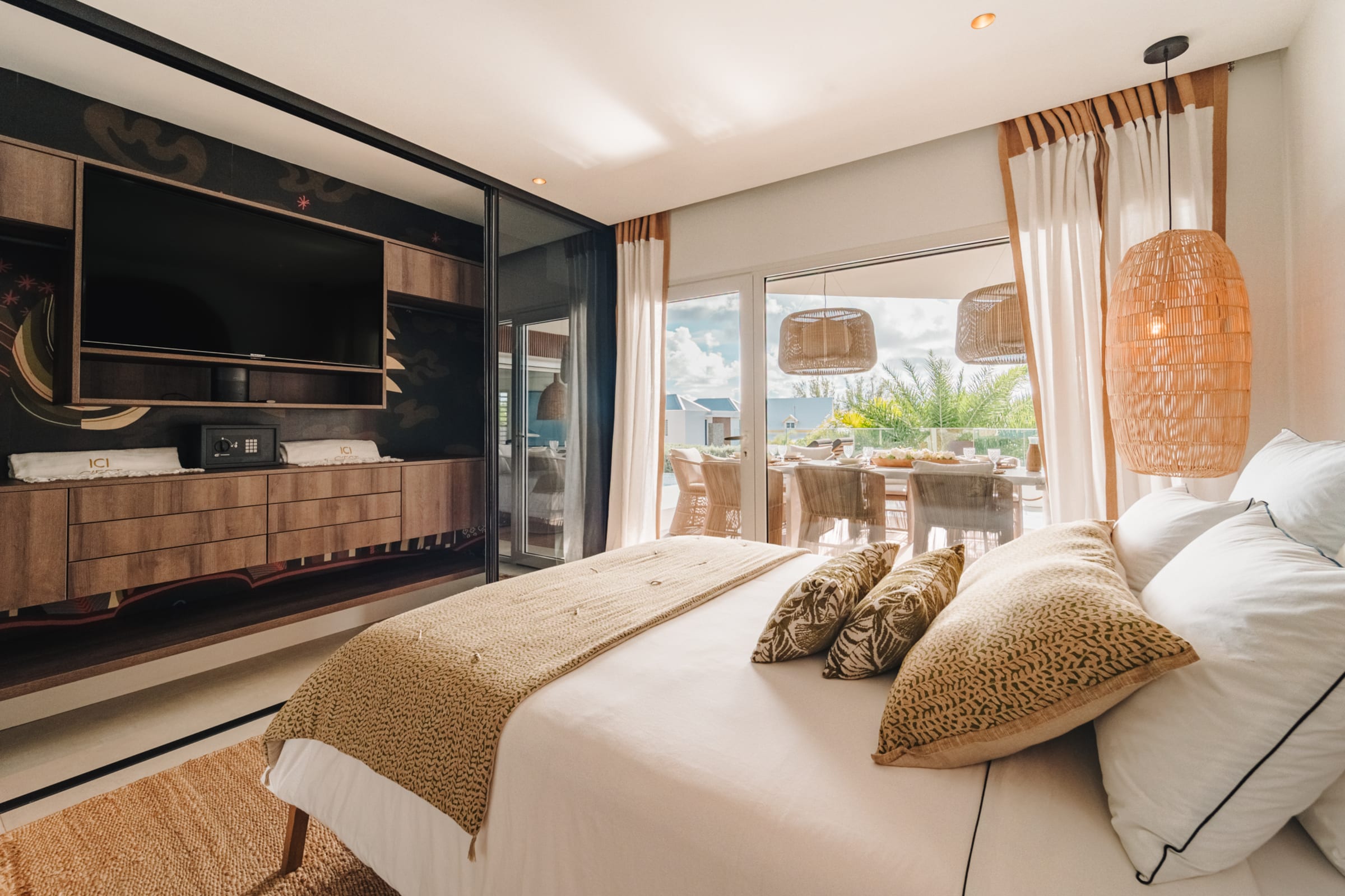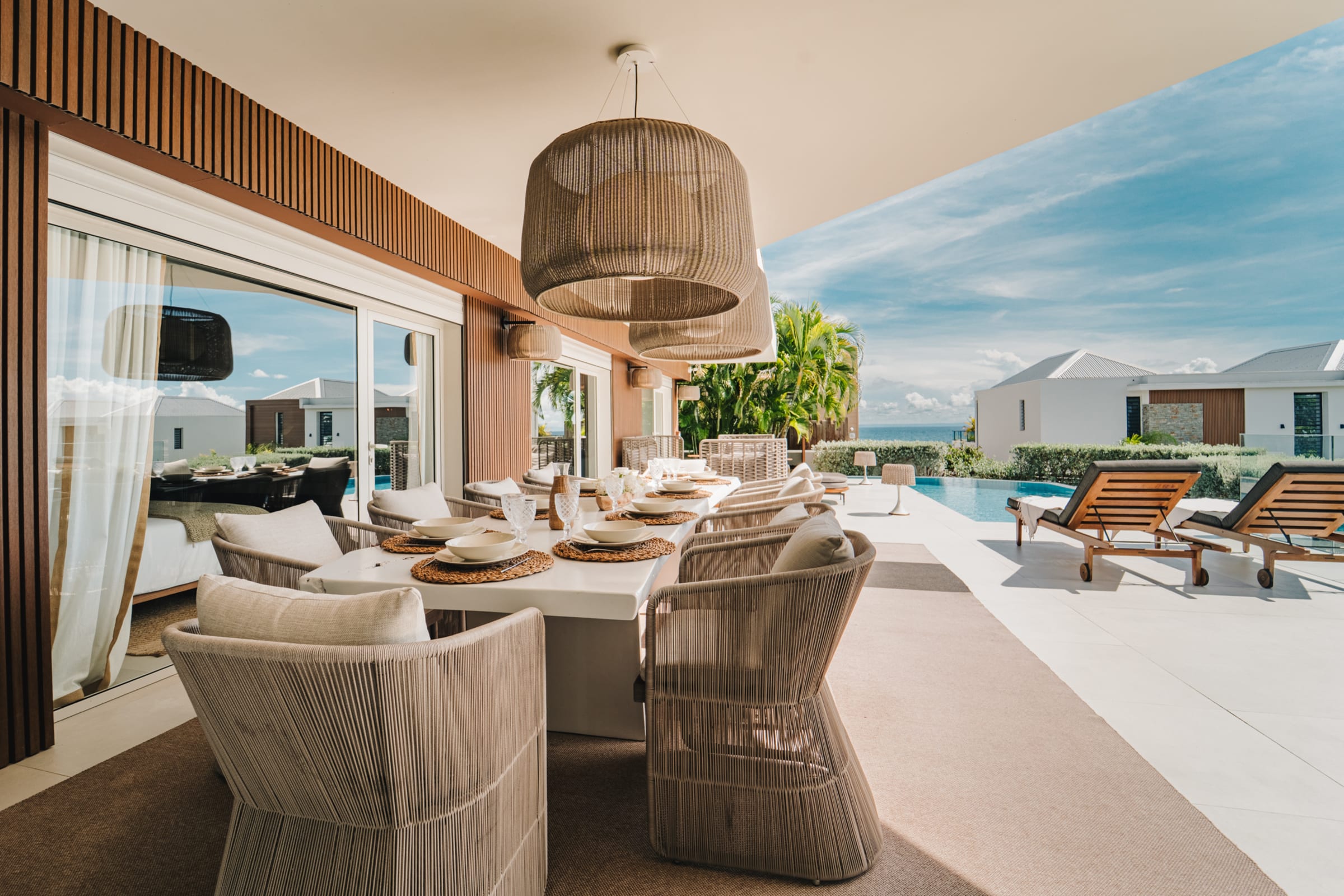 The bright and airy living room combines noble materials with a warm atmosphere. The modern kitchen is fully equipped, with integrated storage and high-quality appliances, allowing you to cook freely. Both the kitchen and the living room are air-conditioned, offering optimal comfort to enjoy your favorite shows or gather for meals around the central island or the large outdoor dining table.