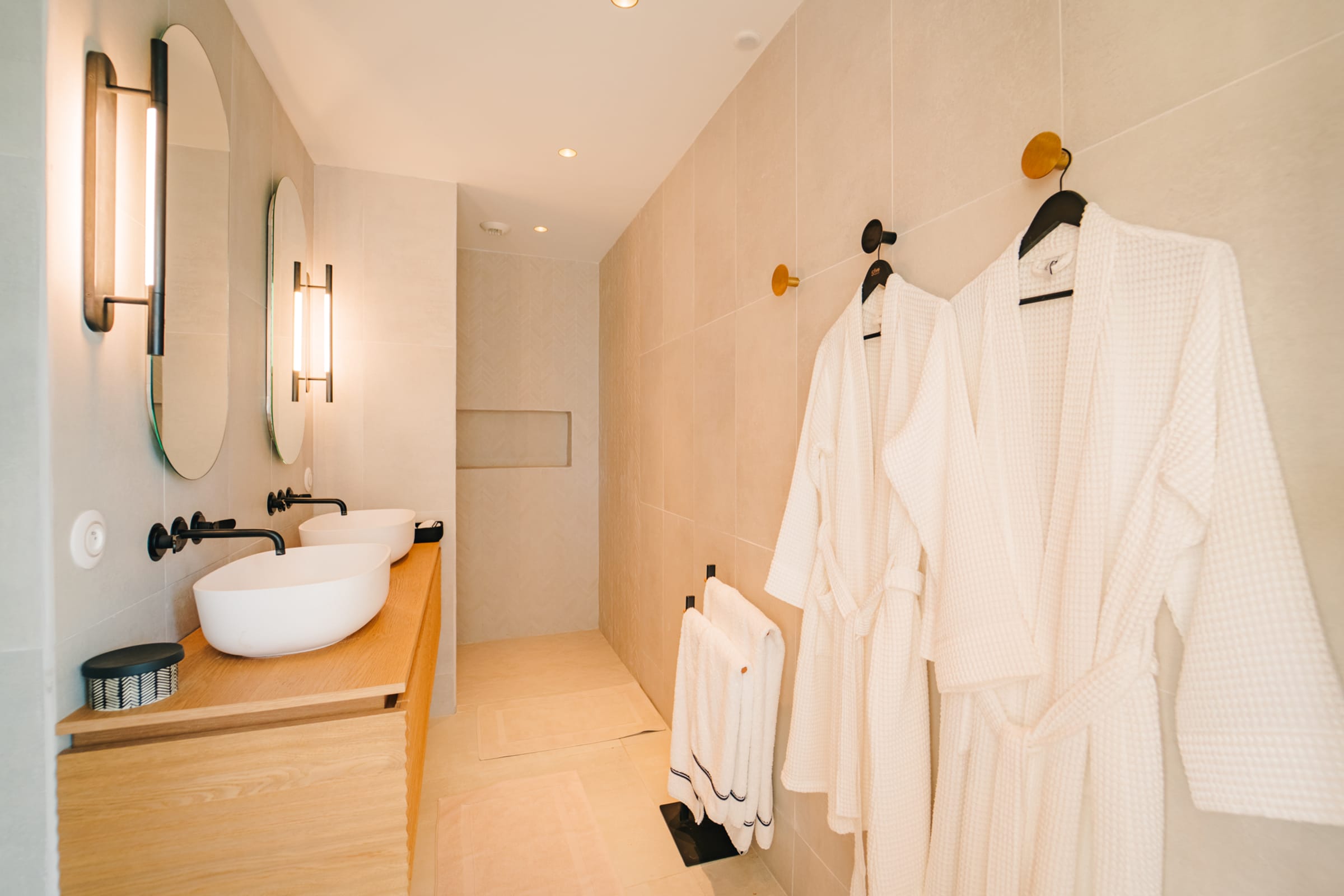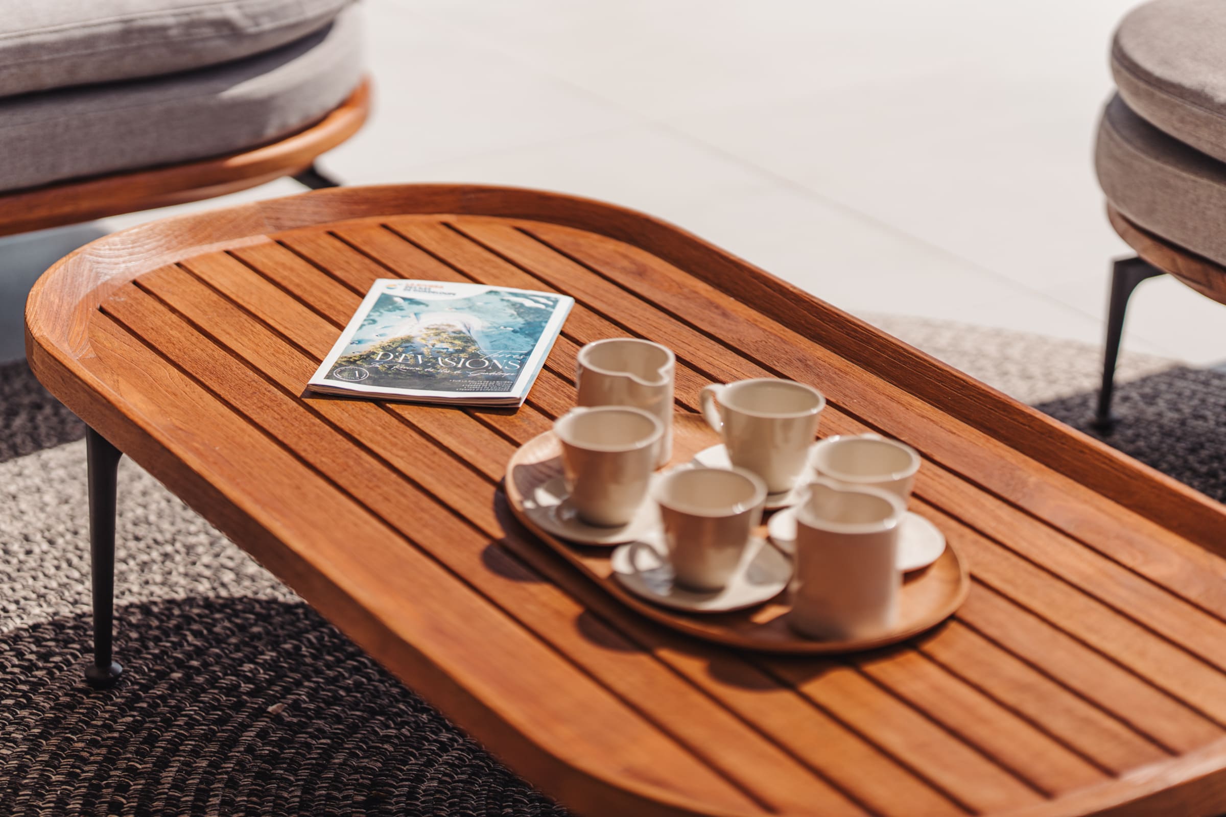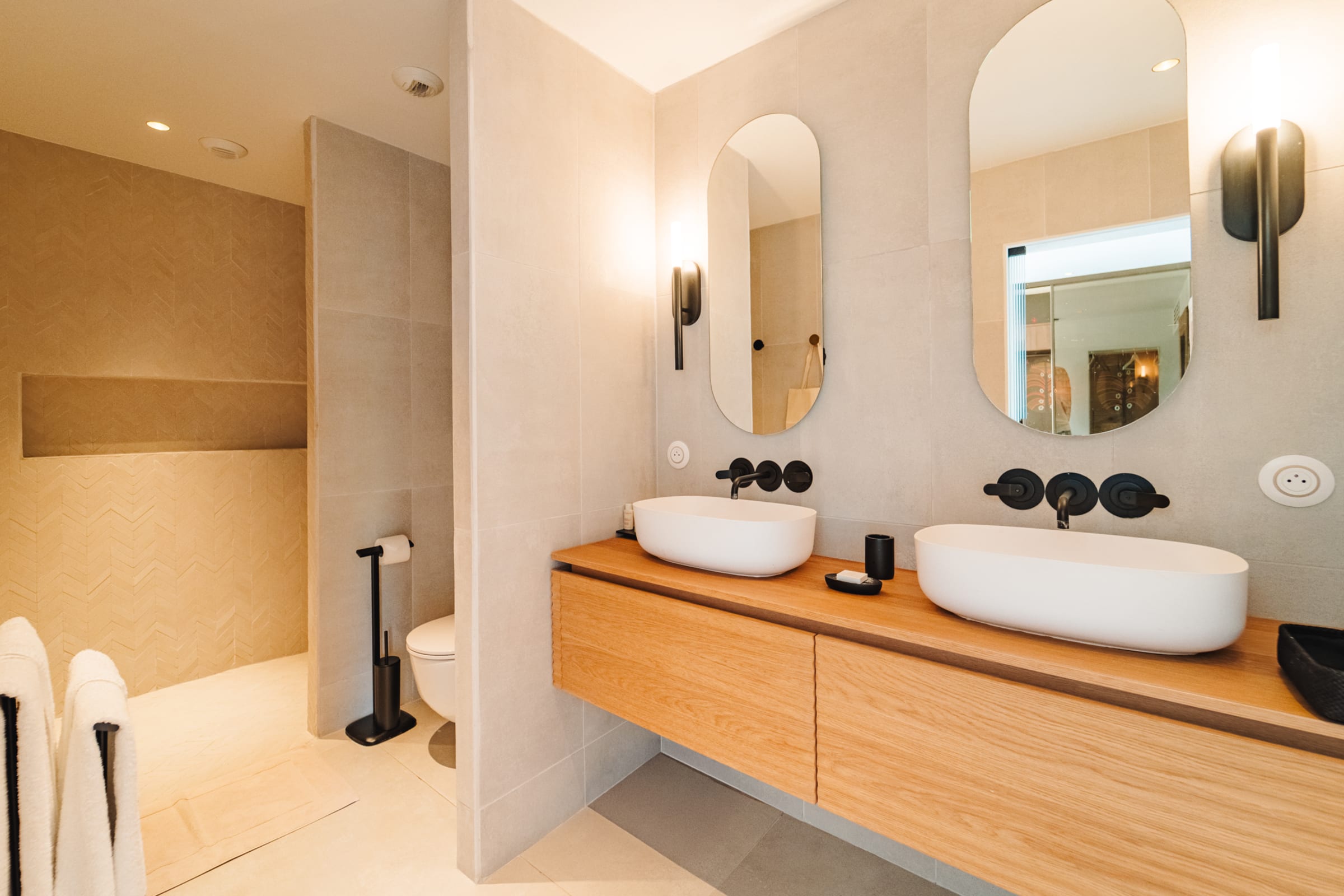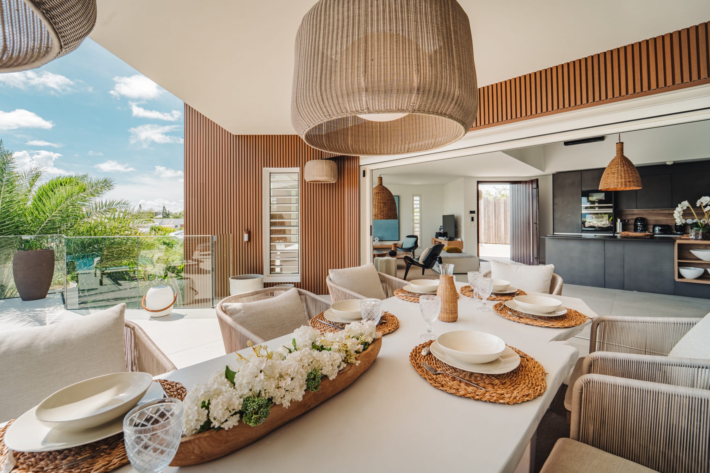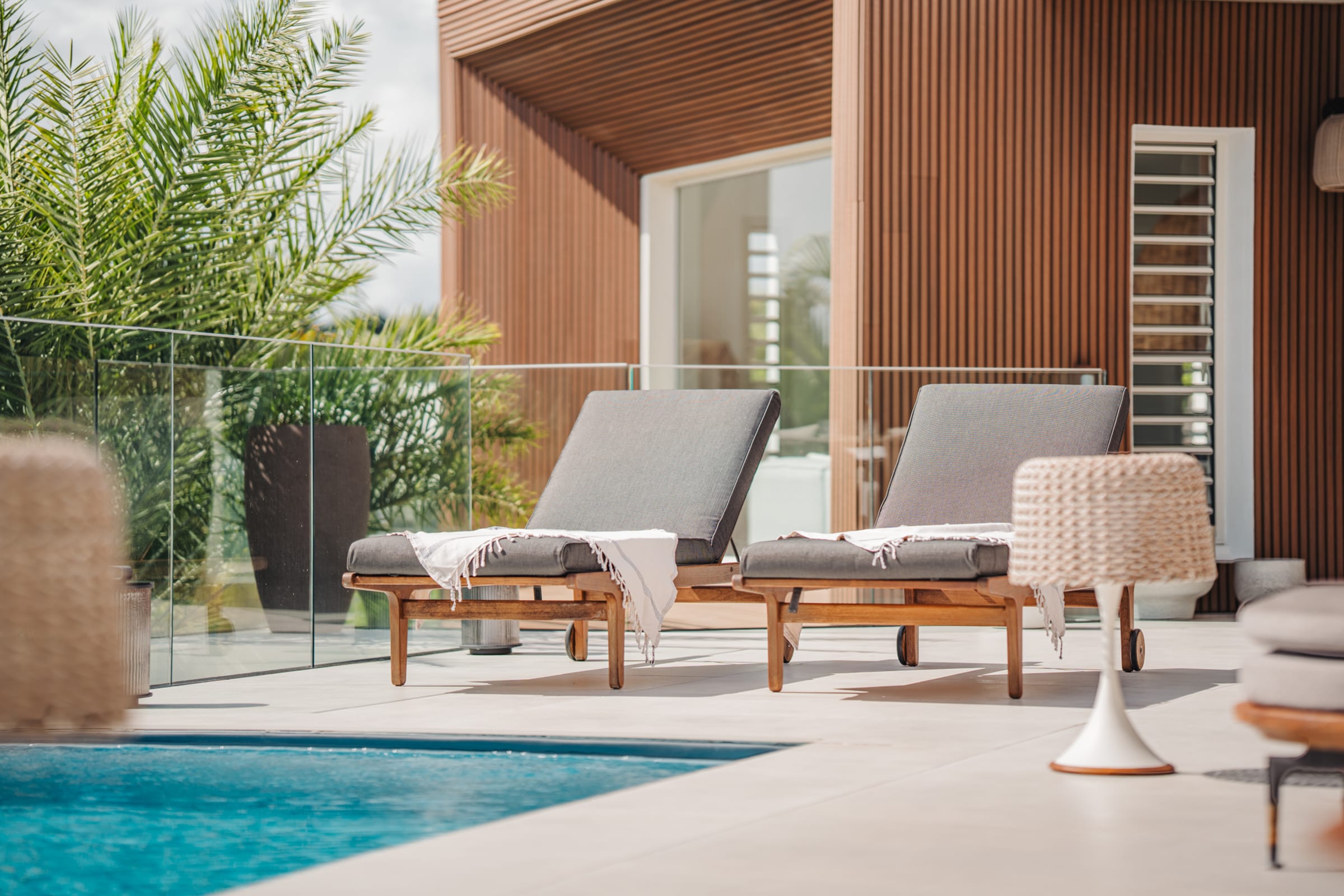 The bright and airy living room combines noble materials with a warm atmosphere. The modern kitchen is fully equipped, with integrated storage and high-quality appliances, allowing you to cook freely. Both the kitchen and the living room are air-conditioned, offering optimal comfort to enjoy your favorite shows or gather for meals around the central island or the large outdoor dining table.