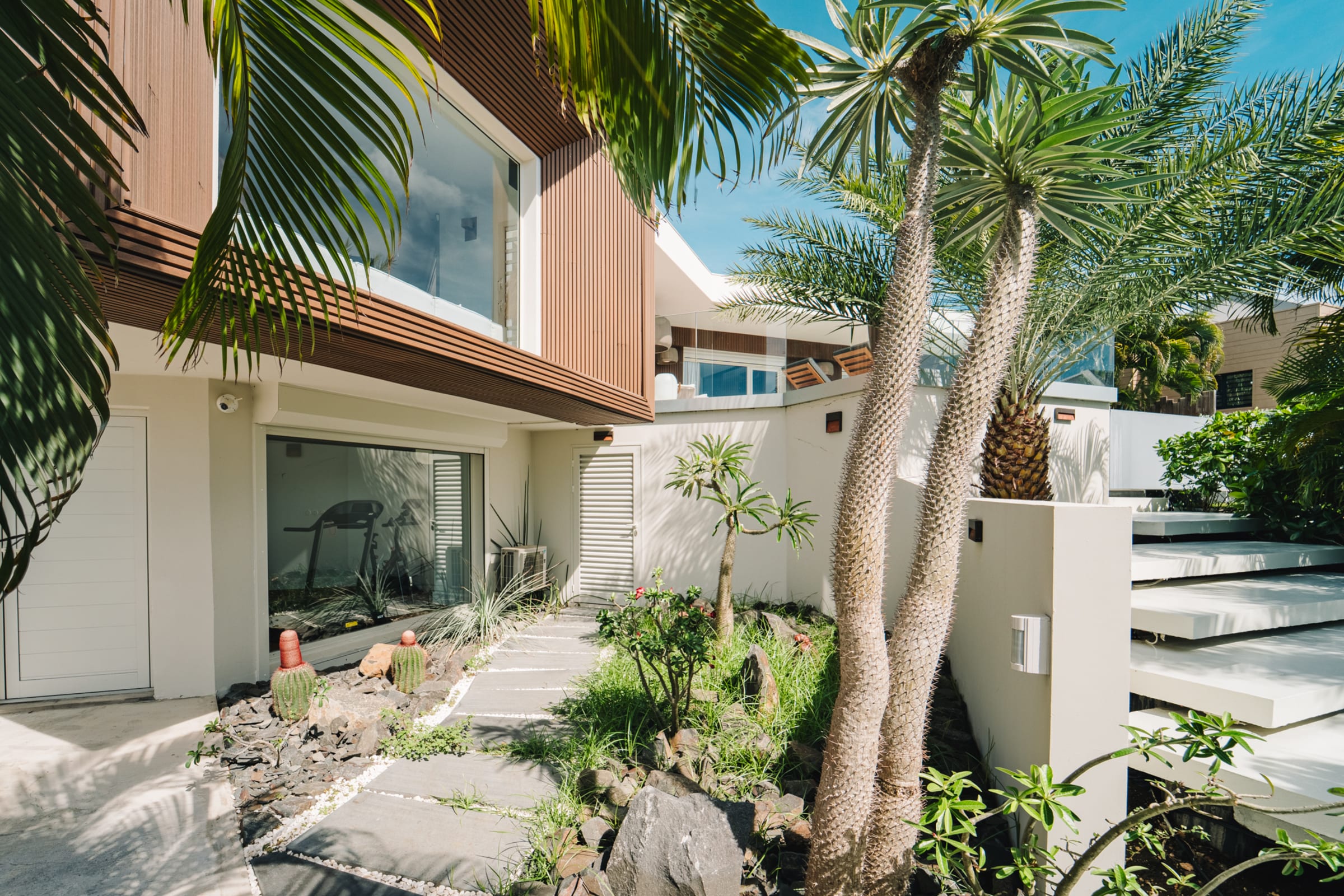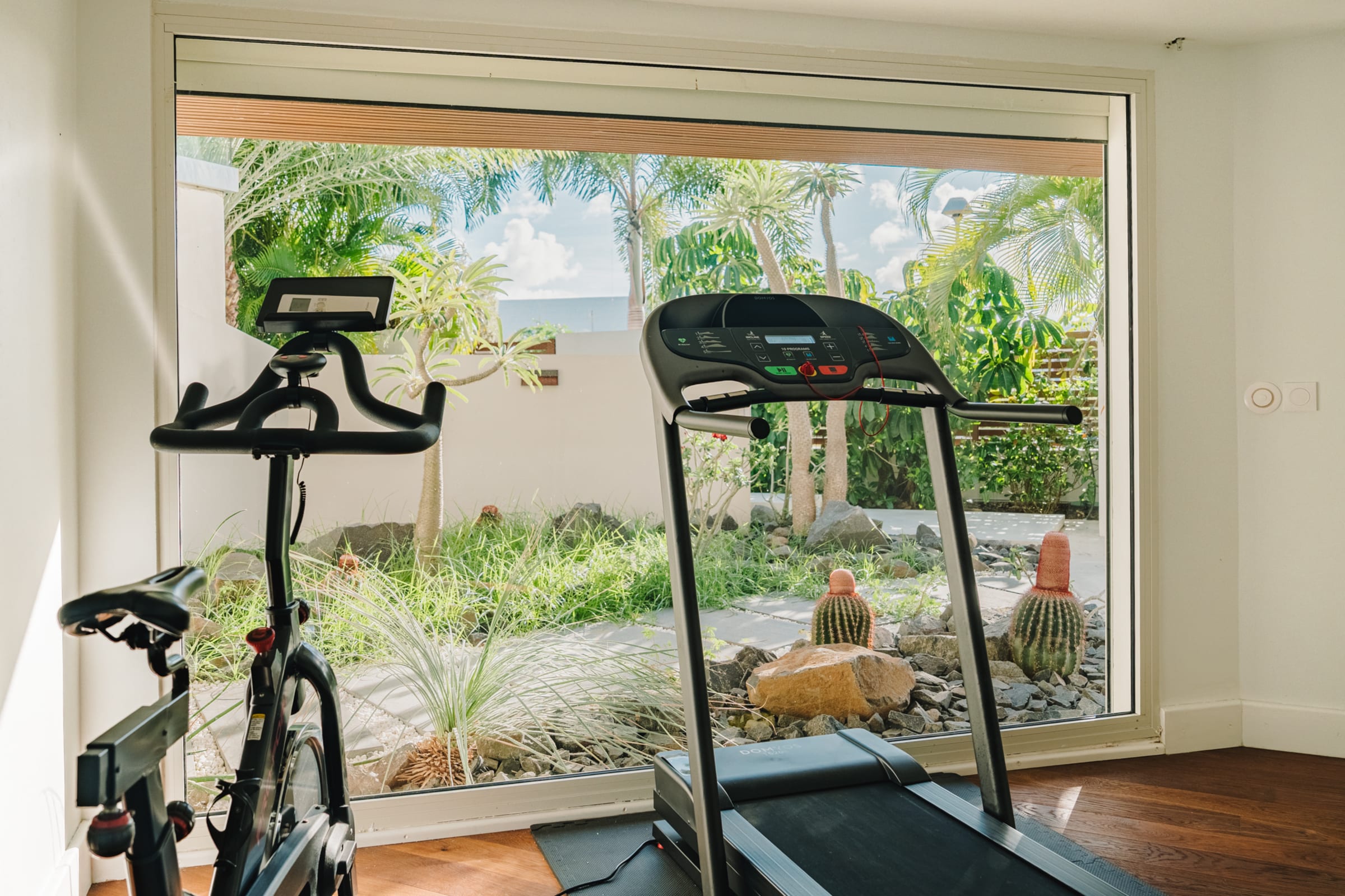 The outdoor terrace invites you to relax with its cozy lounging areas. A fitness room is located on the ground floor, equipped with a treadmill, a bike, and various accessories to help you stay in shape even during your vacation.