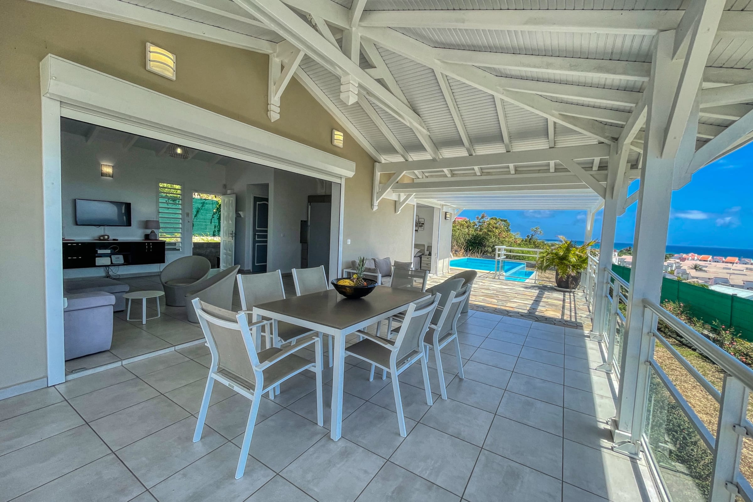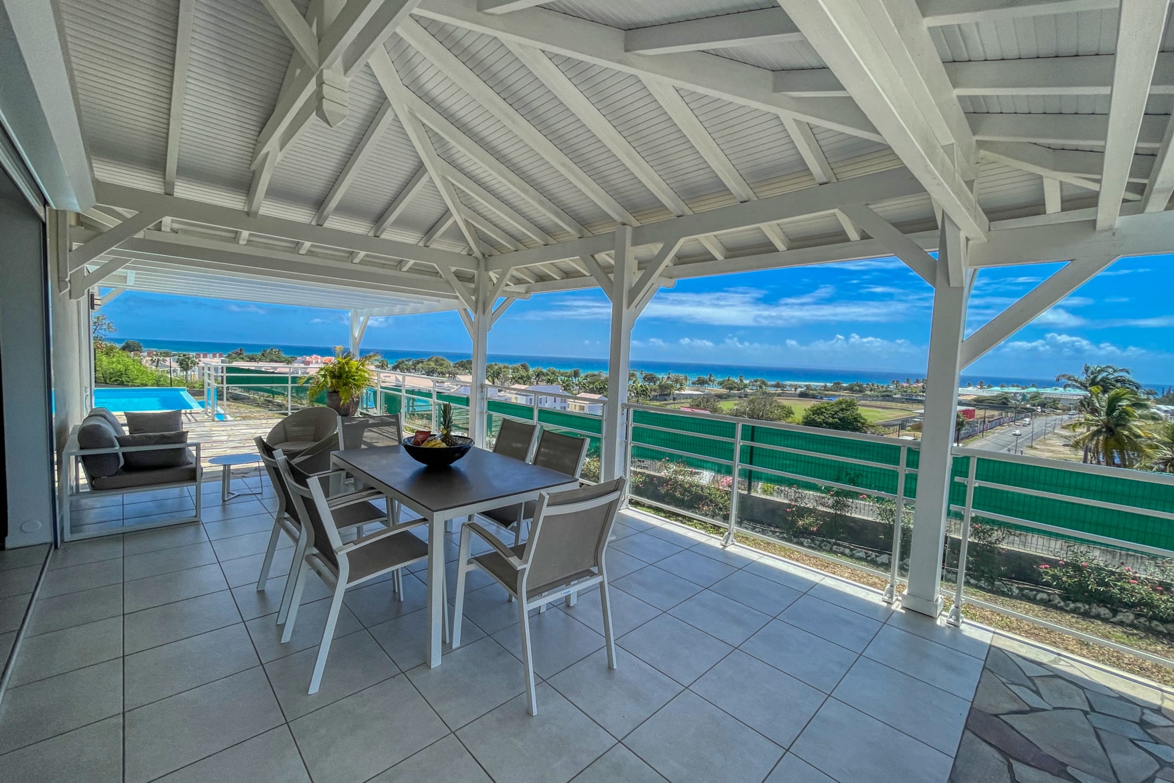 The covered outdoor terrace features a dining area and a cozy outdoor lounge. The infinity pool is bordered by sun loungers, perfect for soaking up the sun while gazing out at the sea.