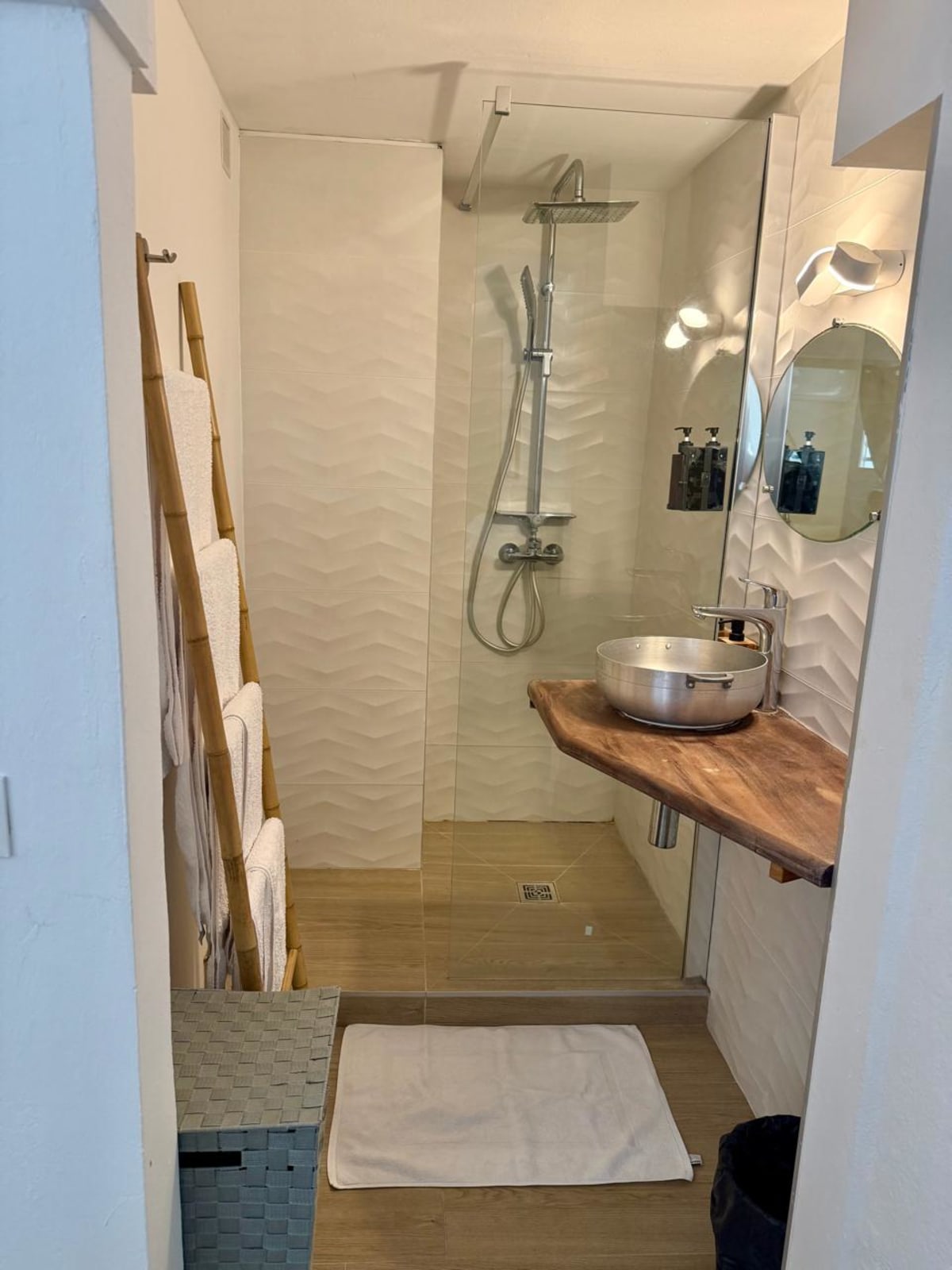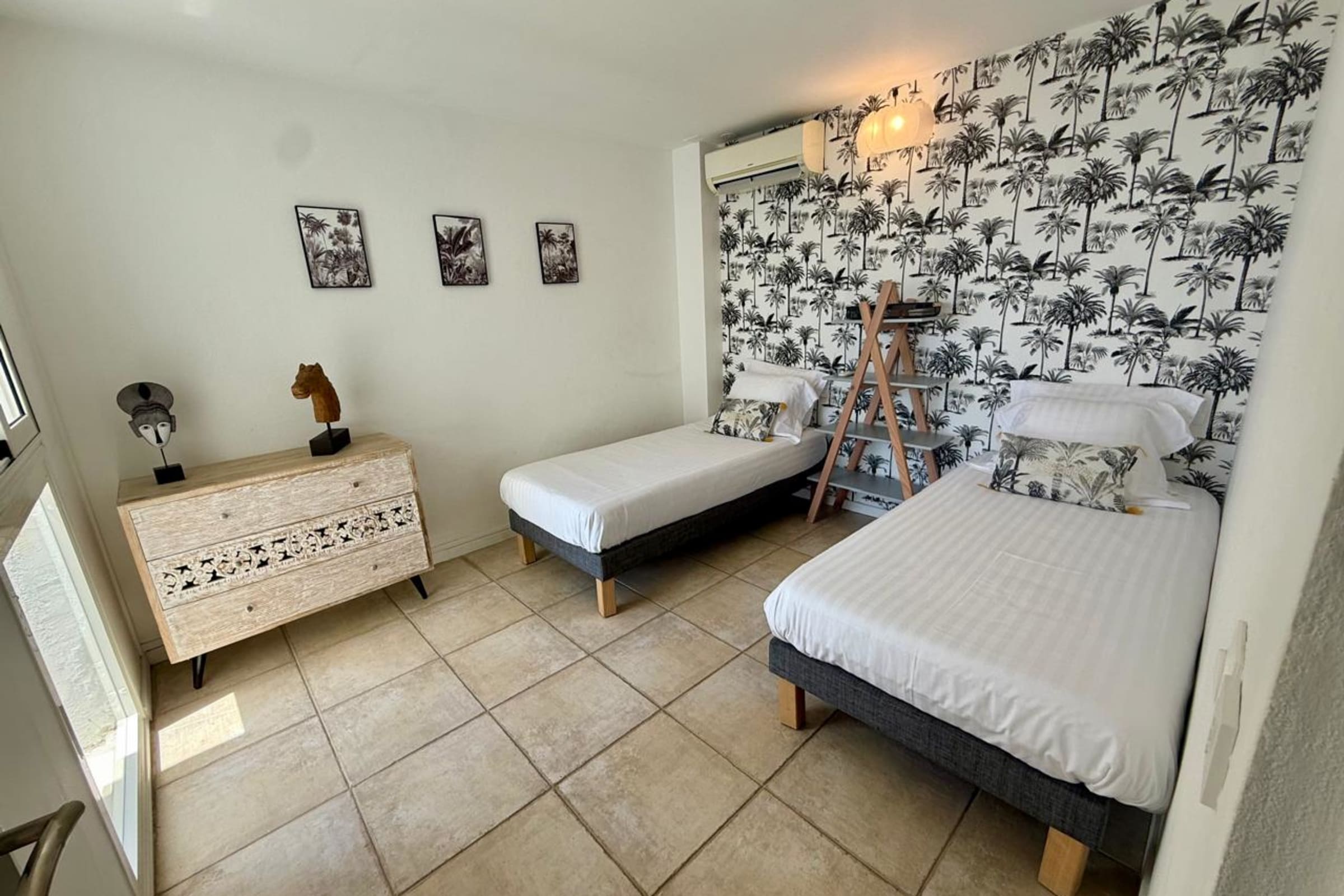 On the upper floor, there is a bedroom with 2 single beds and a spacious master suite equipped with a king-size bed, a bathroom, and a private terrace with a double sun lounger.