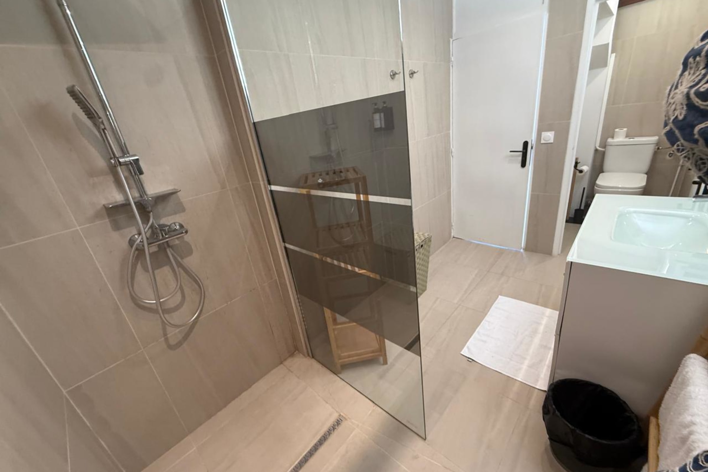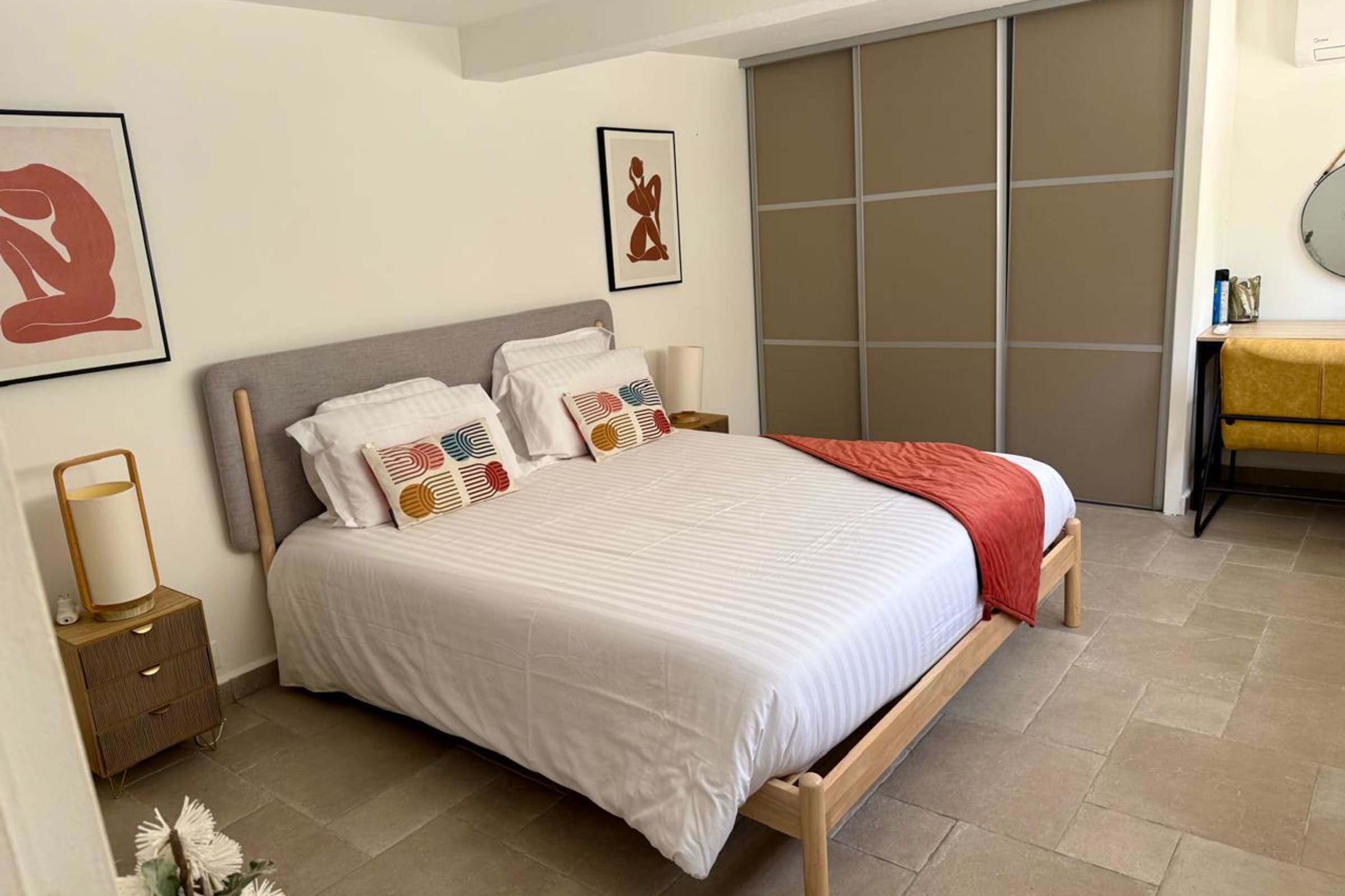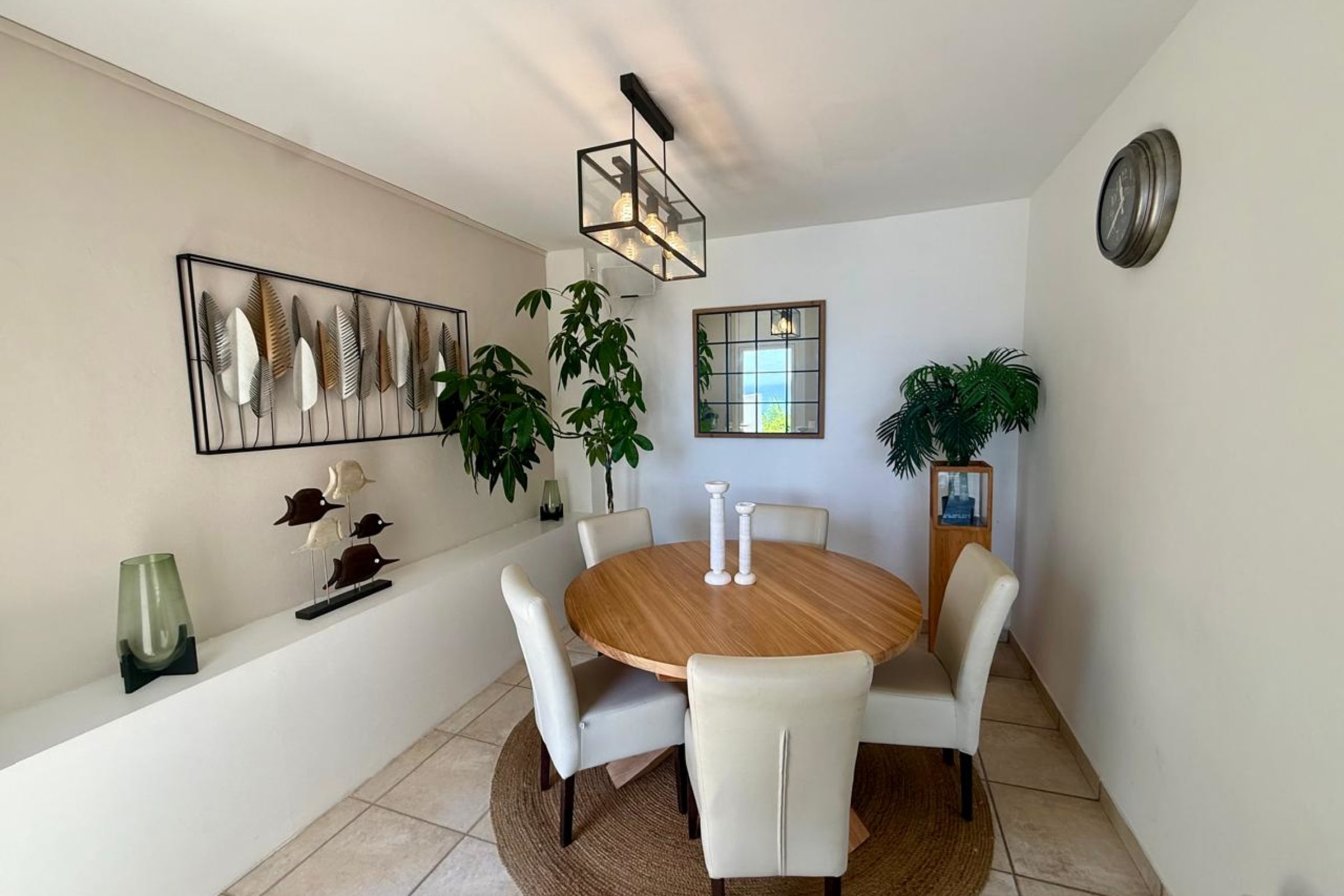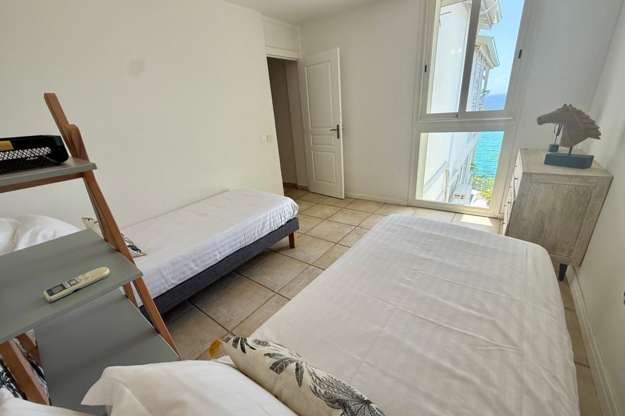The main level features an open kitchen leading to a beautiful dining room and an air-conditioned living room. The terrace facing the living room offers an unobstructed view of the sea. On this same level, you will find the bedroom with an en-suite bathroom.