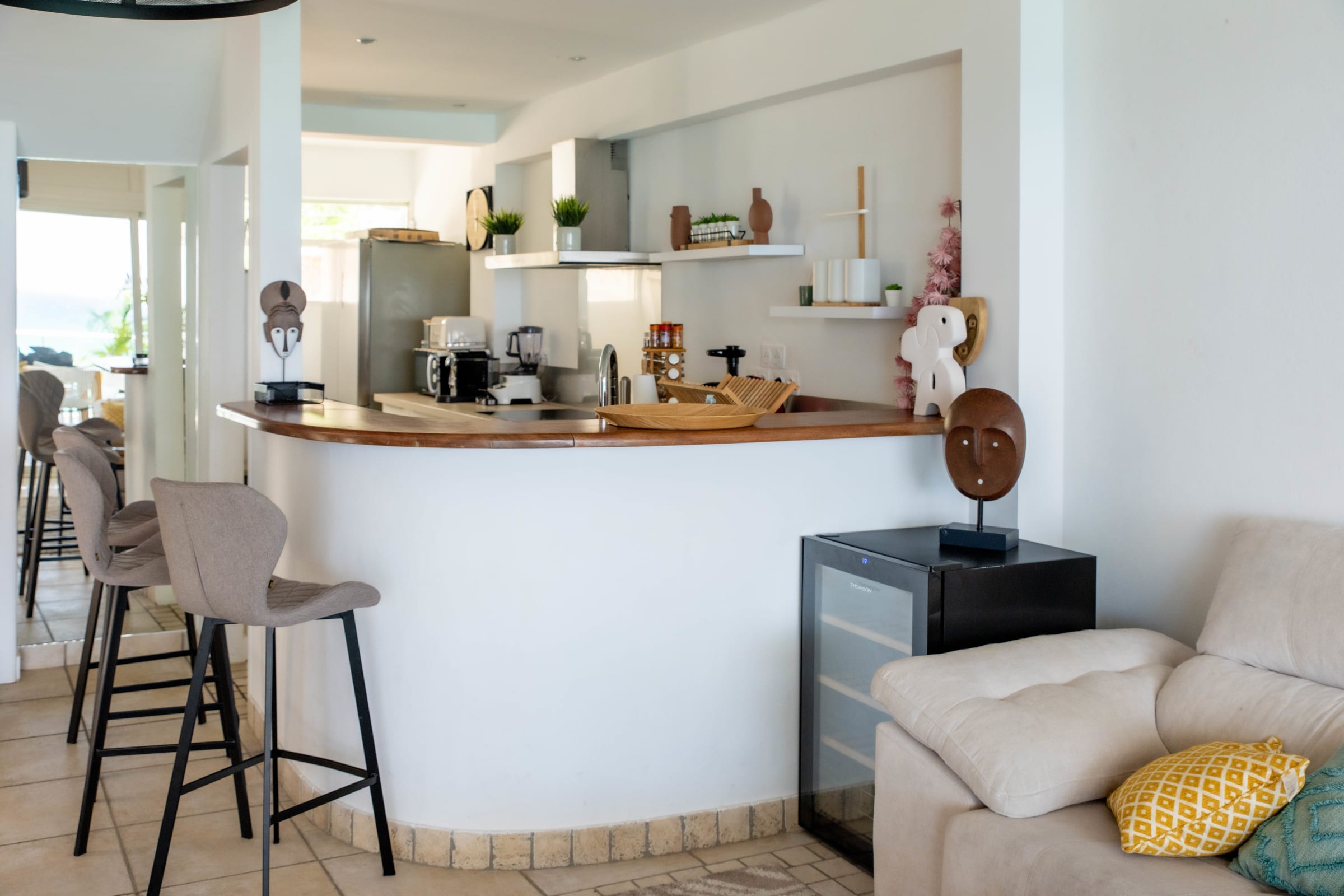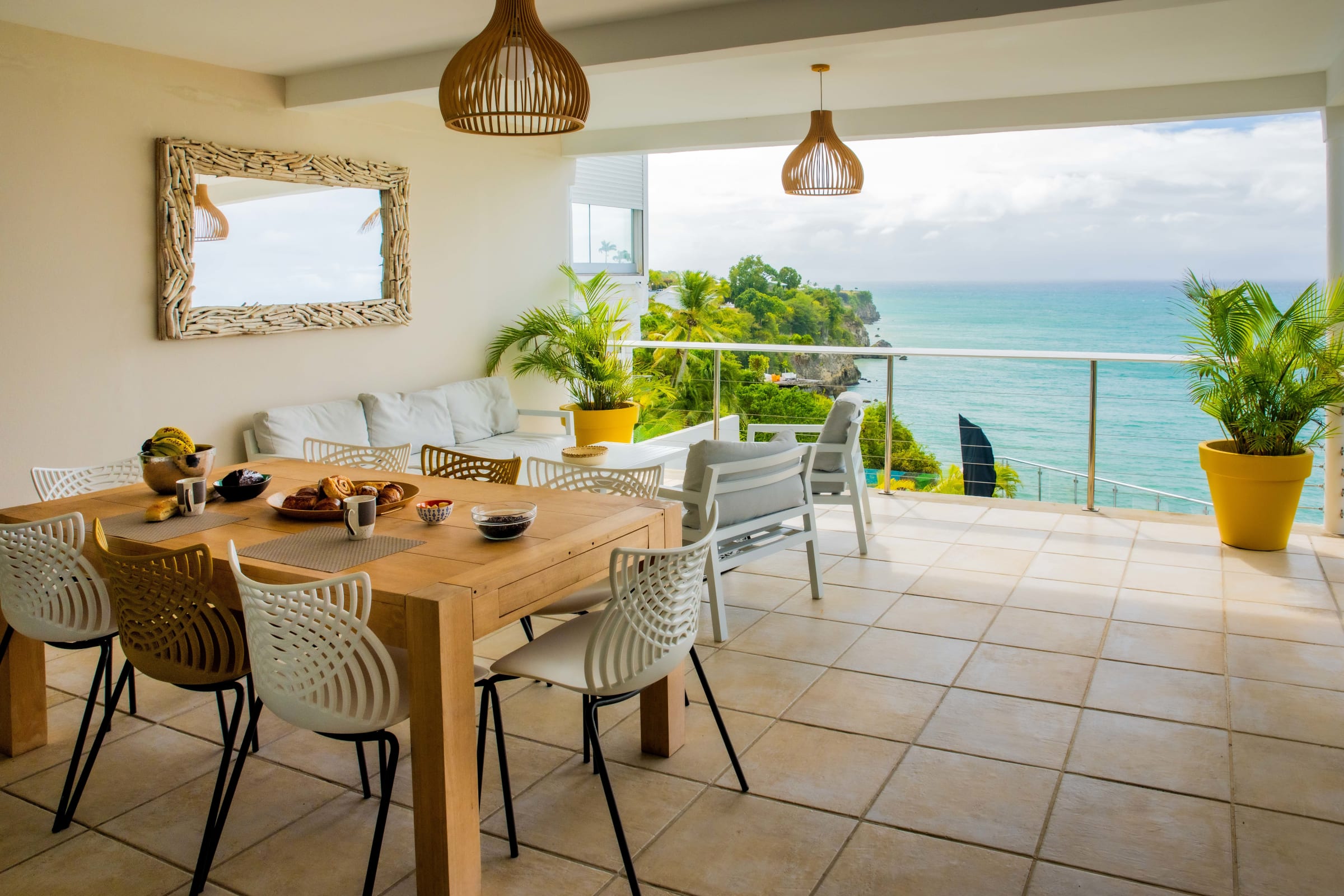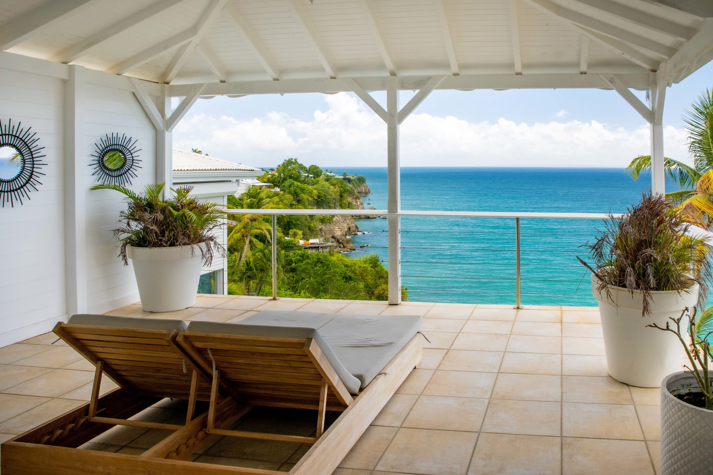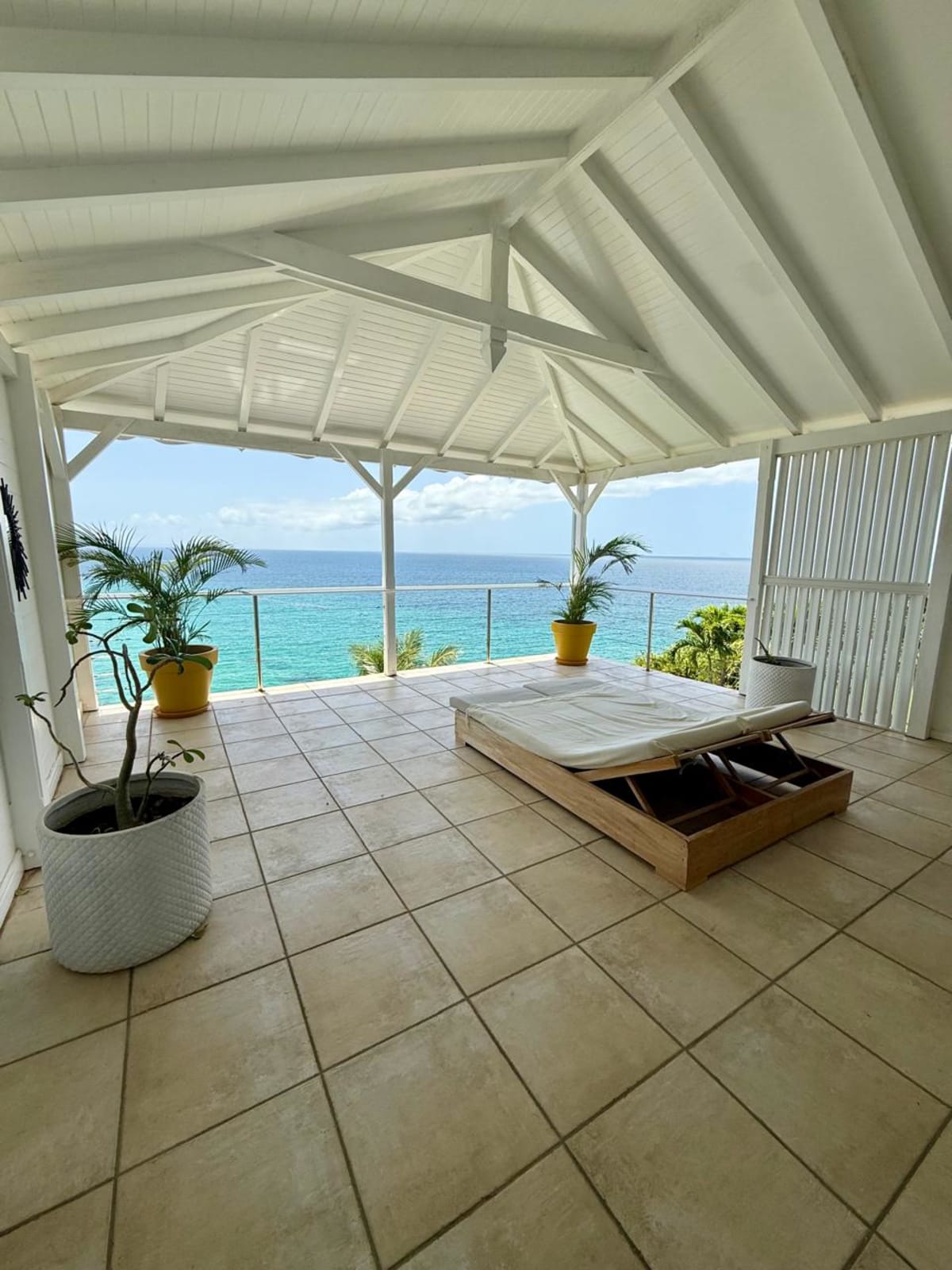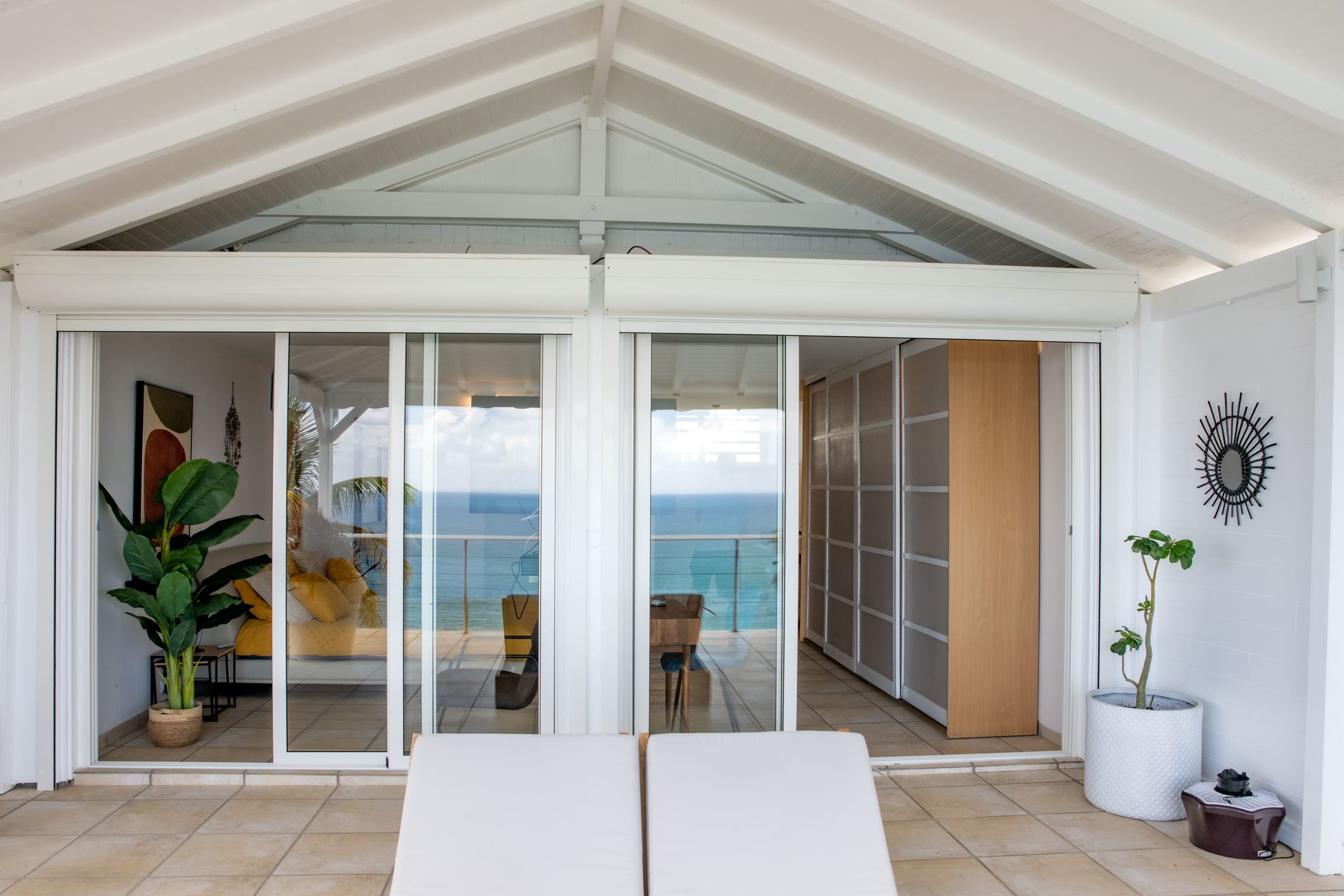 Perched atop a cliff, the villa offers a breathtaking view of the sea, Basse Terre, Marie-Galante, and even Dominica when the sky is clear.