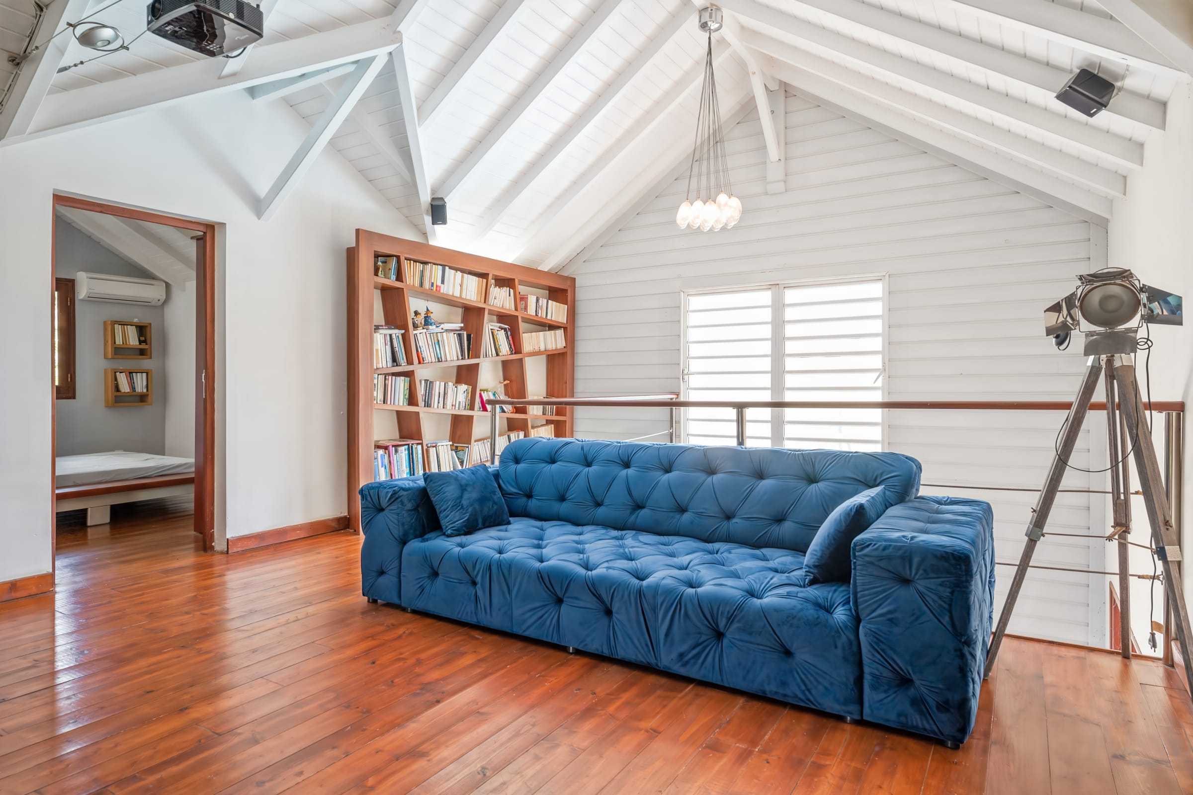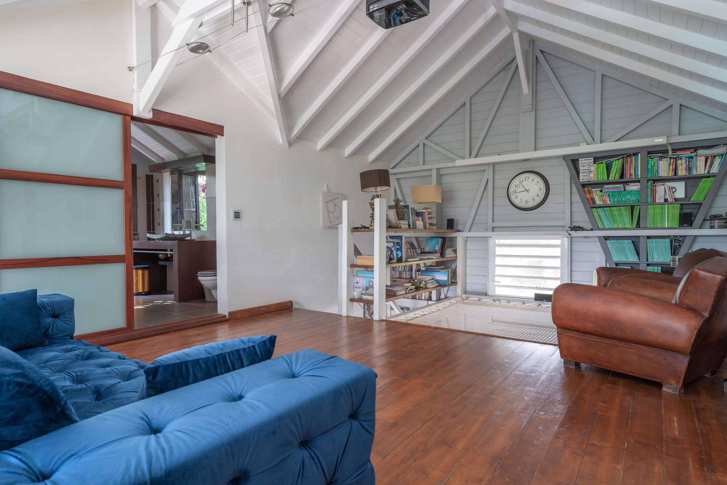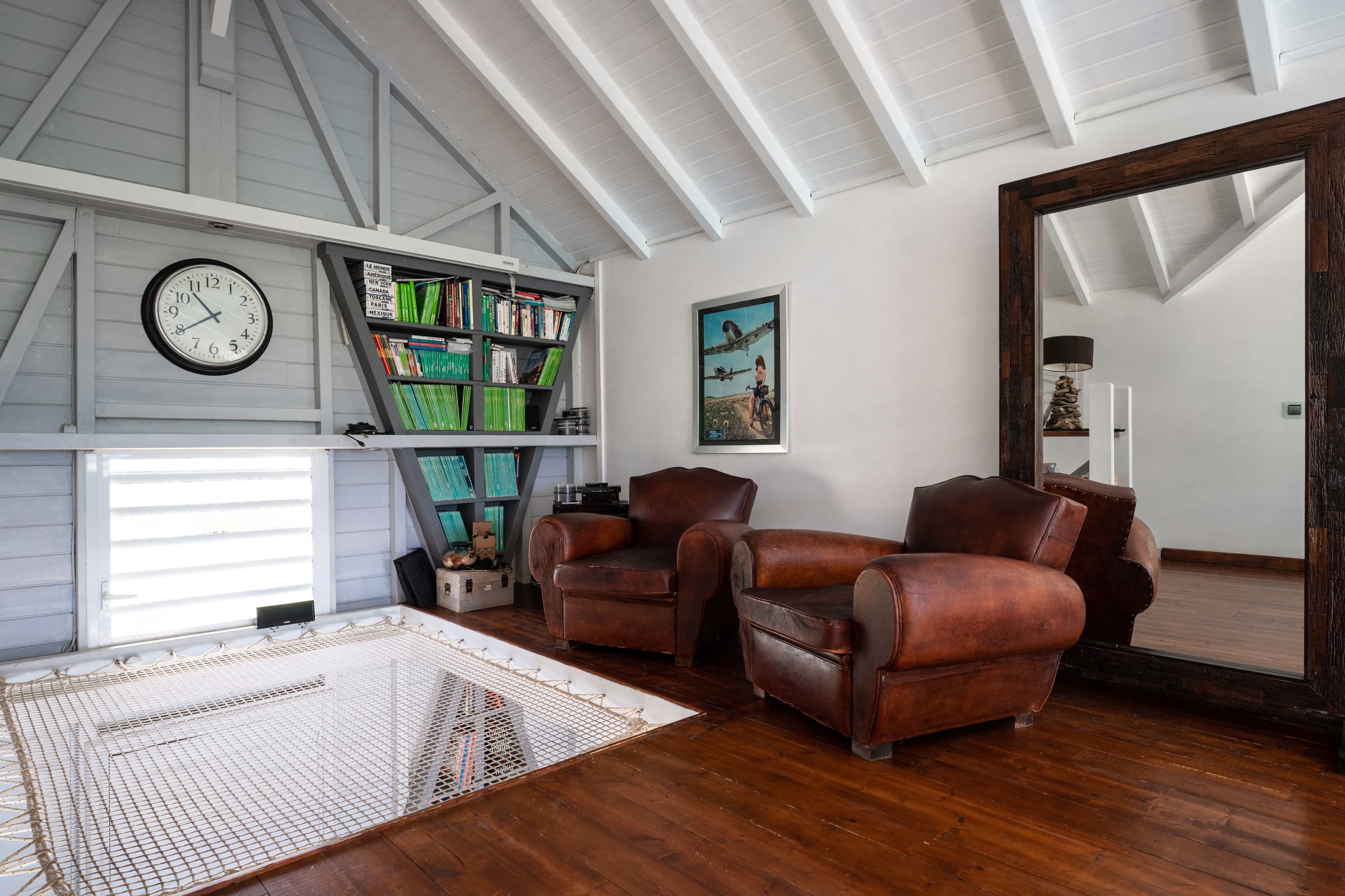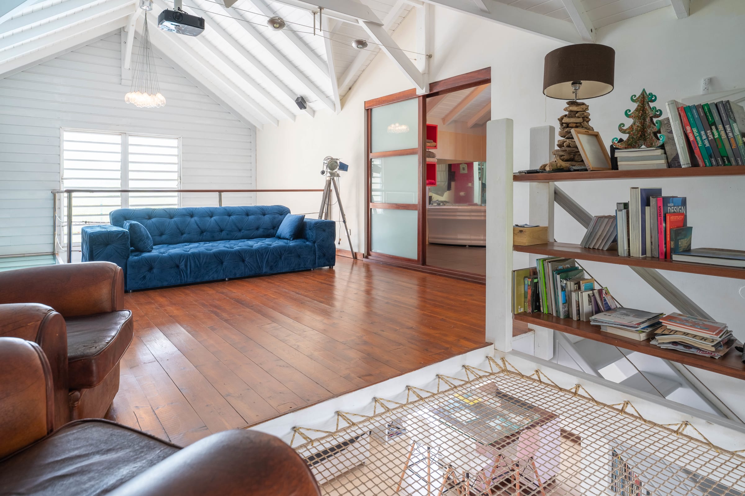 A large lounge area upstairs with exotic wood floors and a library.