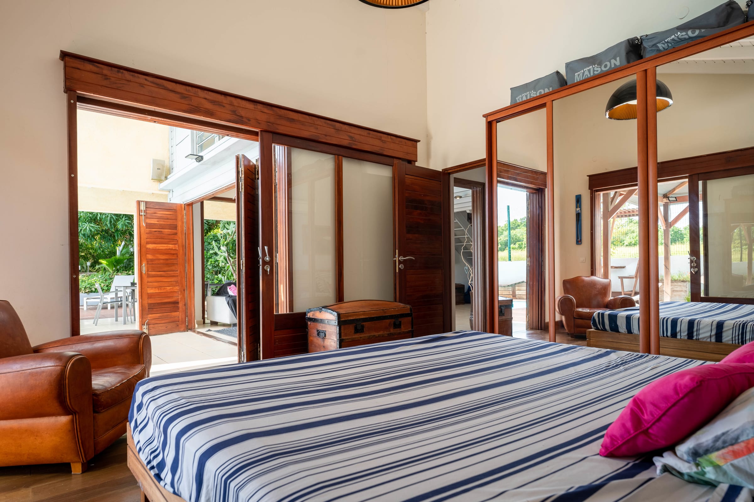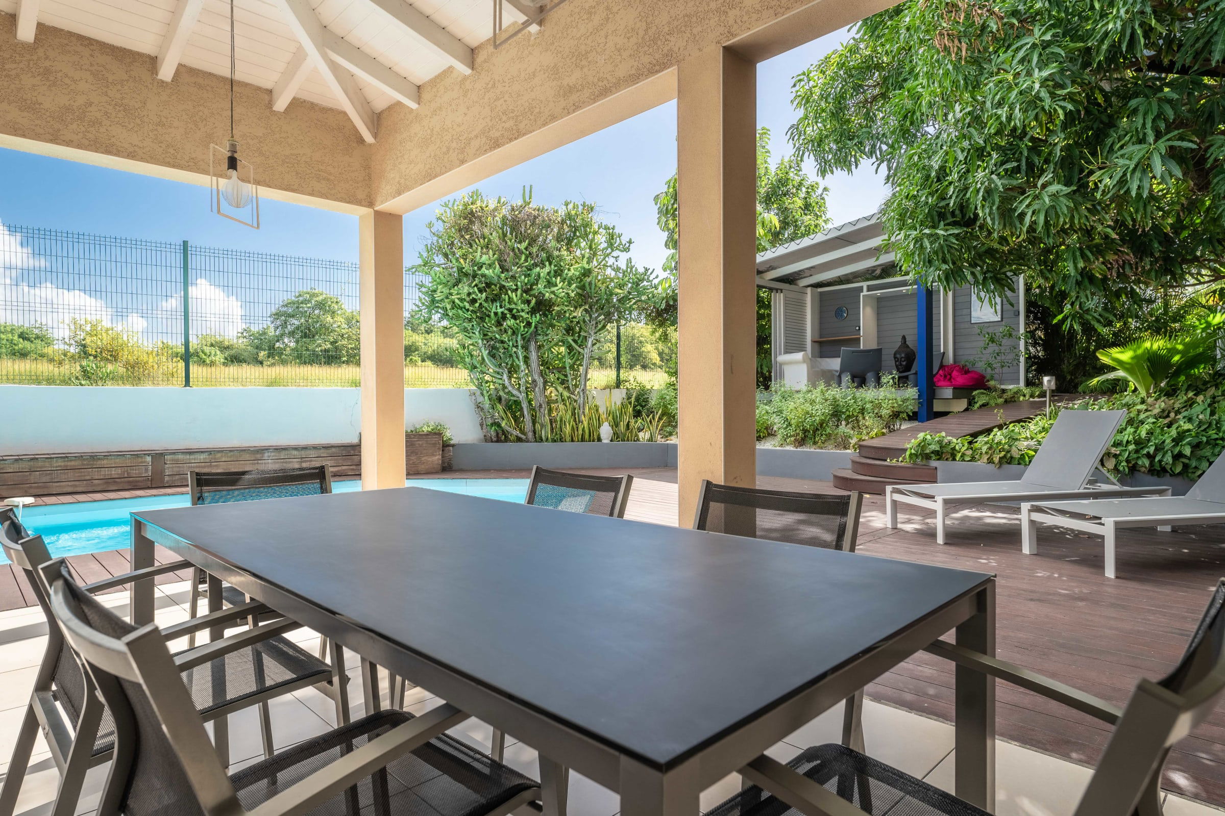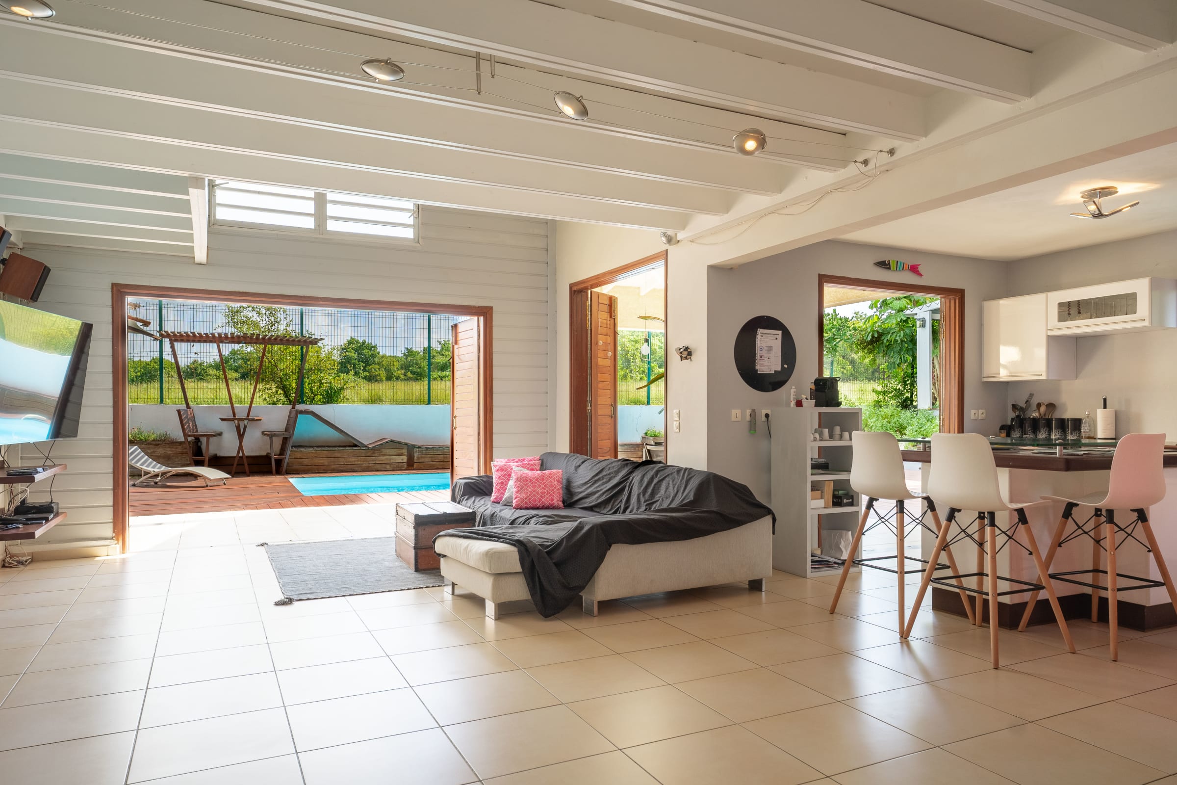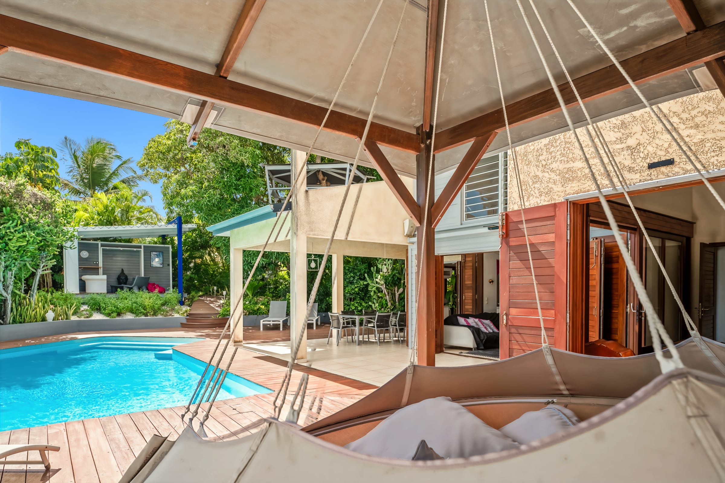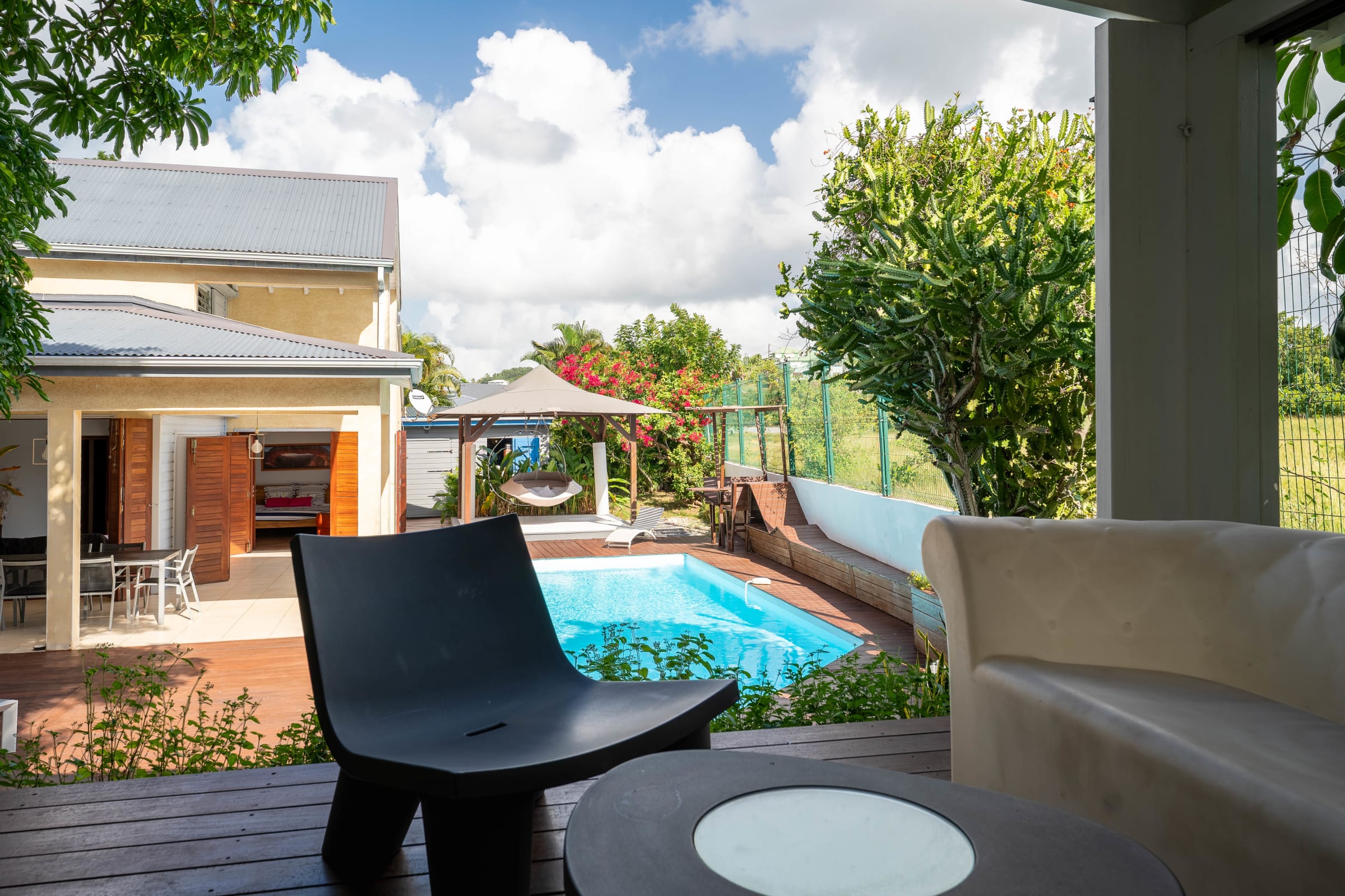 -on the ground floor, a living room opening onto the exotic wood deck surrounding the pool. A fully equipped American kitchen. 2 bedrooms furnished with queen size beds share a shower room and a separate toilet.