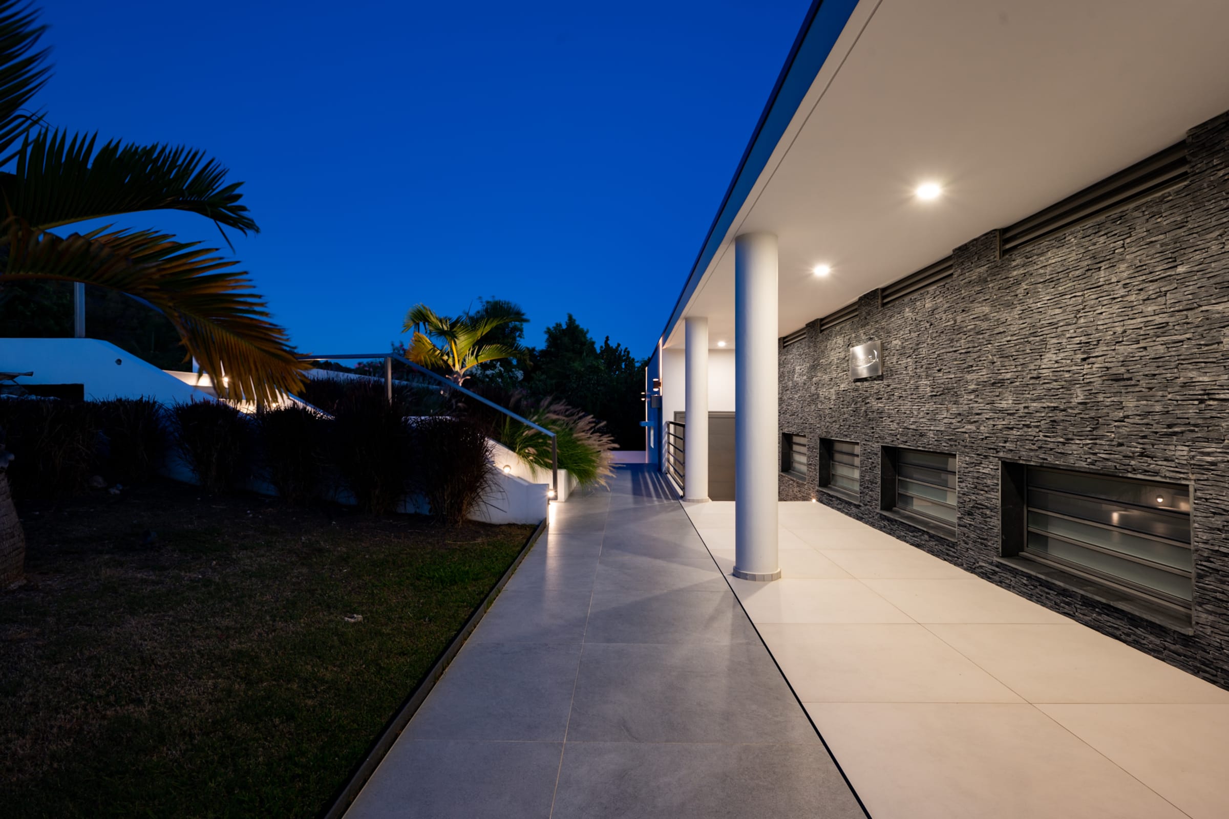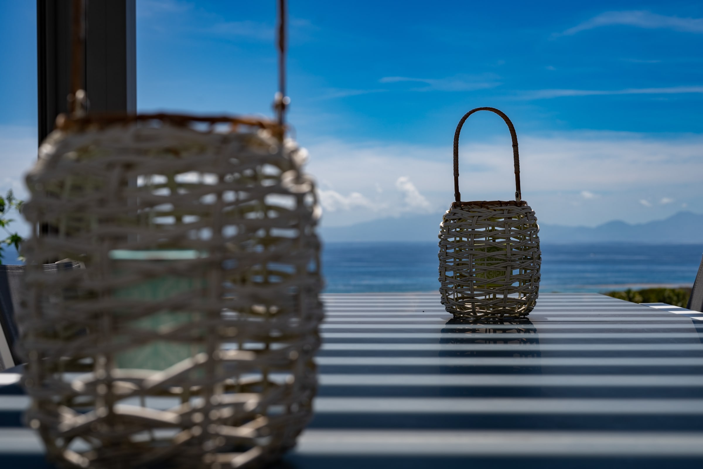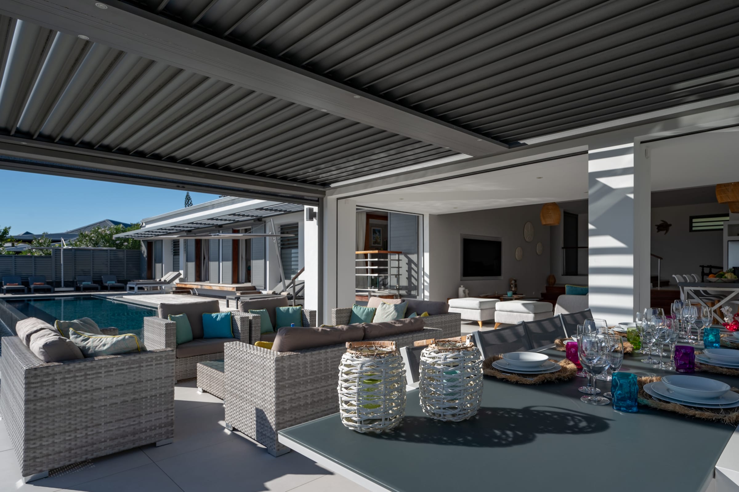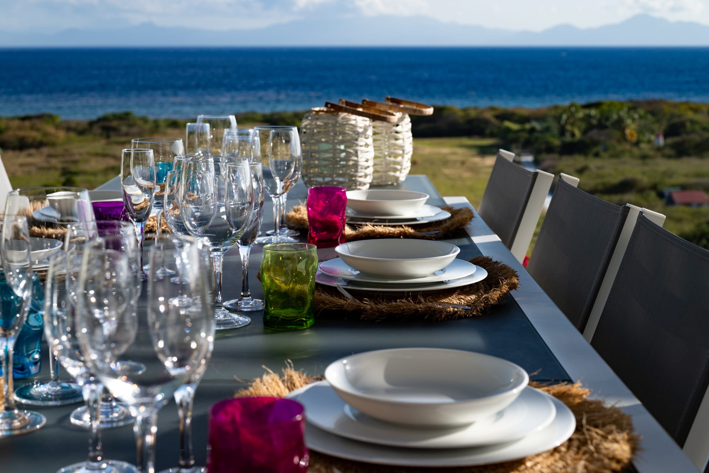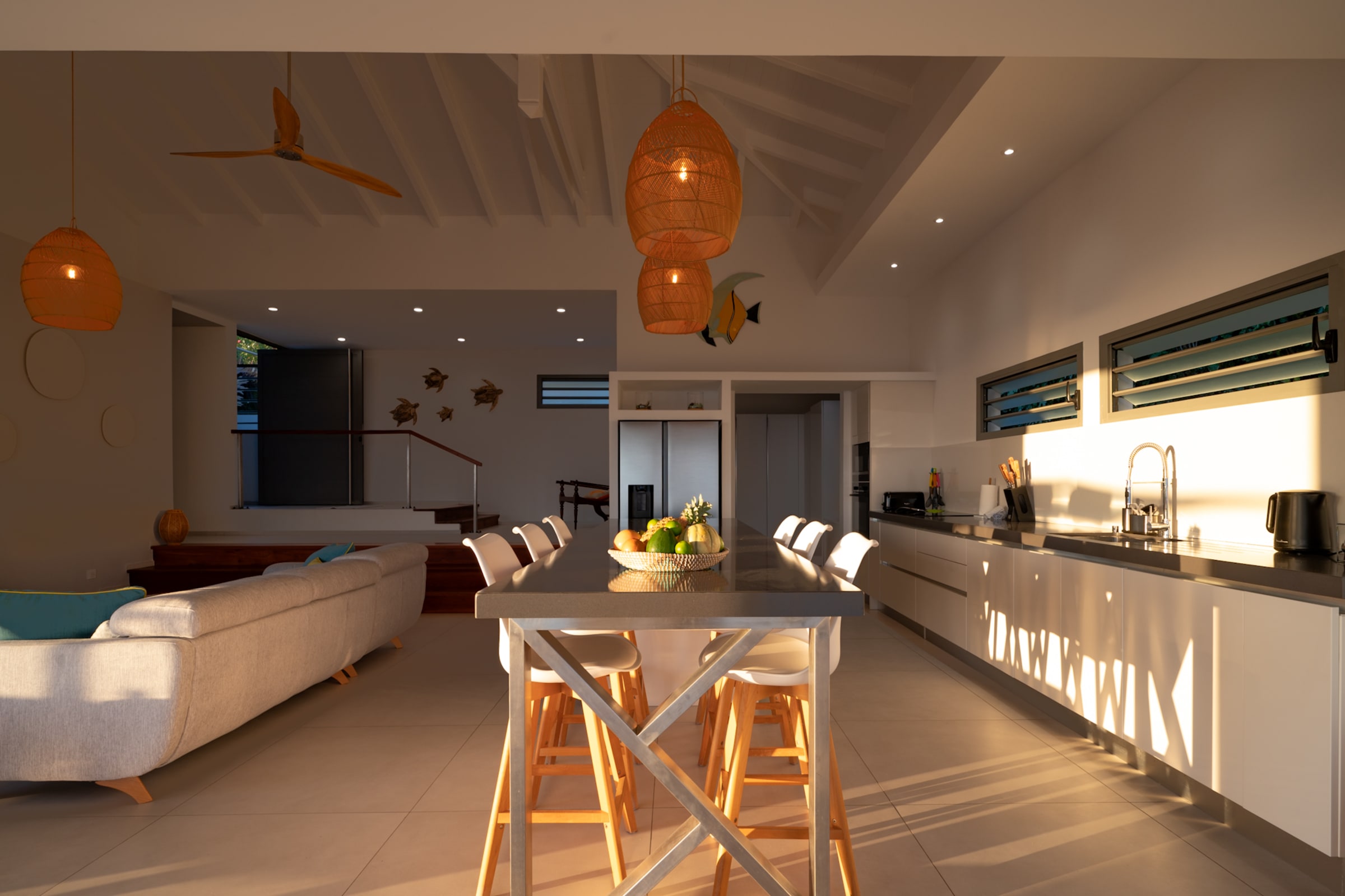 The fully equipped kitchen is perfect for preparing meals to enjoy around the central island or at the dining table, which comfortably seats up to twelve guests under the covered terrace.