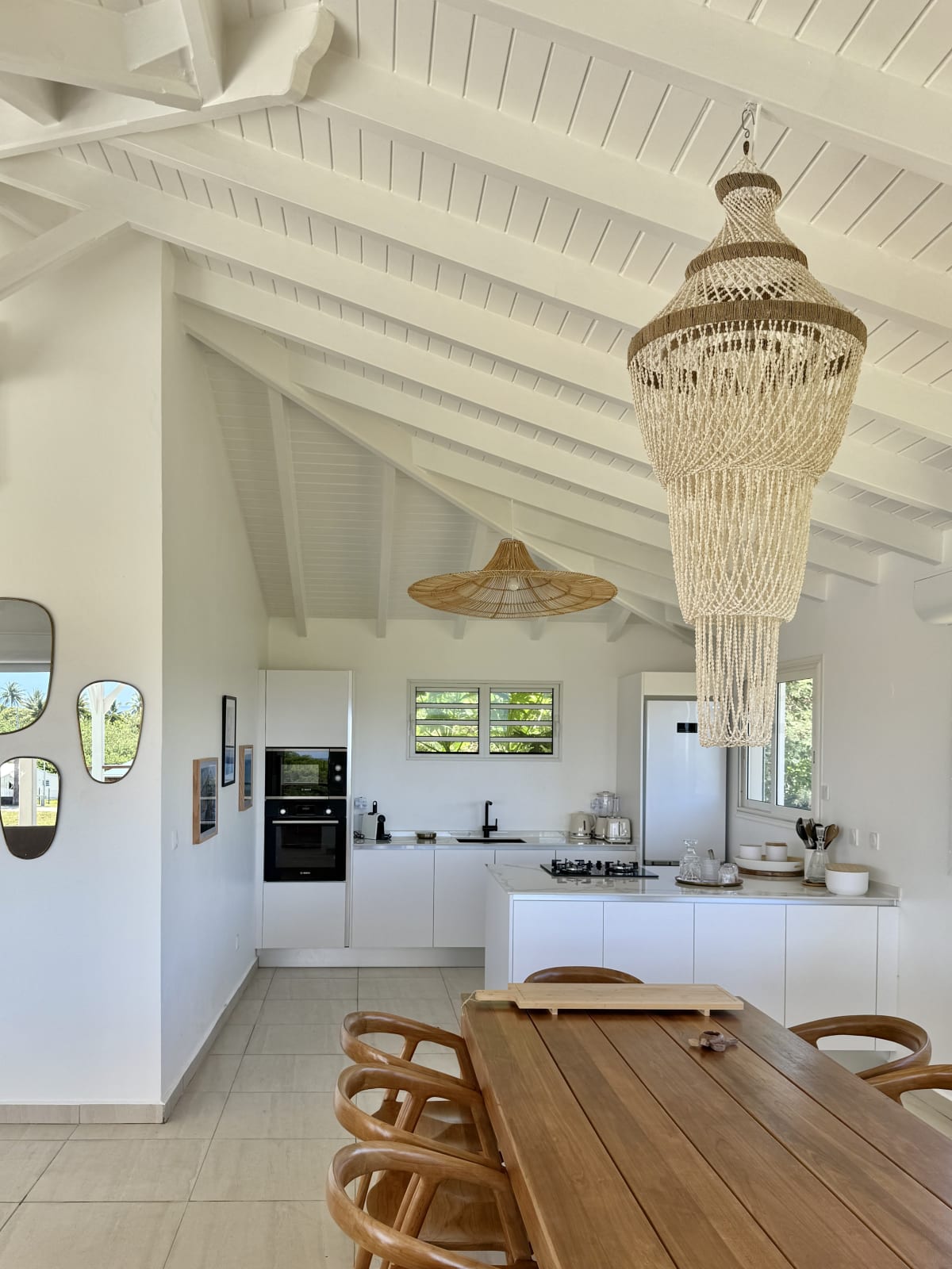The main living area, bathed in natural light, opens onto a stunning terrace with a breathtaking coastal view. Relax by your private pool, take a dip in the turquoise water, and soak up the Caribbean sun.