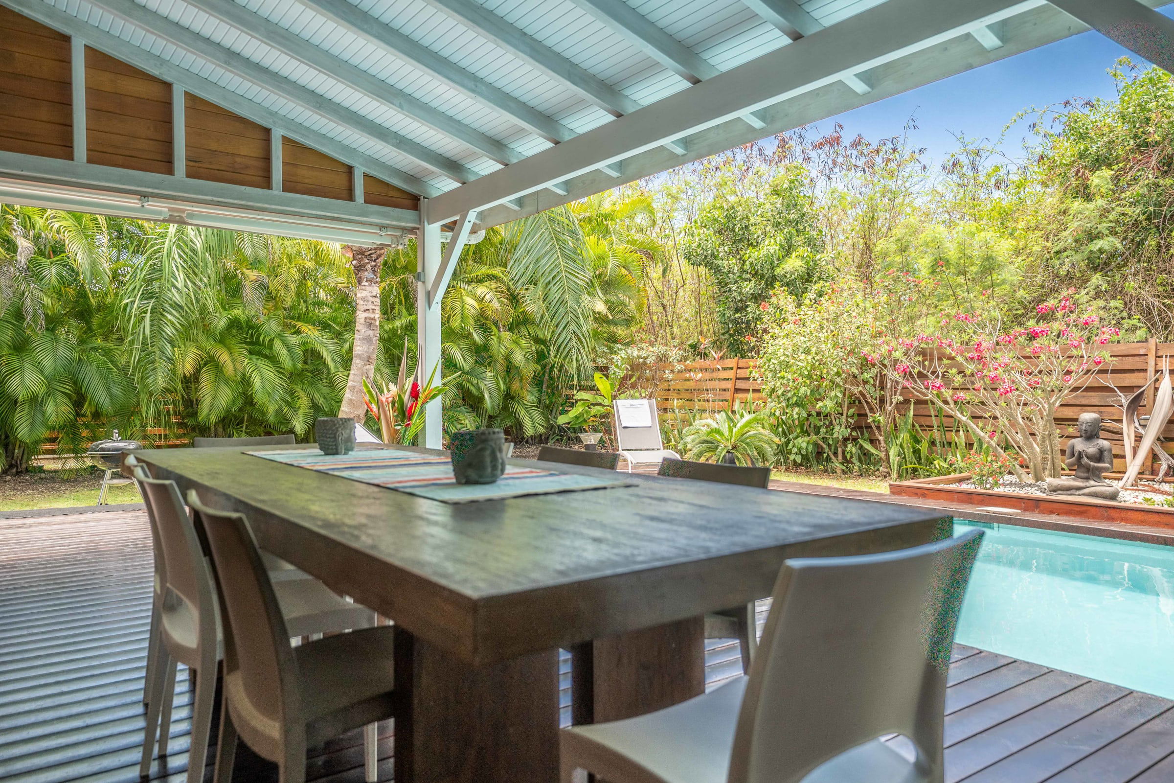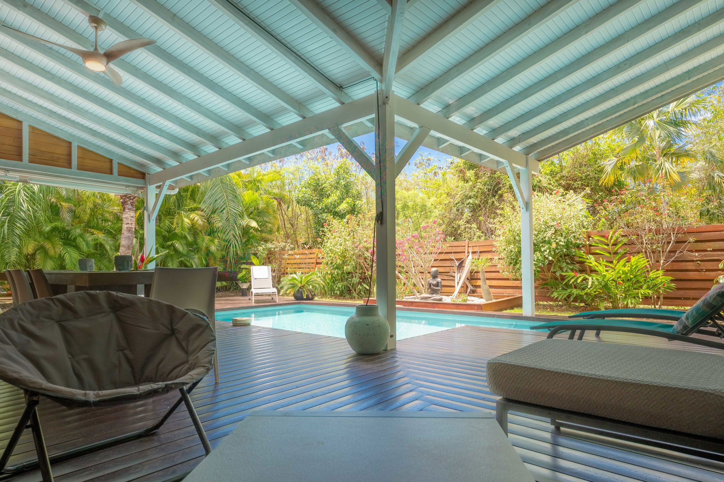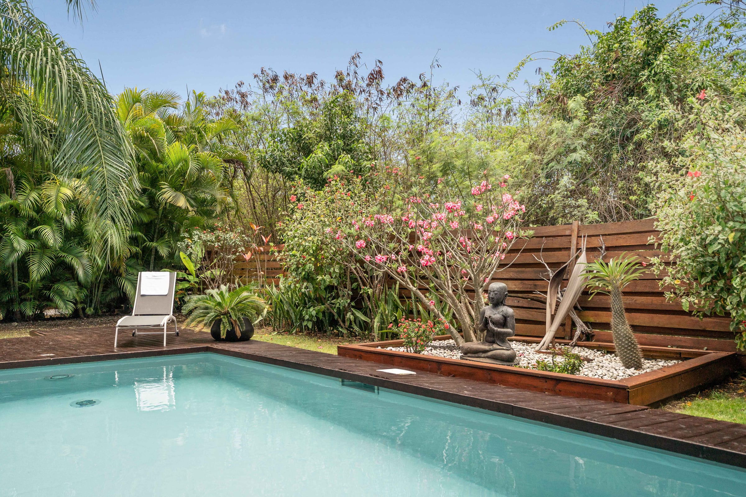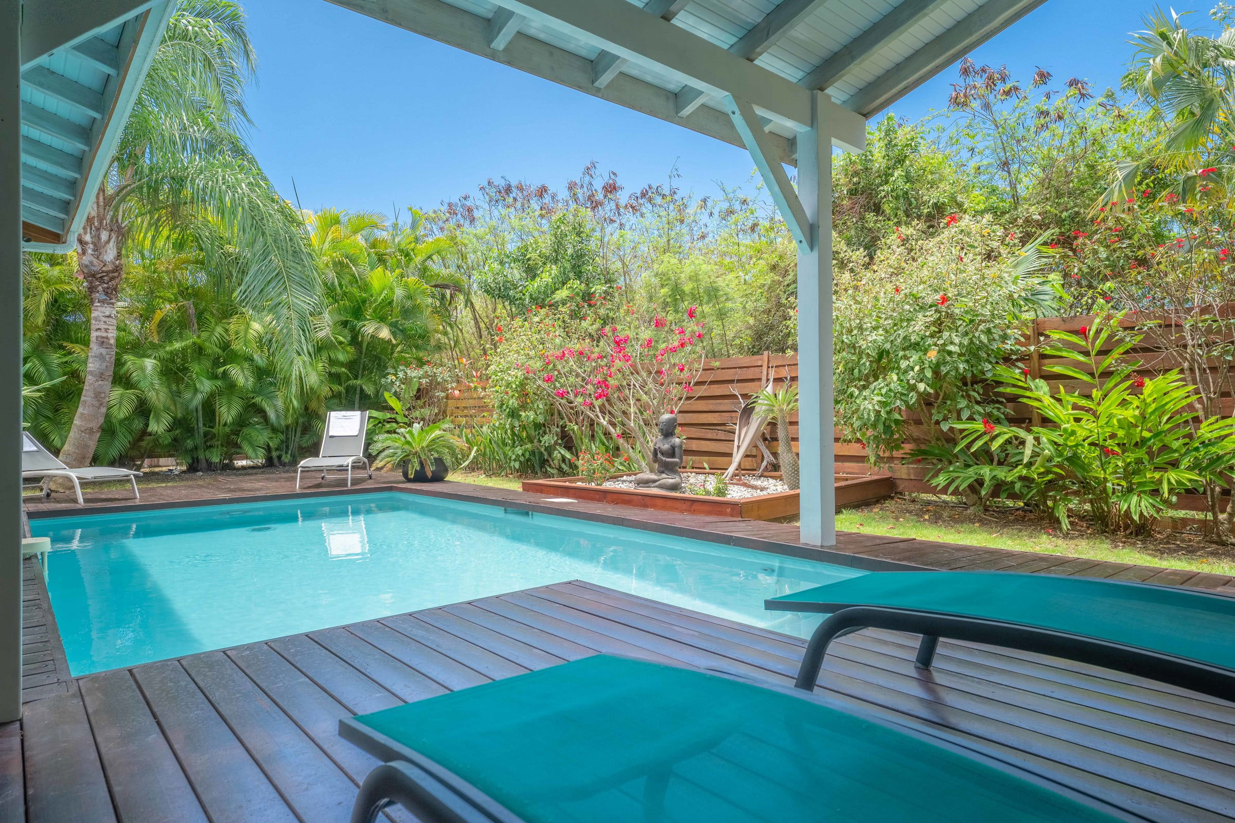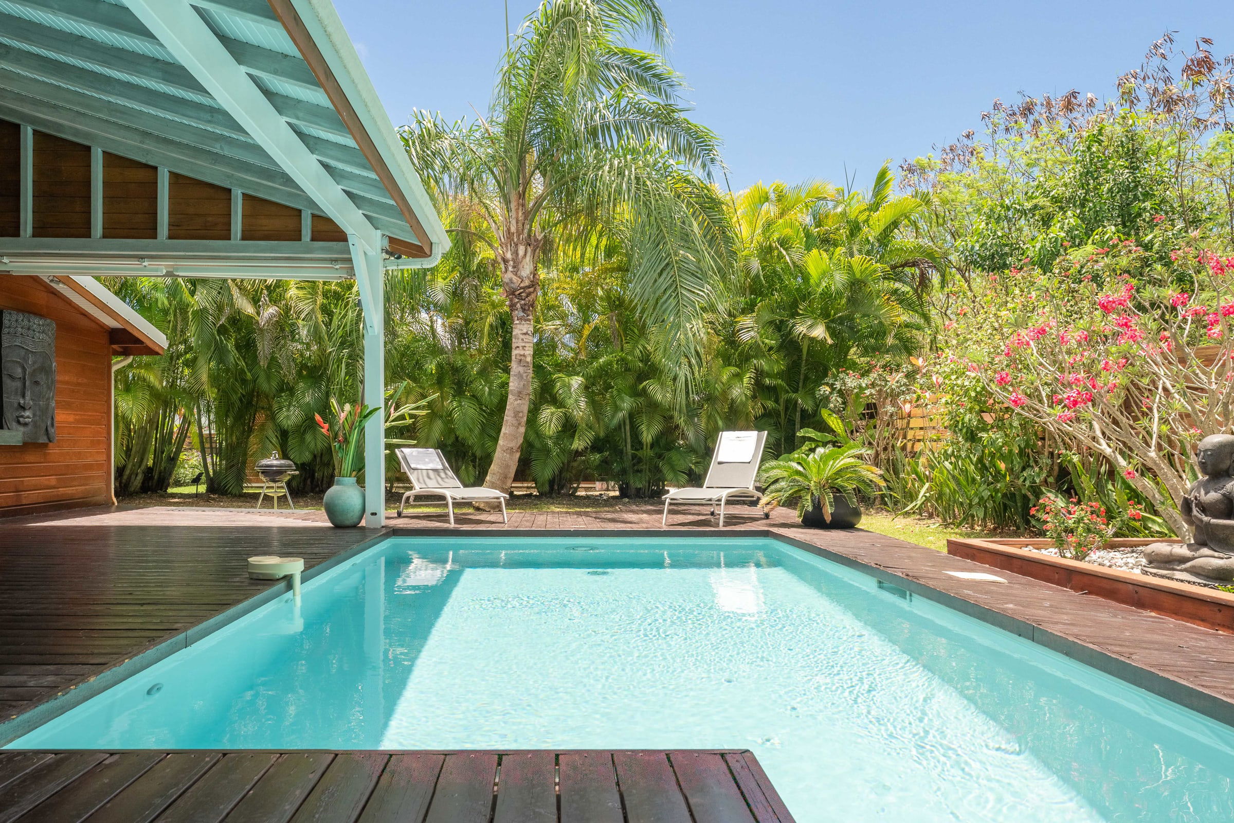 The villa Bouddha 1 is resolutely Creole with Balinese inspirations. Intimate, the living and sleeping areas are turned towards the beautiful covered and ventilated terrace and the pool. A perfectly equipped American kitchen with a large flat pass opening on the terrace, and a bar on the small audio visual living room. Two large air-conditioned bedrooms furnished with taste. Bed in 160 for one and Queen size for the other. They have both, their beautiful Italian shower room, with private toilets,