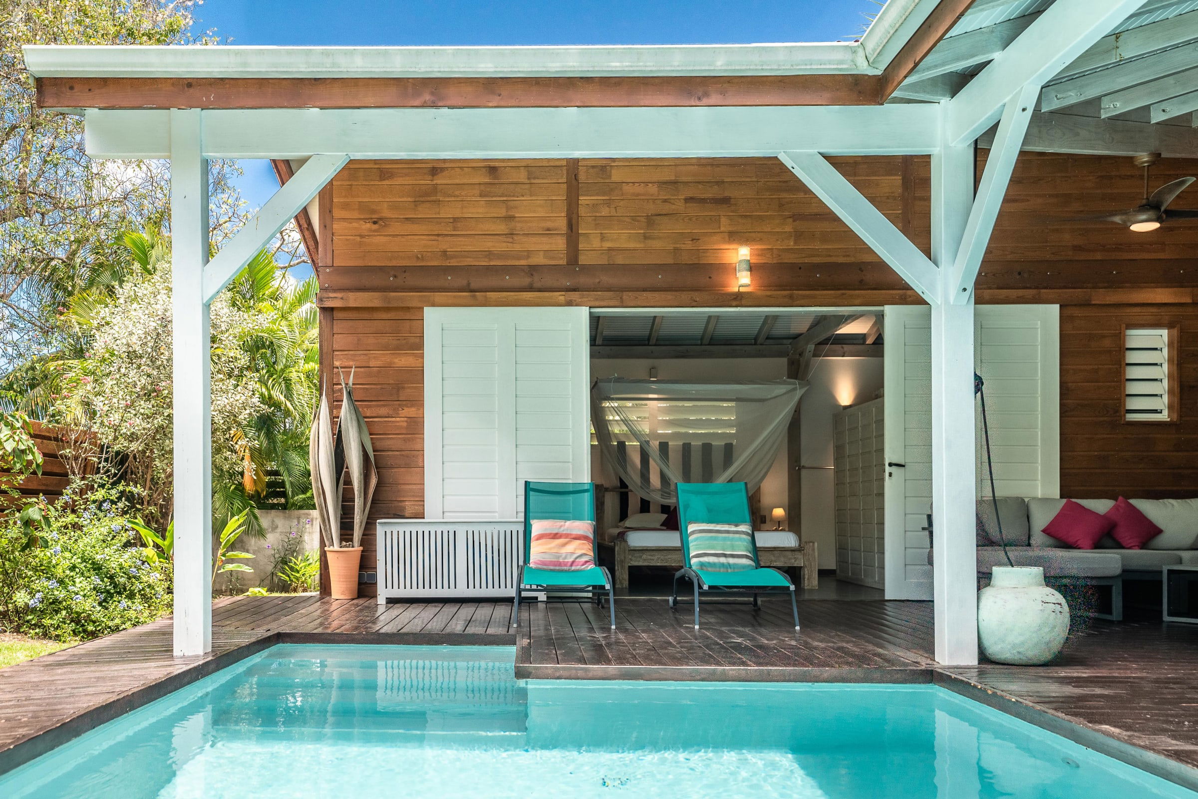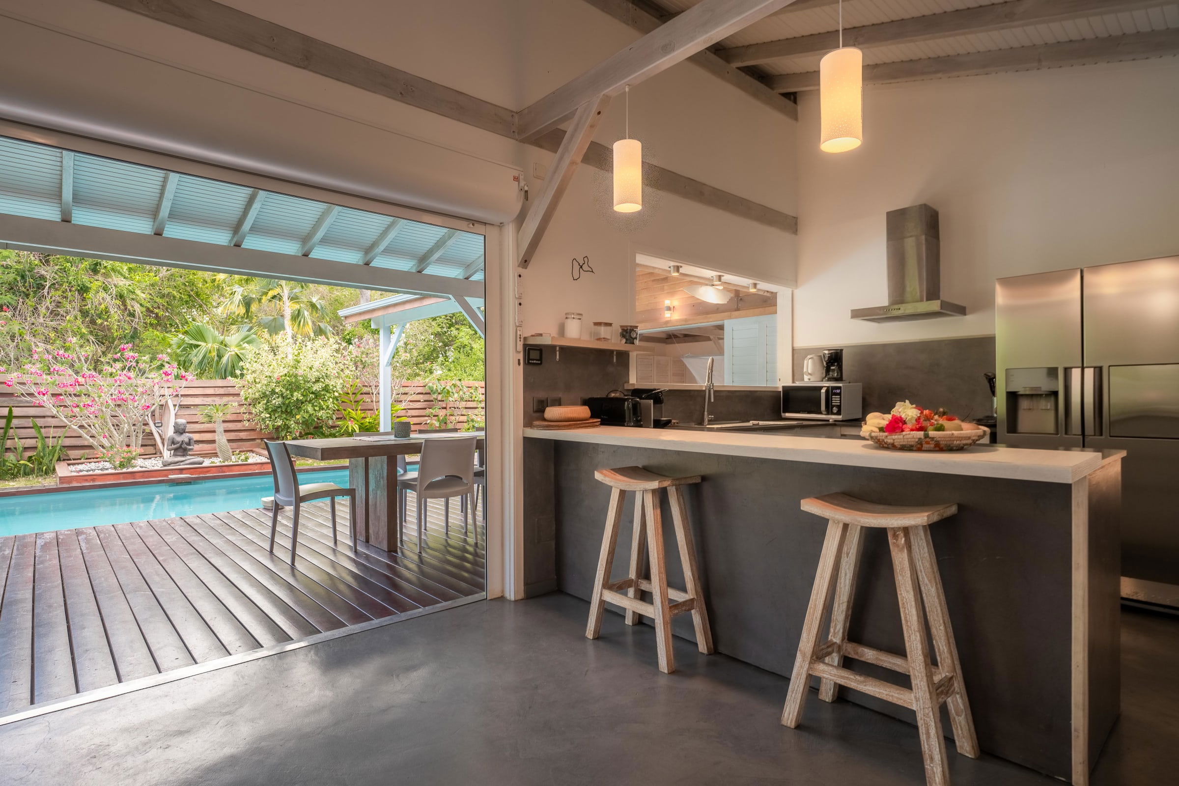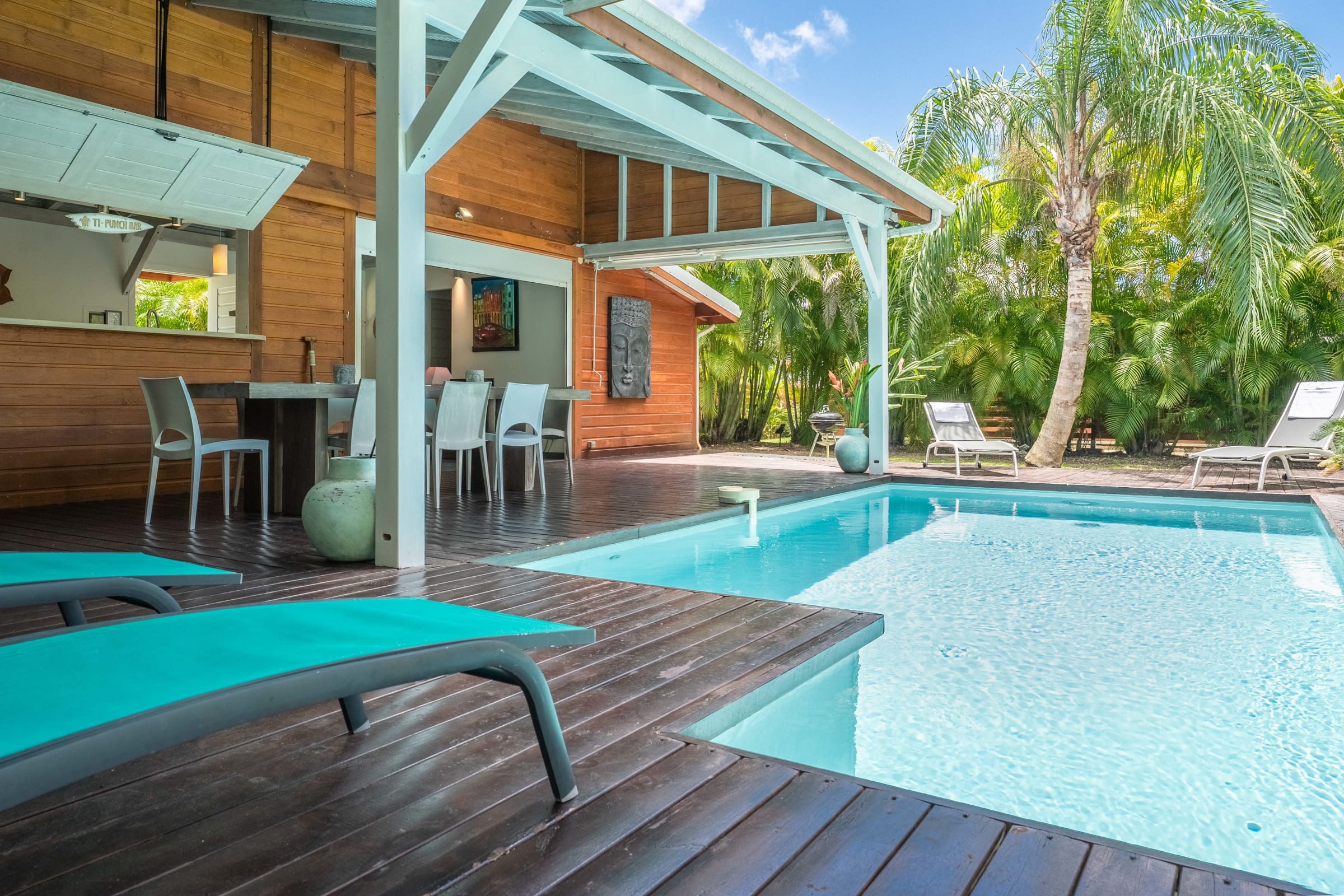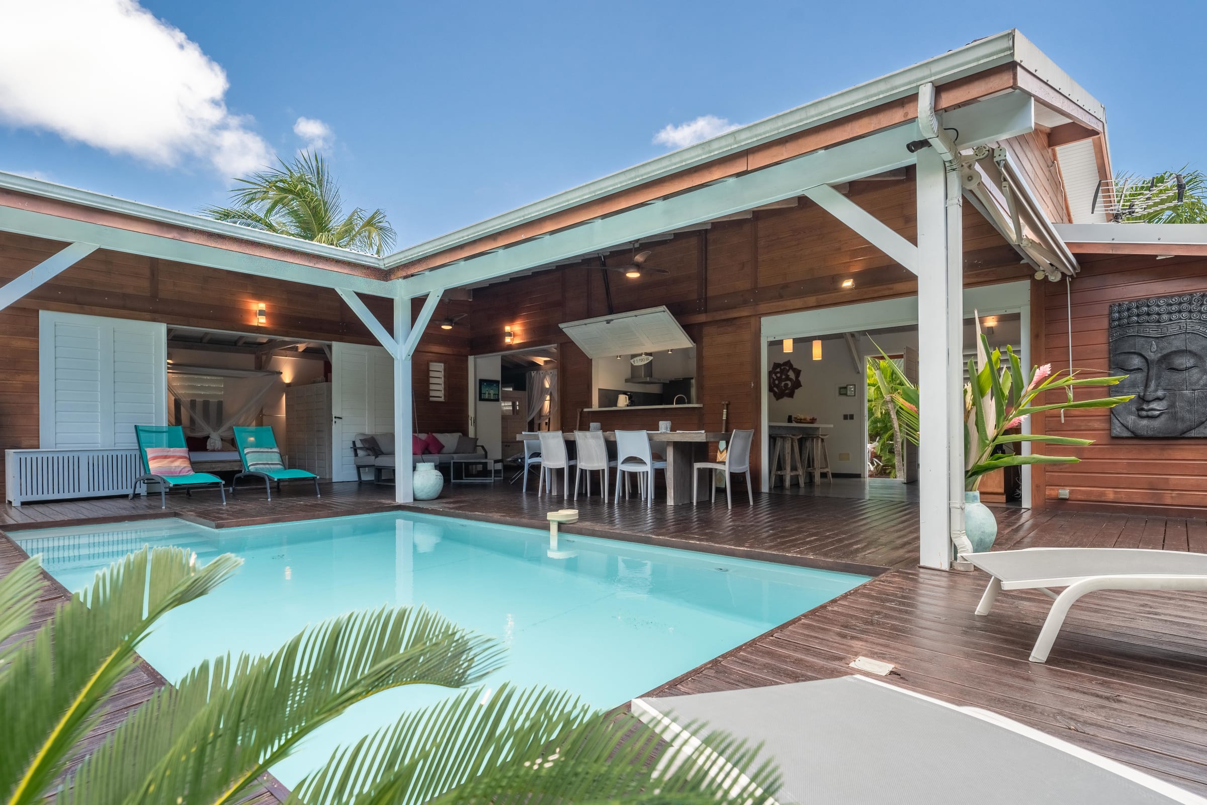 The villa Bouddha 1 is resolutely Creole with Balinese inspirations. Intimate, the living and sleeping areas are turned towards the beautiful covered and ventilated terrace and the pool. A perfectly equipped American kitchen with a large flat pass opening on the terrace, and a bar on the small audio visual living room. Two large air-conditioned bedrooms furnished with taste. Bed in 160 for one and Queen size for the other. They have both, their beautiful Italian shower room, with private toilets,