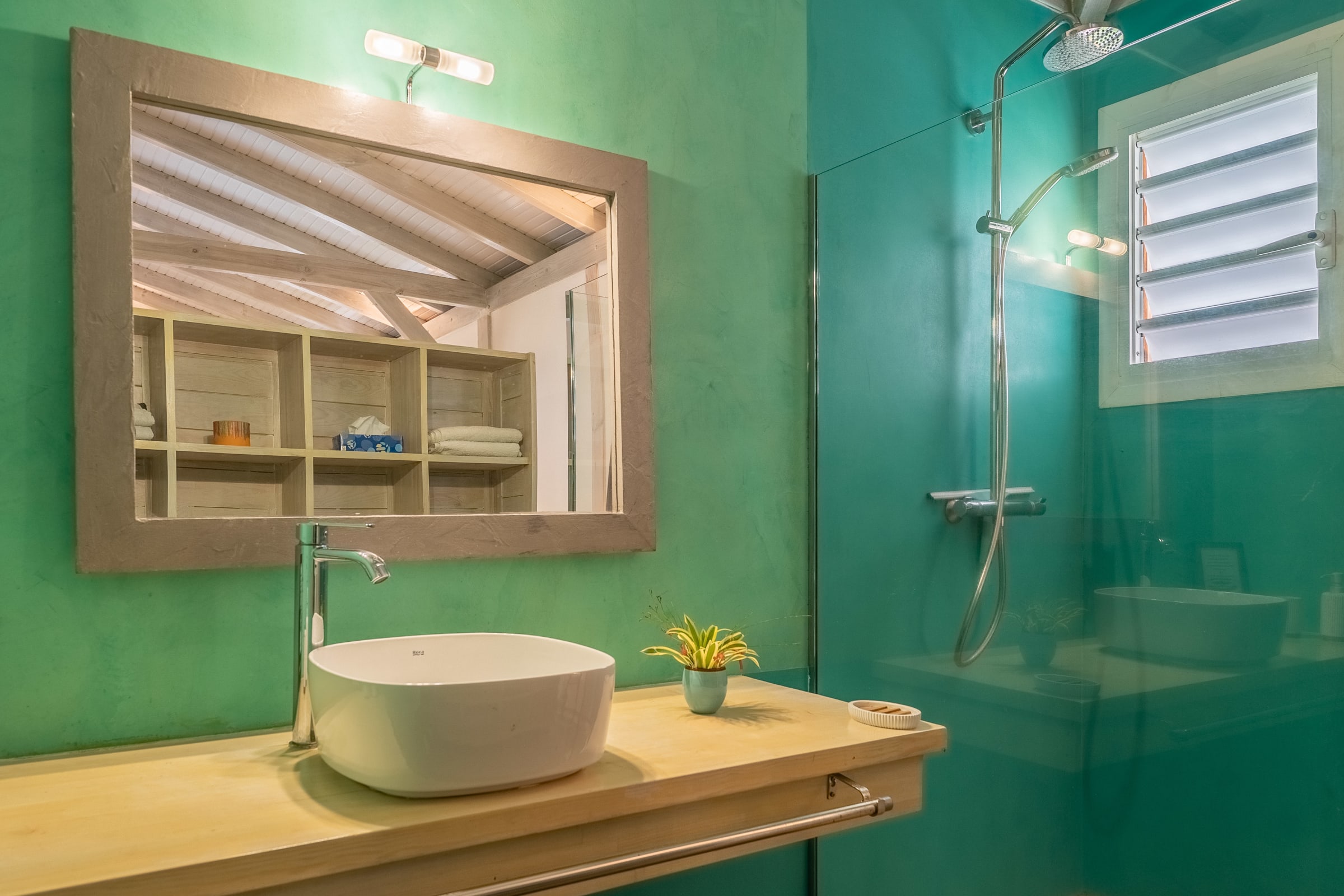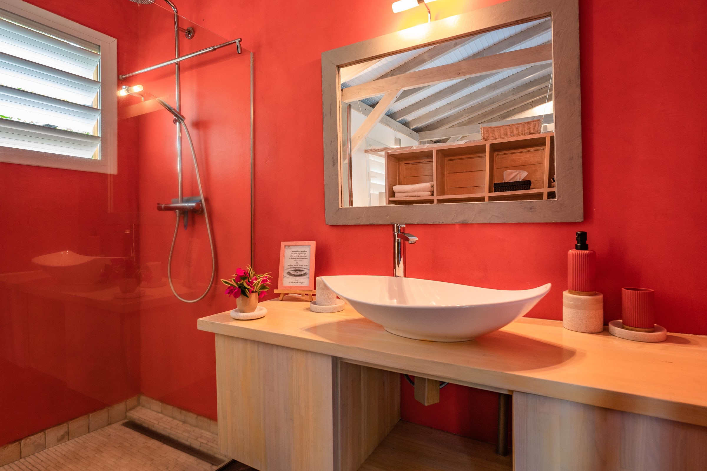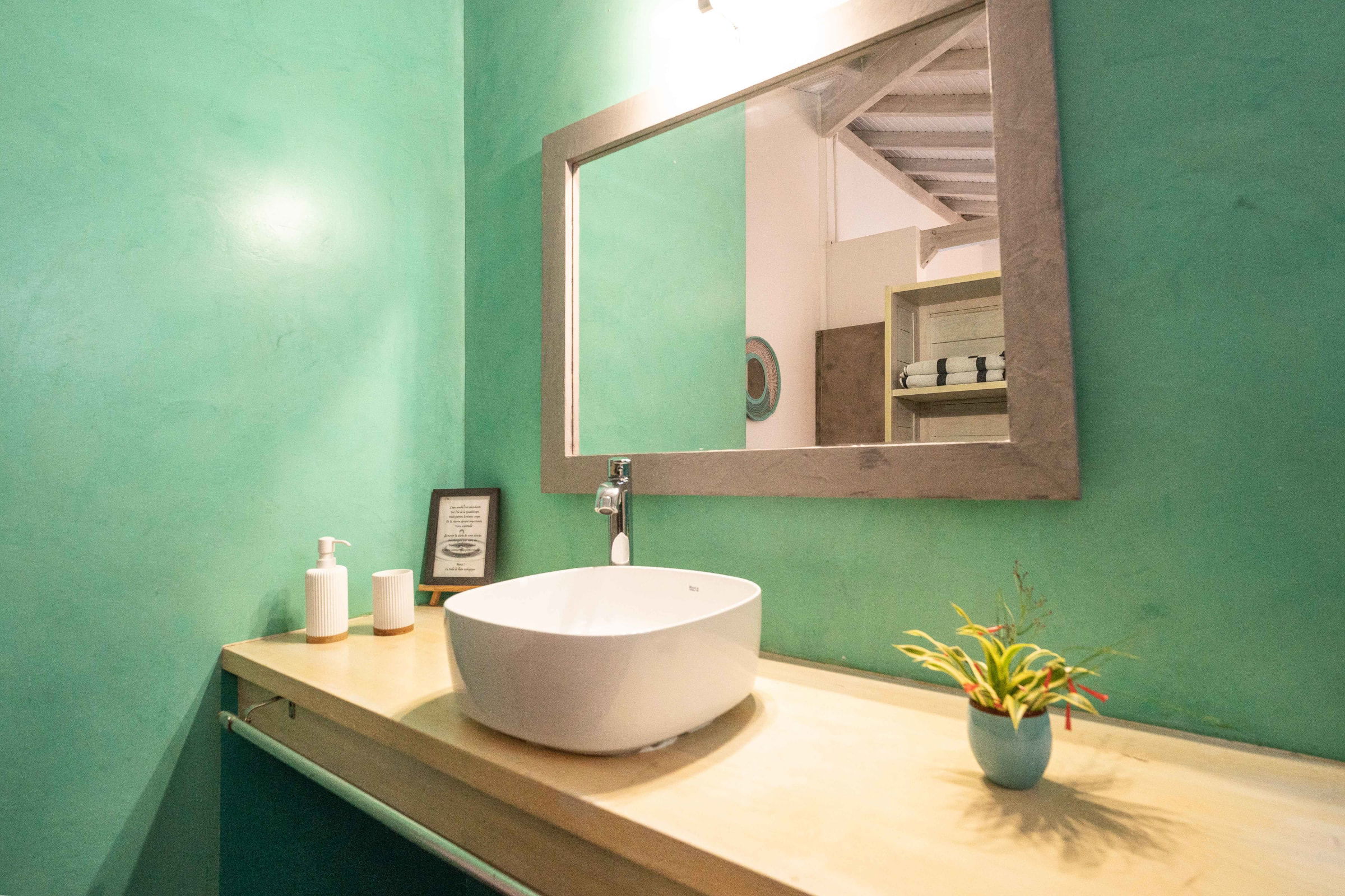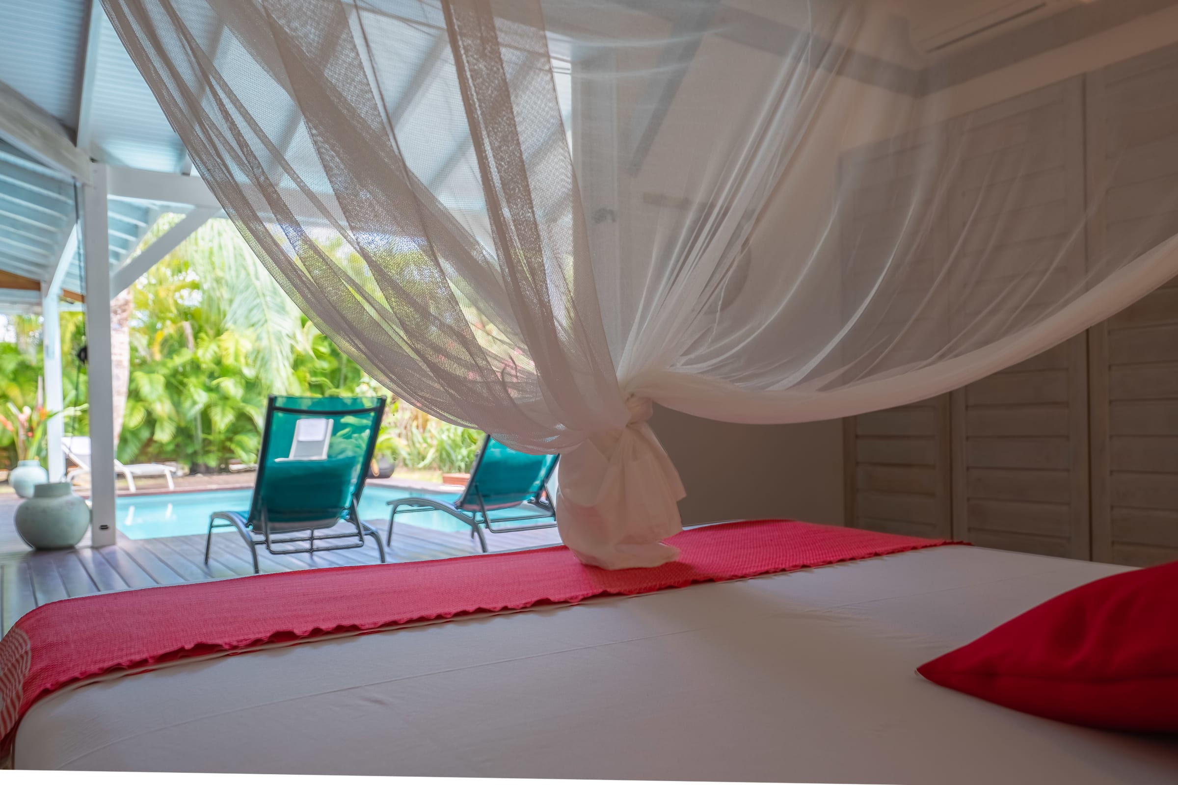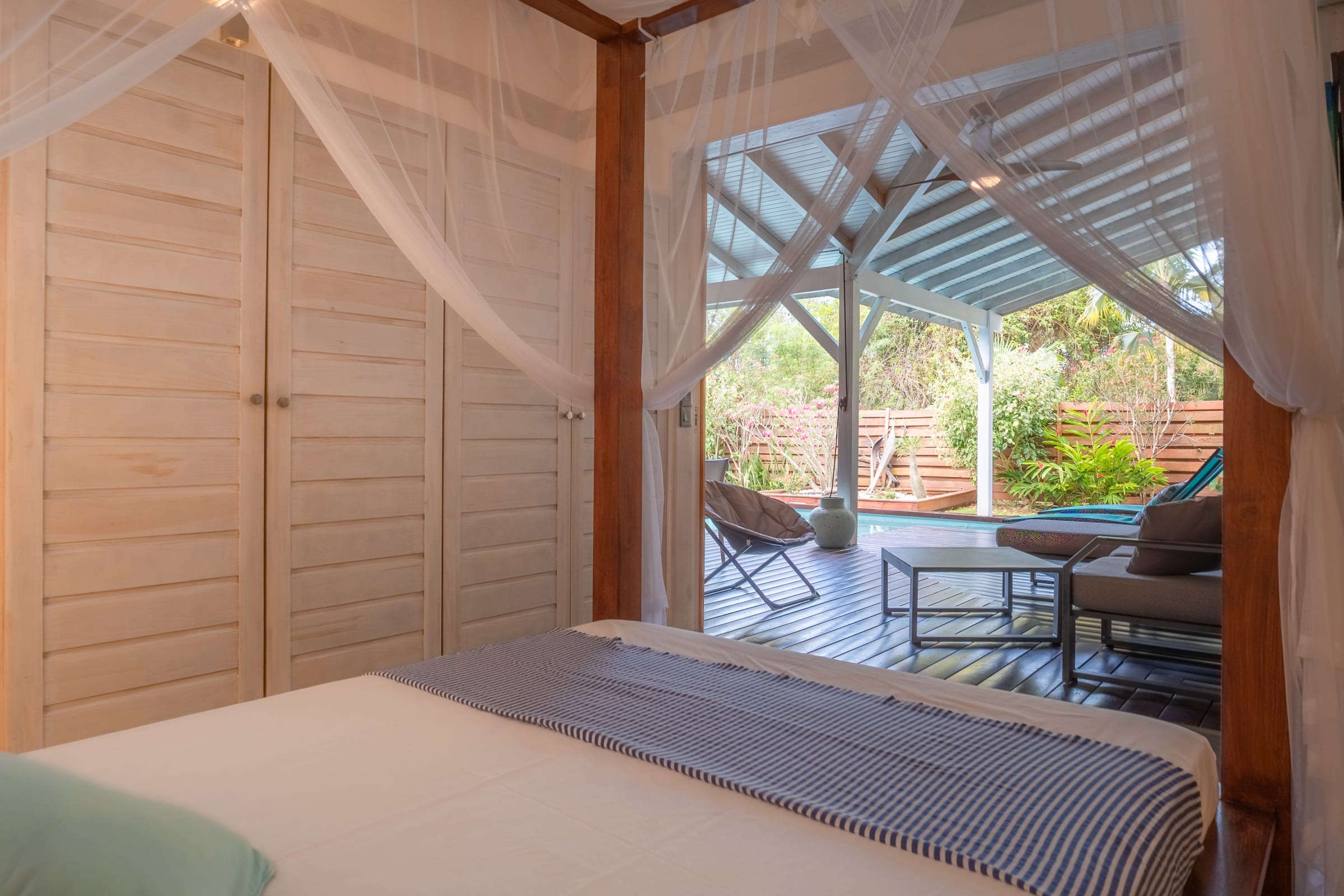 The villa Bouddha 1 is resolutely Creole with Balinese inspirations. Intimate, the living and sleeping areas are turned towards the beautiful covered and ventilated terrace and the pool. A perfectly equipped American kitchen with a large flat pass opening on the terrace, and a bar on the small audio visual living room. Two large air-conditioned bedrooms furnished with taste. Bed in 160 for one and Queen size for the other. They have both, their beautiful Italian shower room, with private toilets,