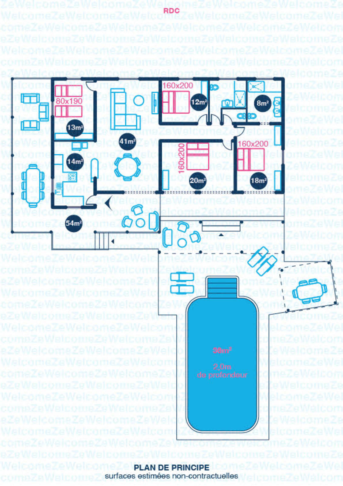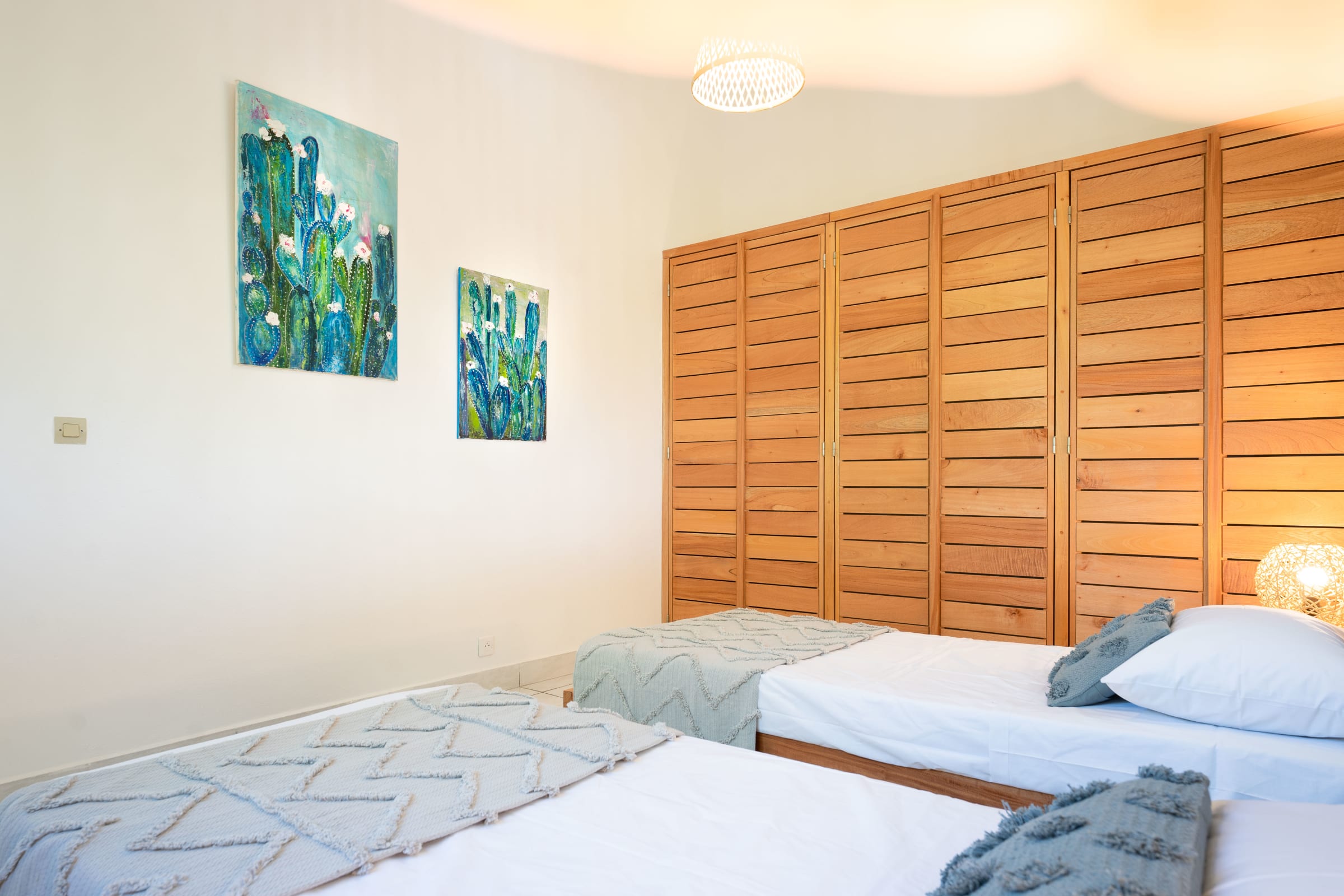 4 air-conditioned bedrooms, 3 of which are furnished with 160cm beds and 1 with 2 90cm beds, 2 shower rooms. 3 toilets.
