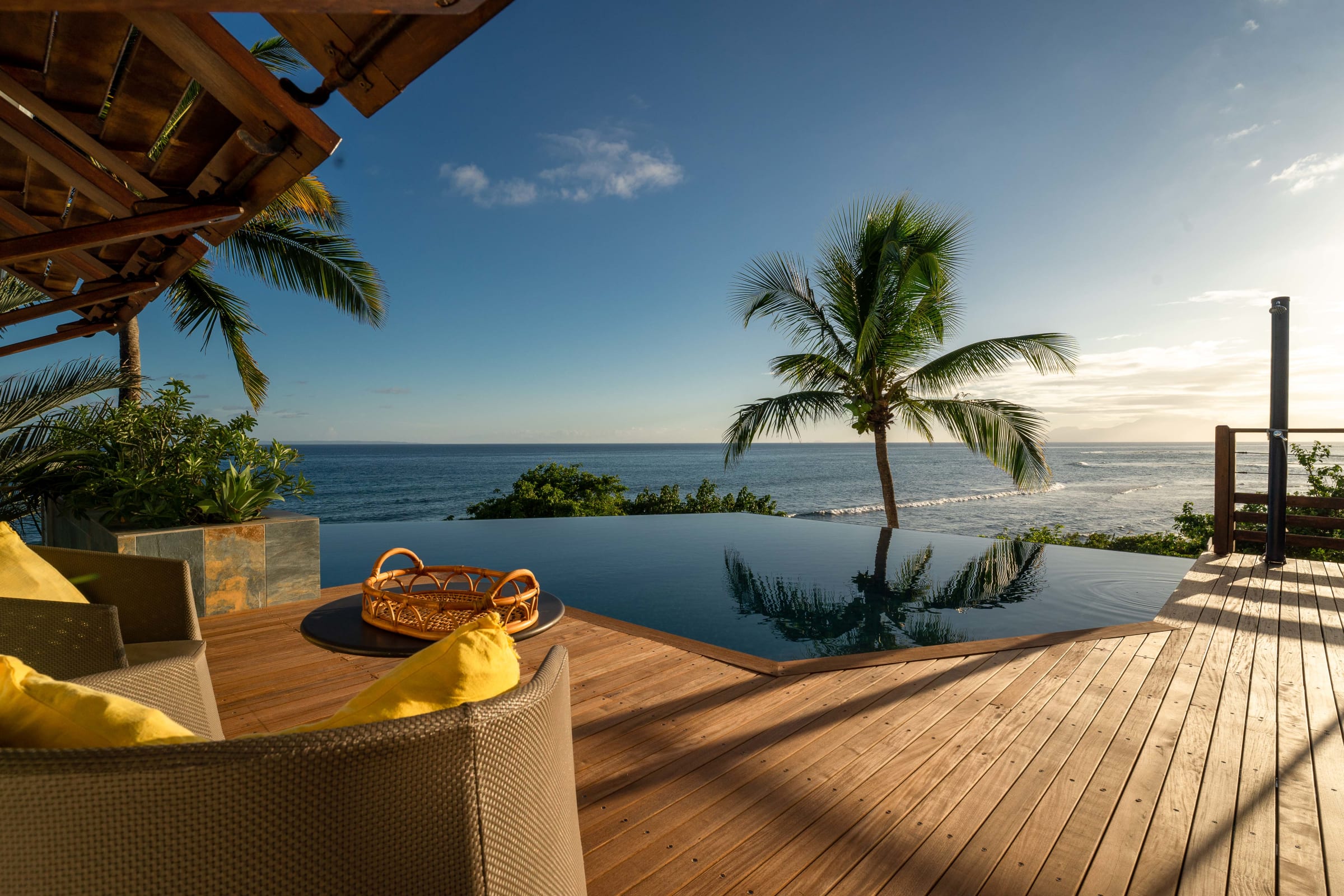 A large Deck with a 40m2 salt water infinity pool, an outdoor lounge under a beautiful shaded terrace.