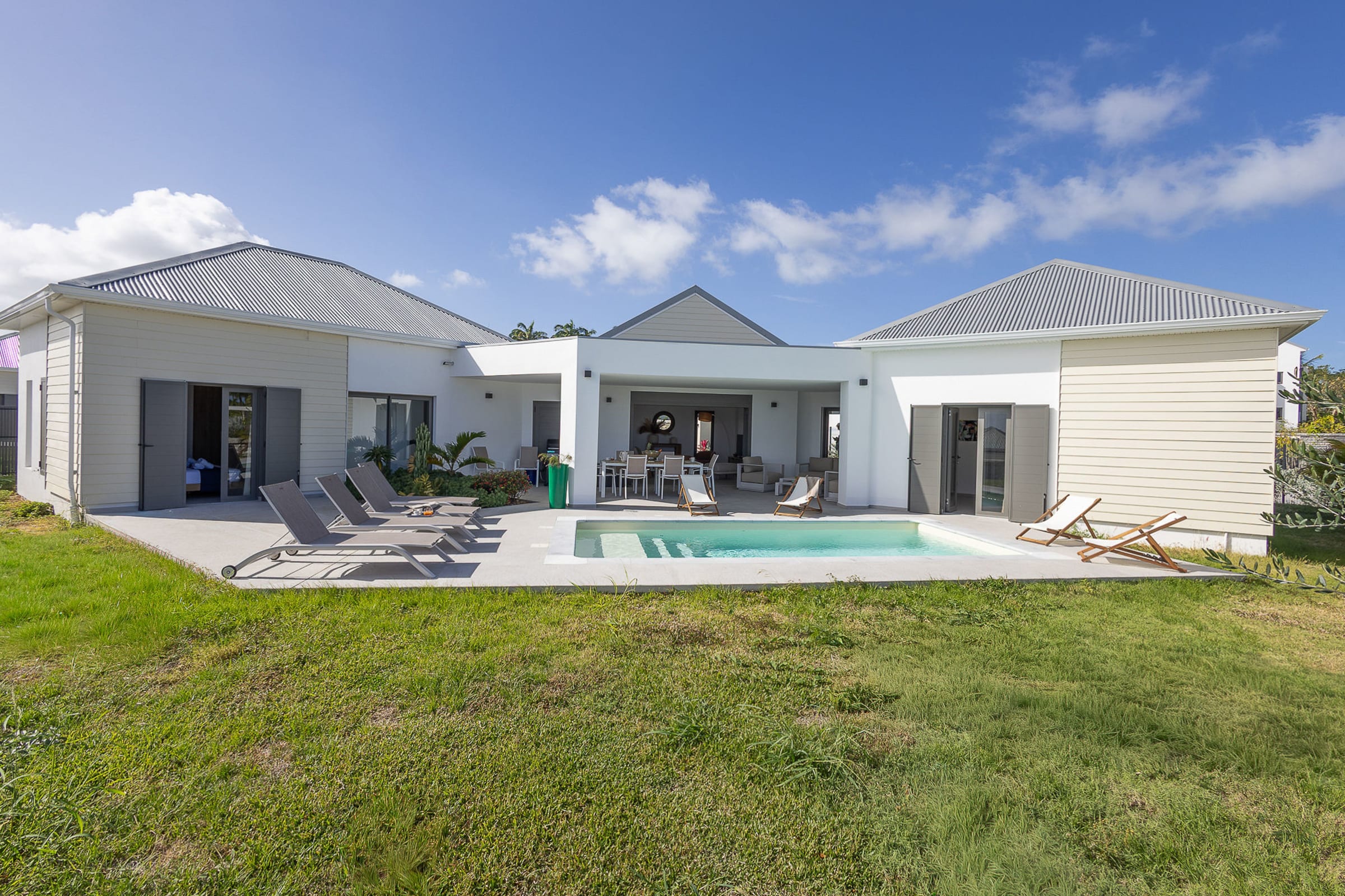 Welcome to Villa Akébé, an architectural gem nestled in the hills of Saint-François. This single-story, 5-star rated villa offers 162 m² of refined living space where luxury meets comfort. With its 4 elegant suites (3 with queen size 160cm beds, 1 with two simple 90x200 beds), you are guaranteed restful nights after days filled with discovery.