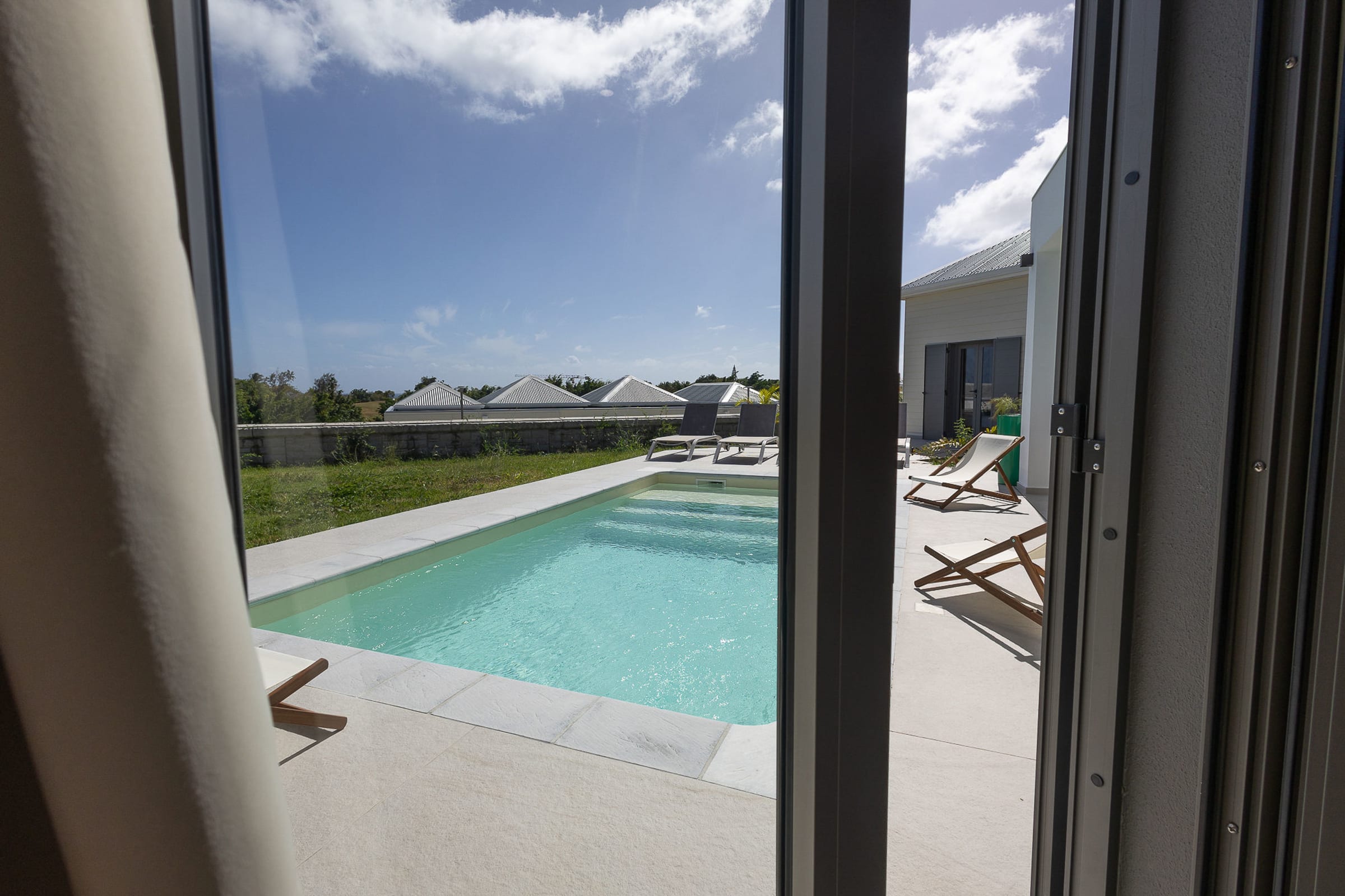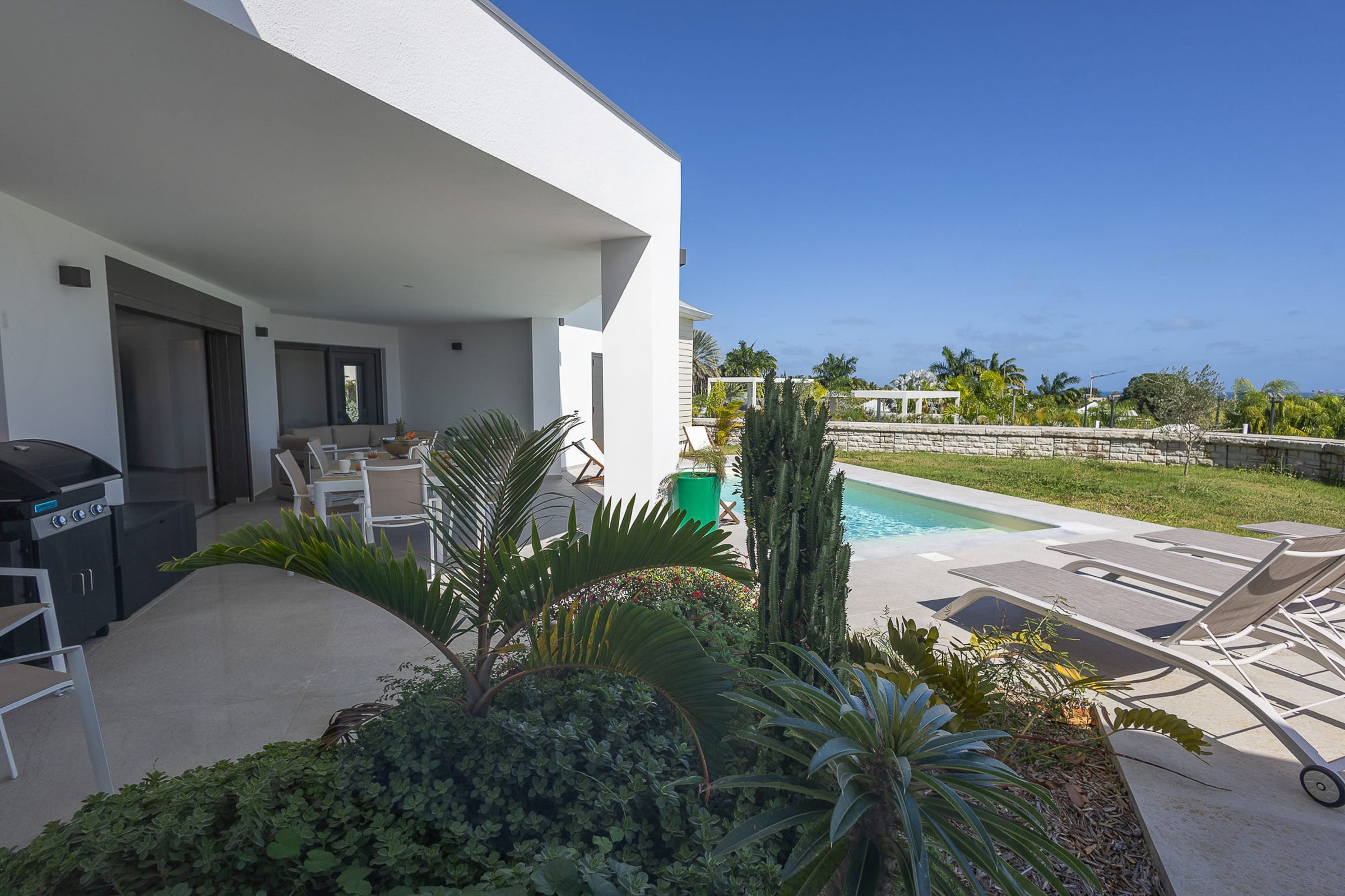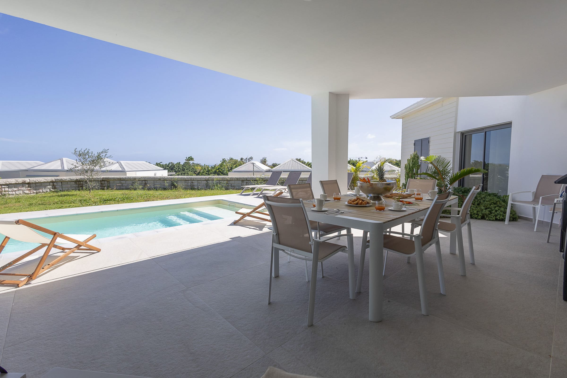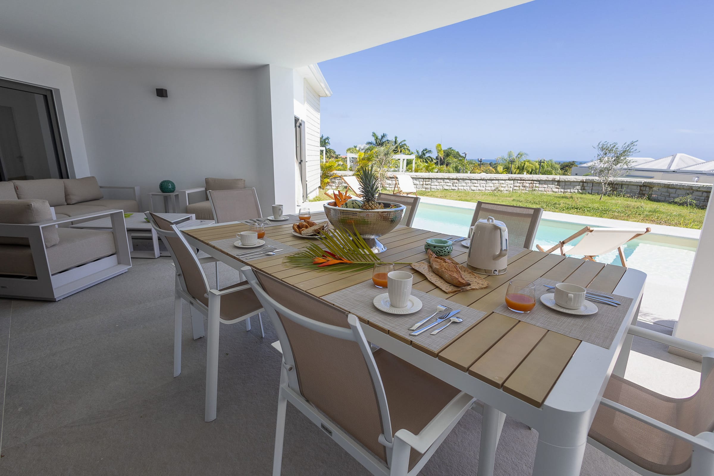 The 7x3 meter private swimming pool, surrounded by a relaxing lounge area, invites you to enjoy refreshing swims in complete privacy, while admiring the breathtaking view over the shimmering Caribbean Sea. Imagine yourself sipping a cocktail on the terrace while gazing at Petite Terre and Marie-Galante, under the gentle tropical breeze.
