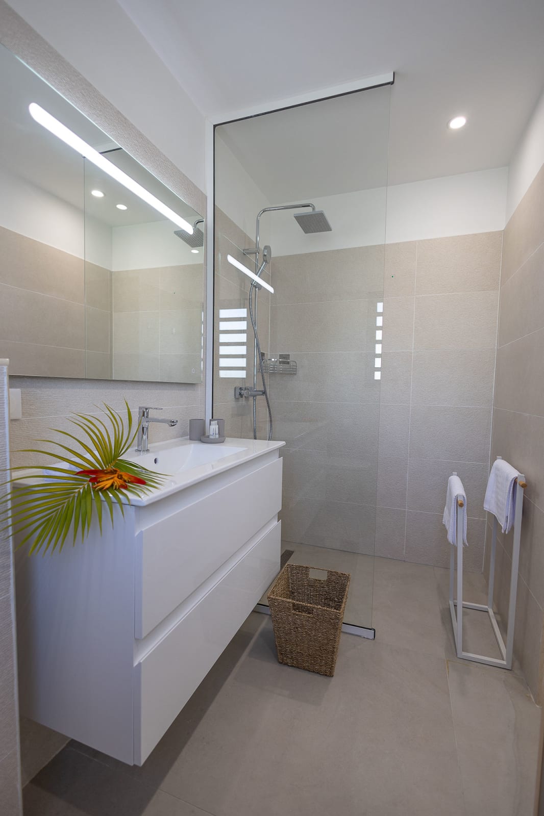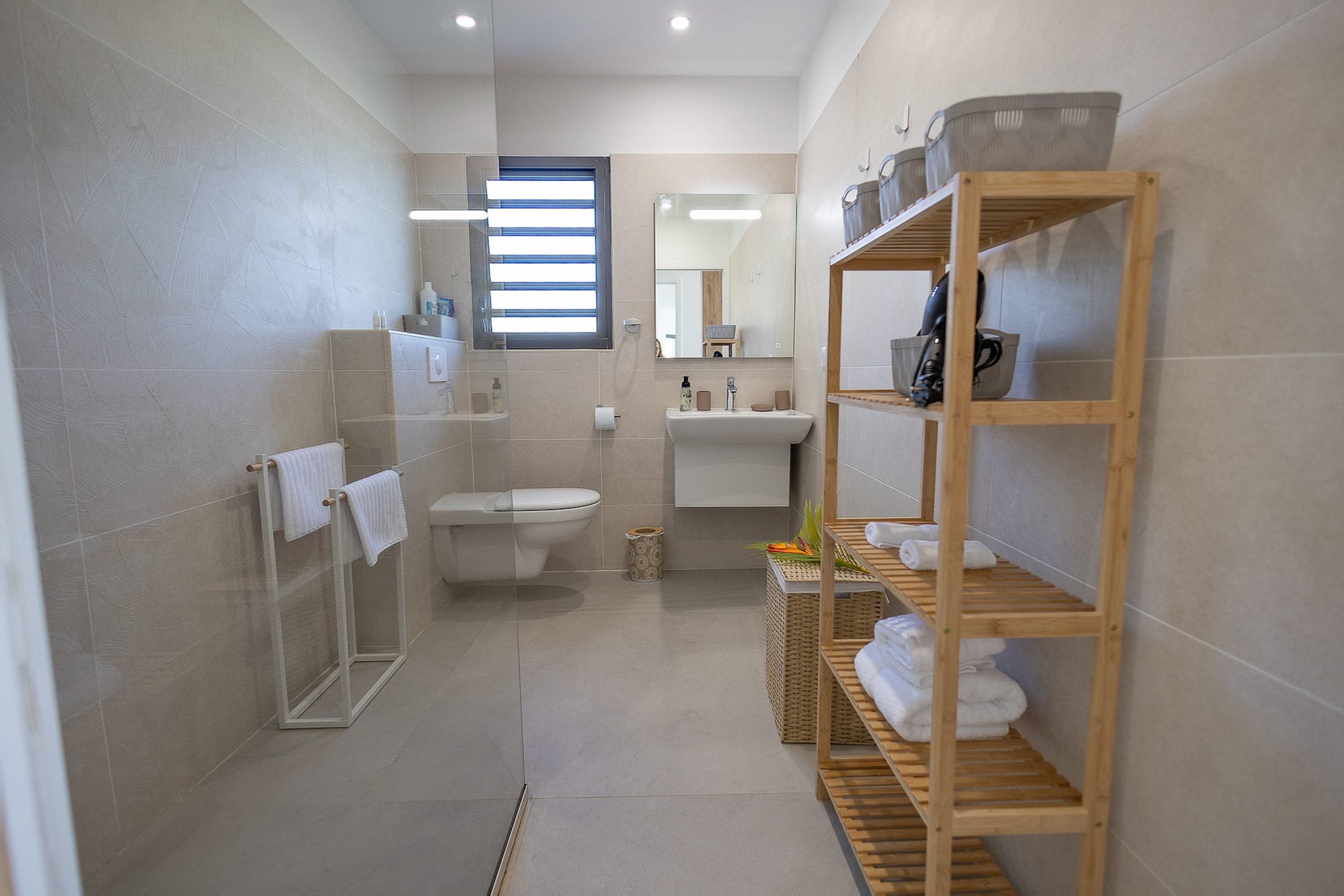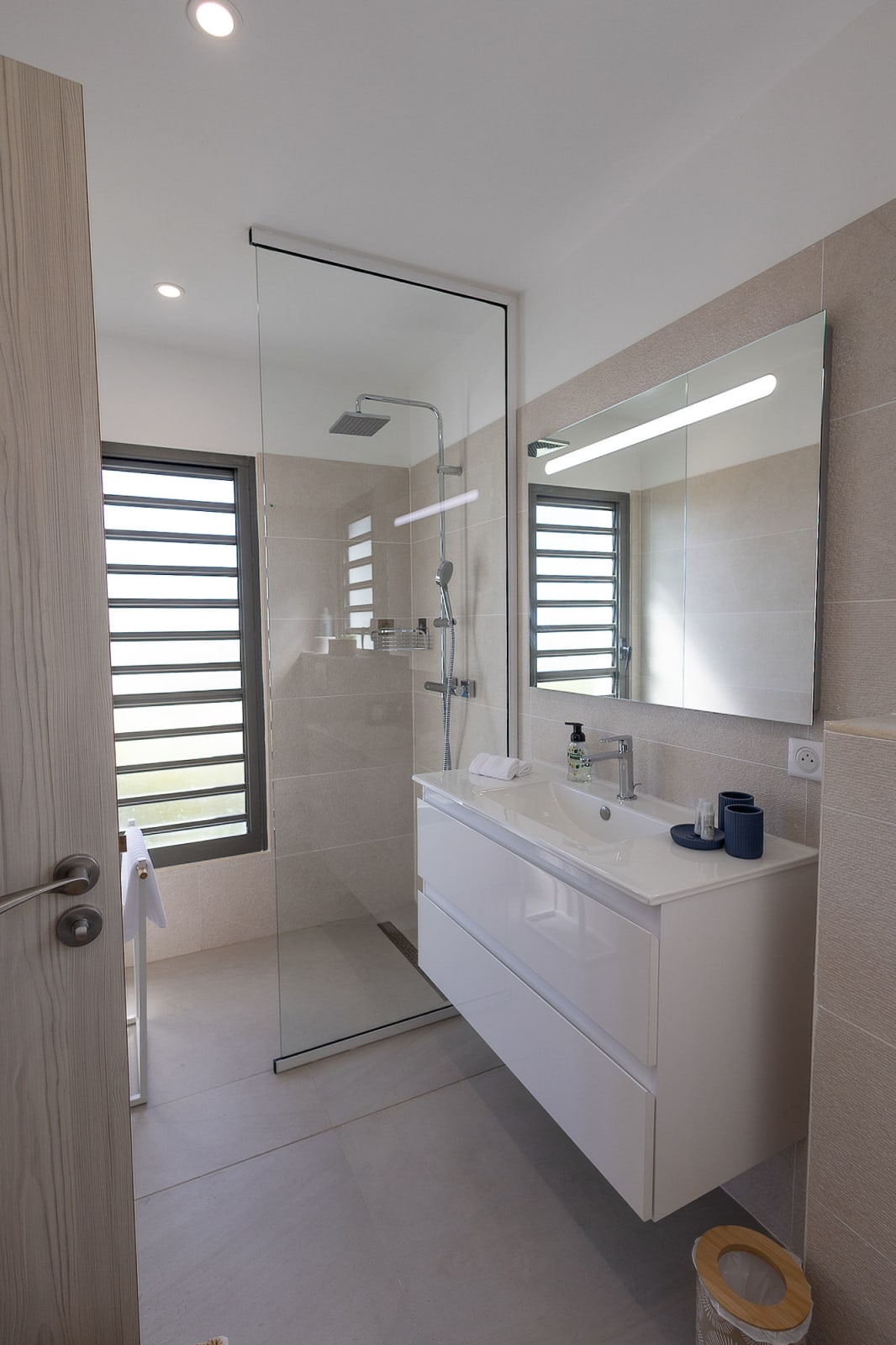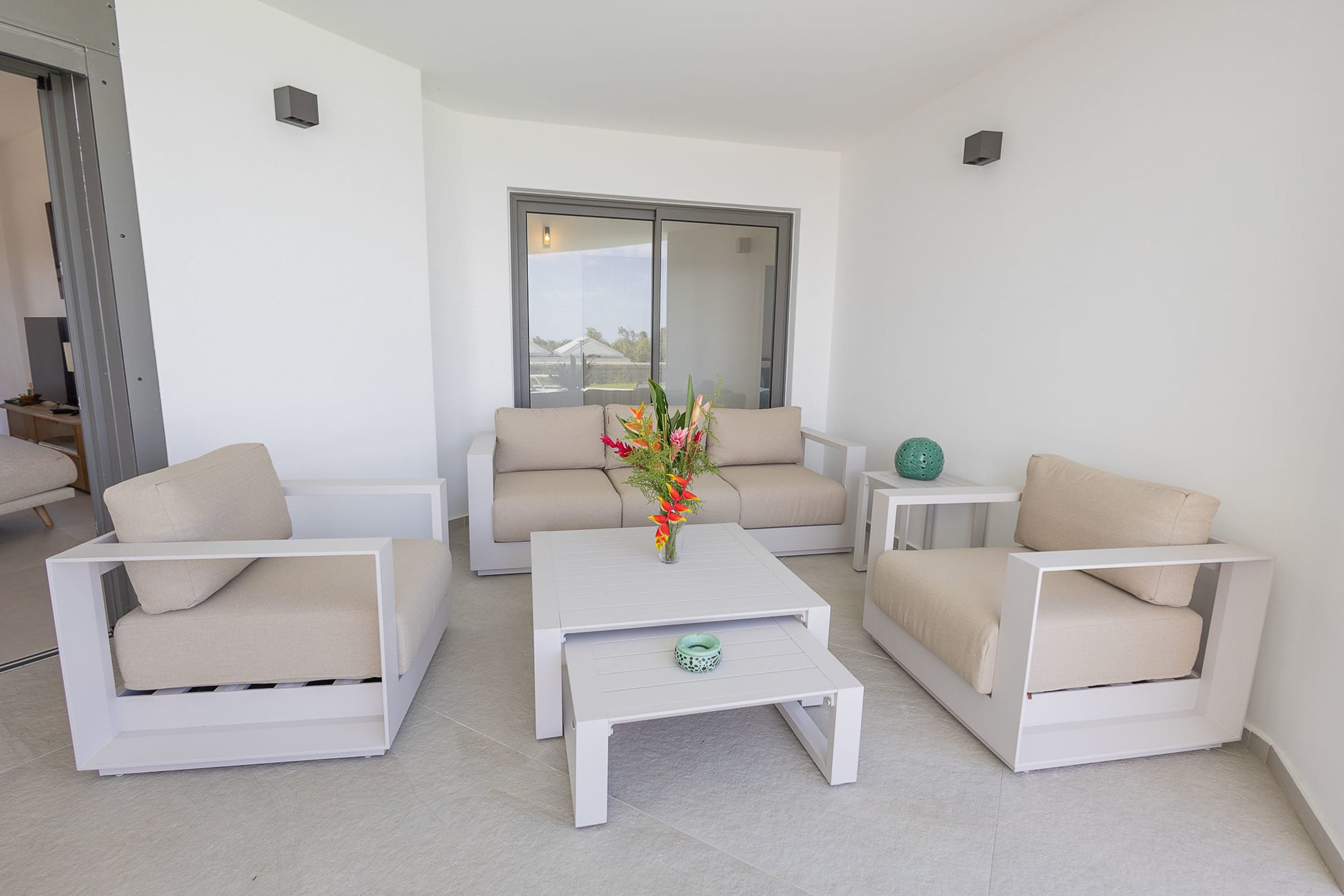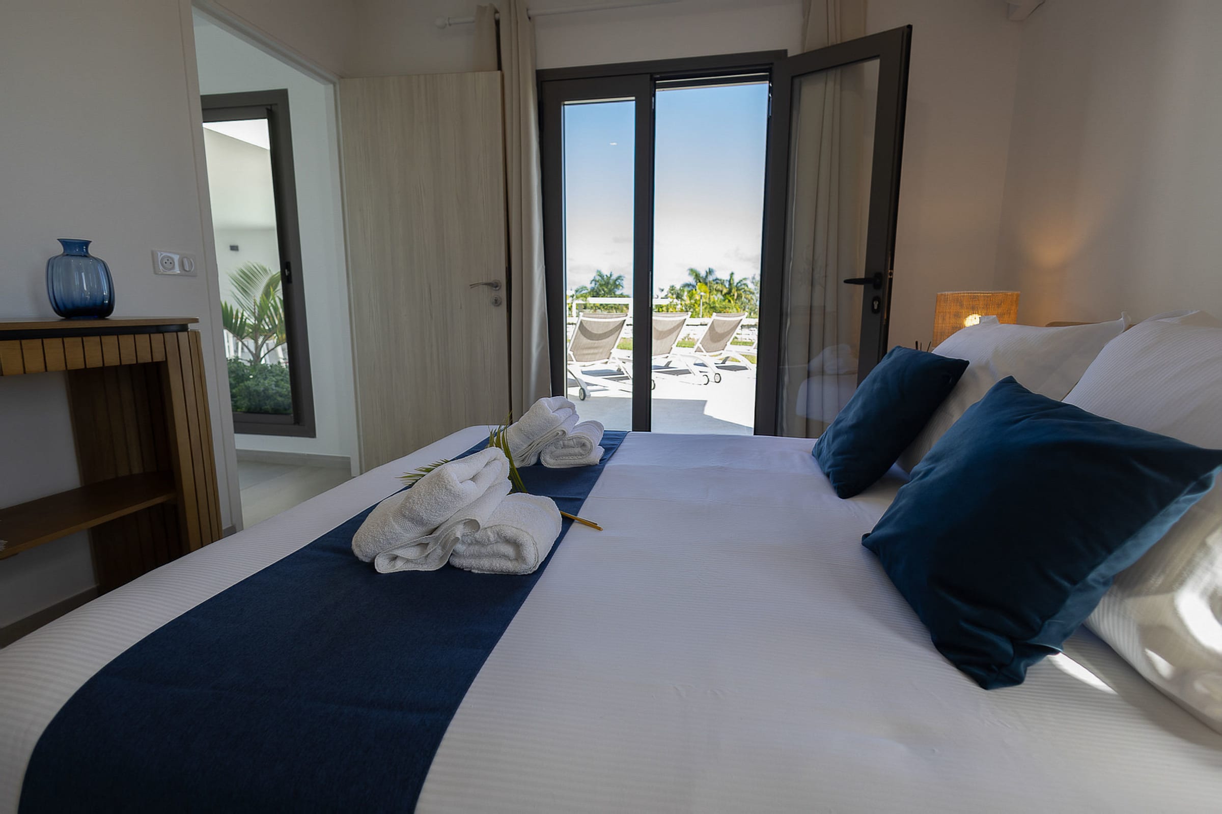 The 7x3 meter private swimming pool, surrounded by a relaxing lounge area, invites you to enjoy refreshing swims in complete privacy, while admiring the breathtaking view over the shimmering Caribbean Sea. Imagine yourself sipping a cocktail on the terrace while gazing at Petite Terre and Marie-Galante, under the gentle tropical breeze.