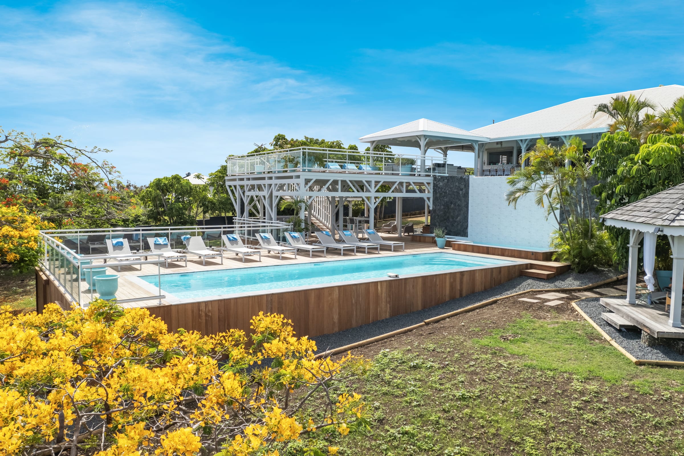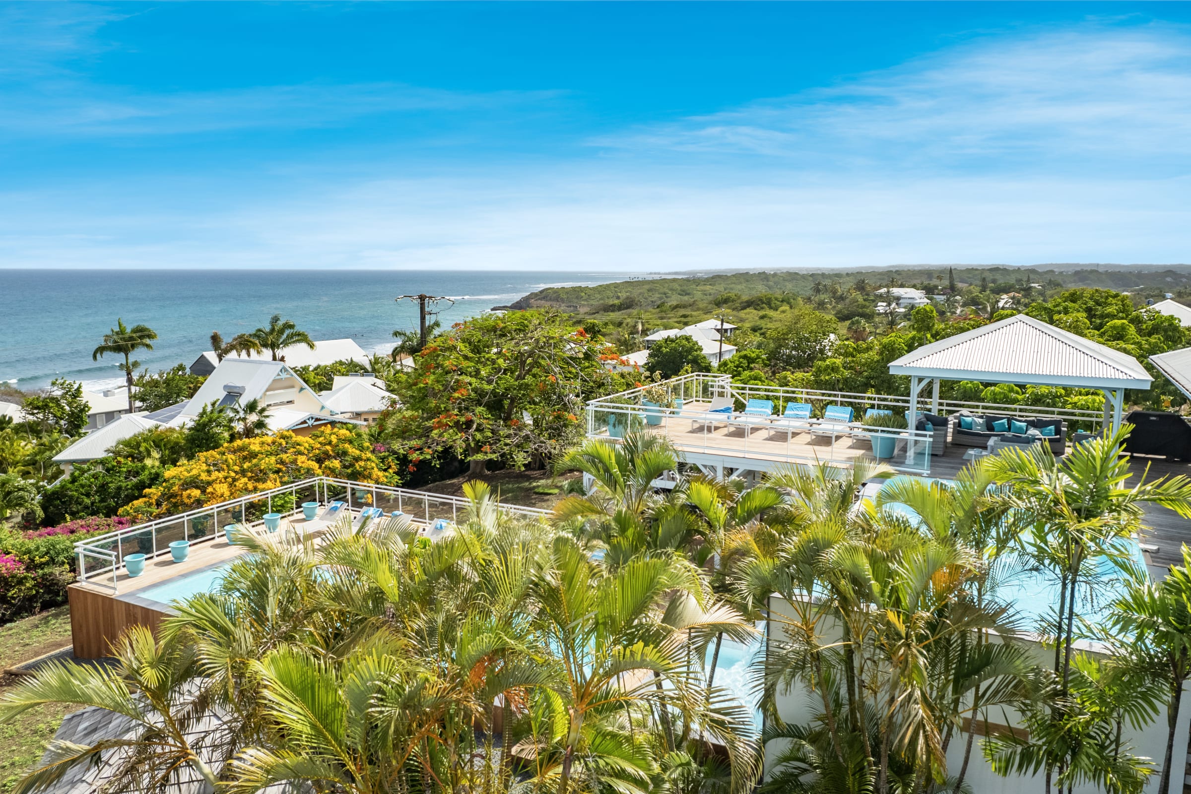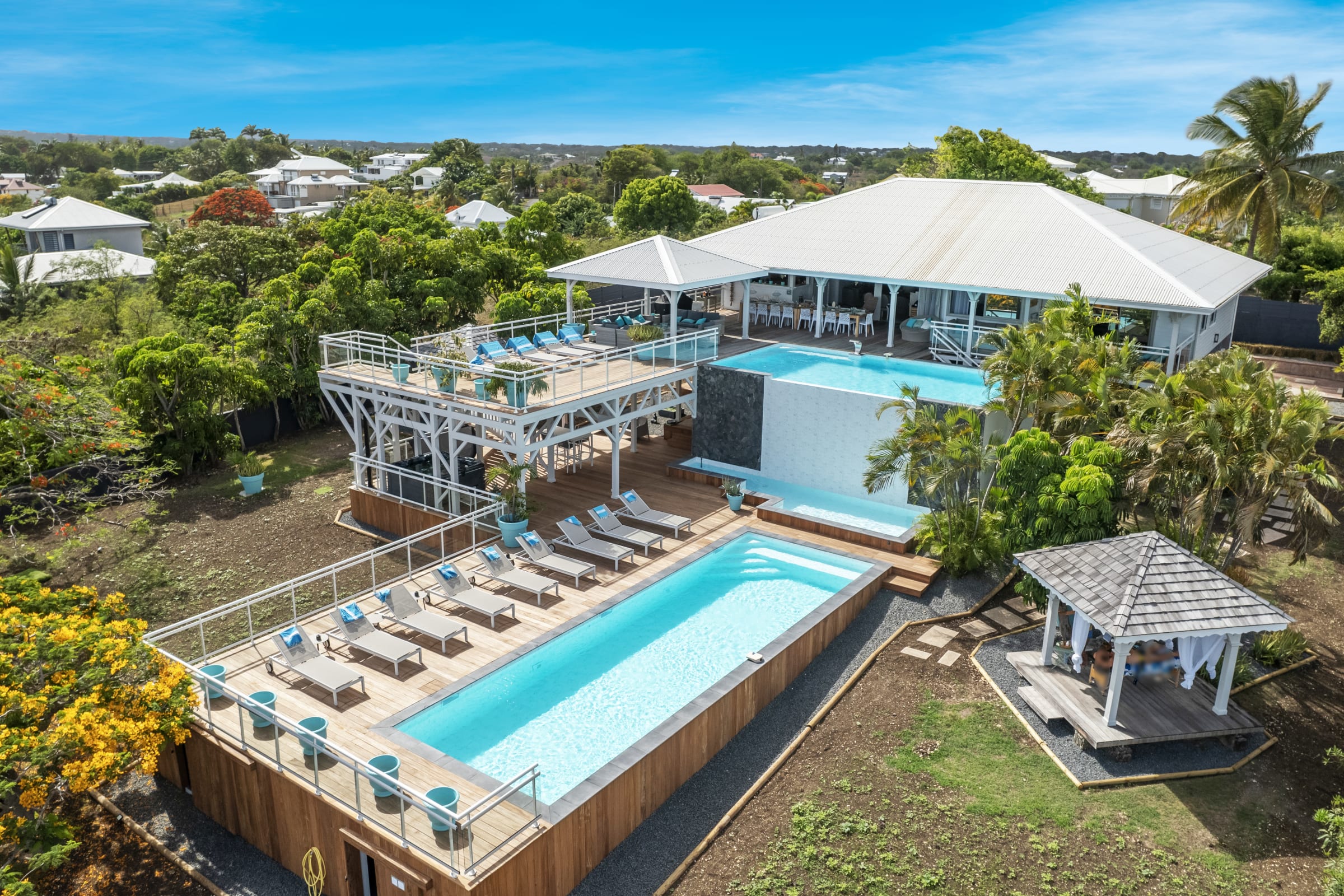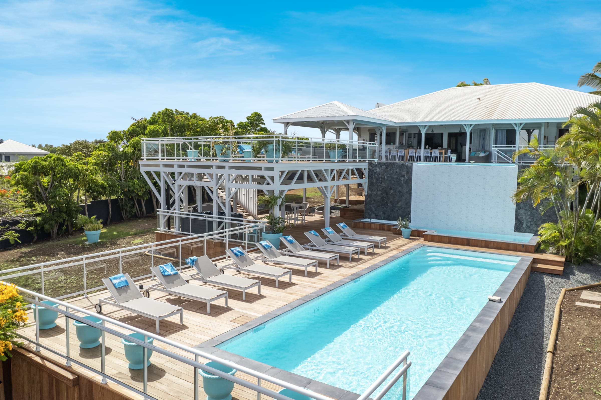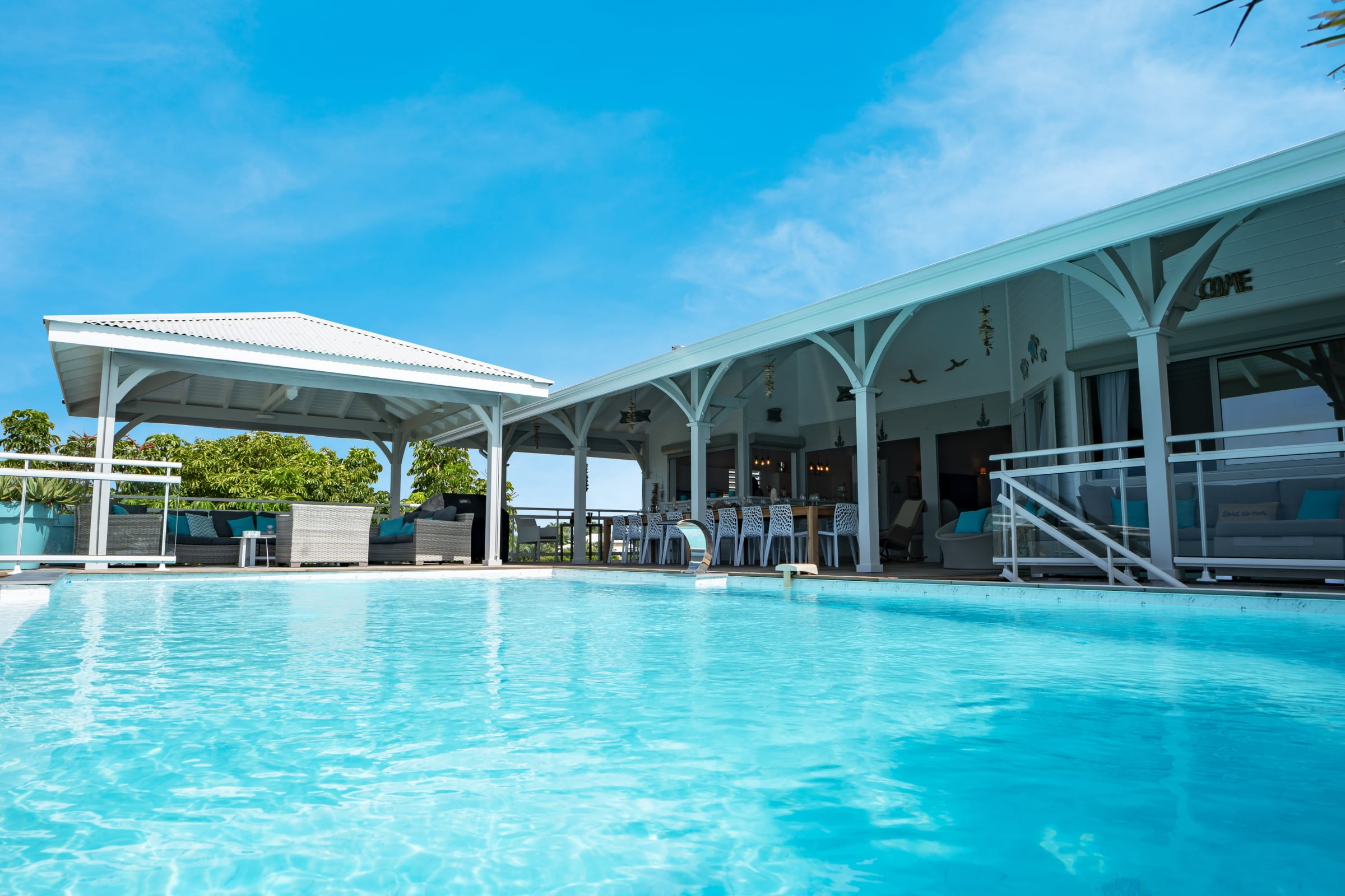 Relax near the 2 pools (5X9 overflow) (4X12) and the children's pool or enjoy a massage under the 2 carbets of 28 m2 swept by the Trade winds.