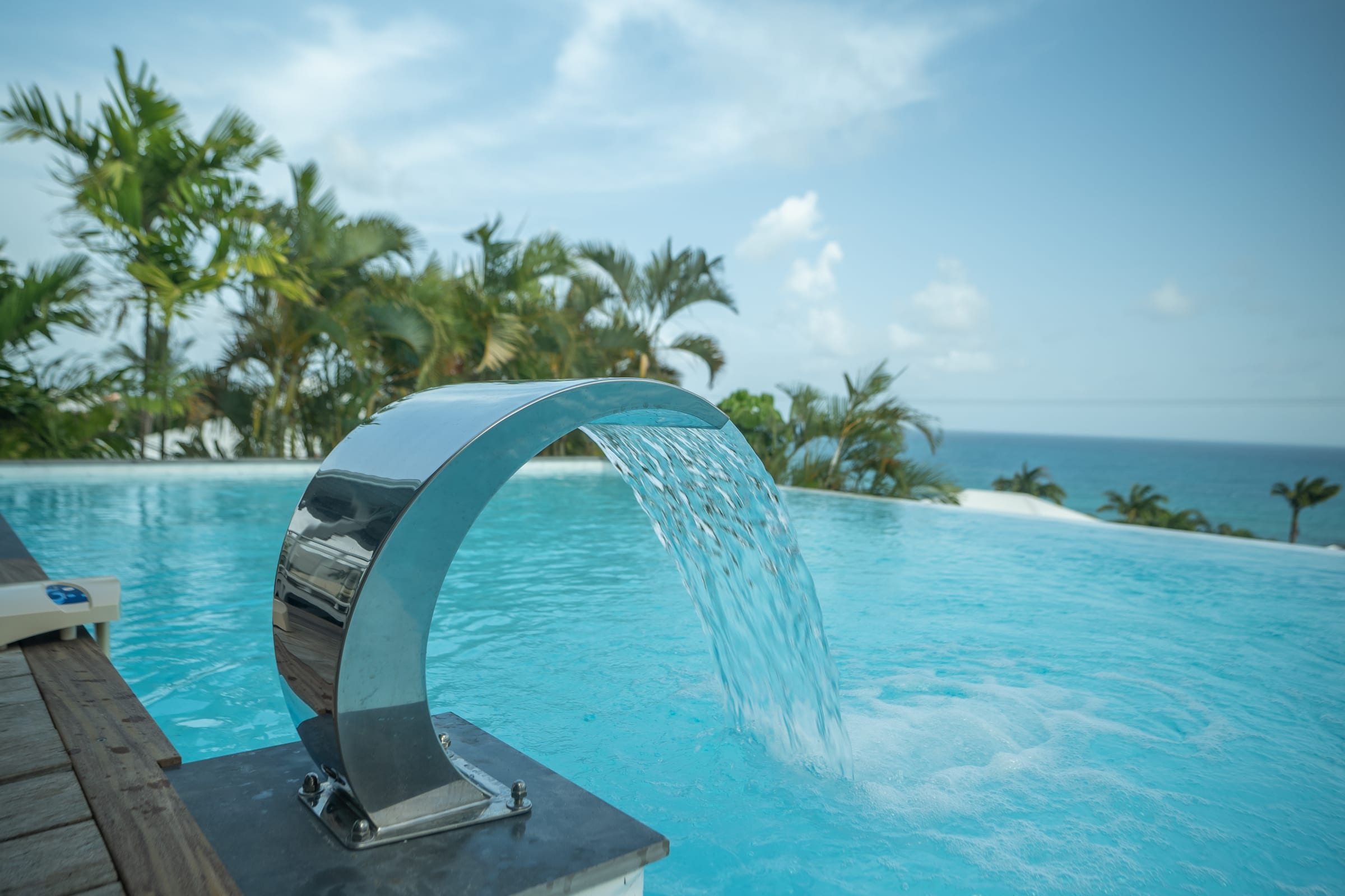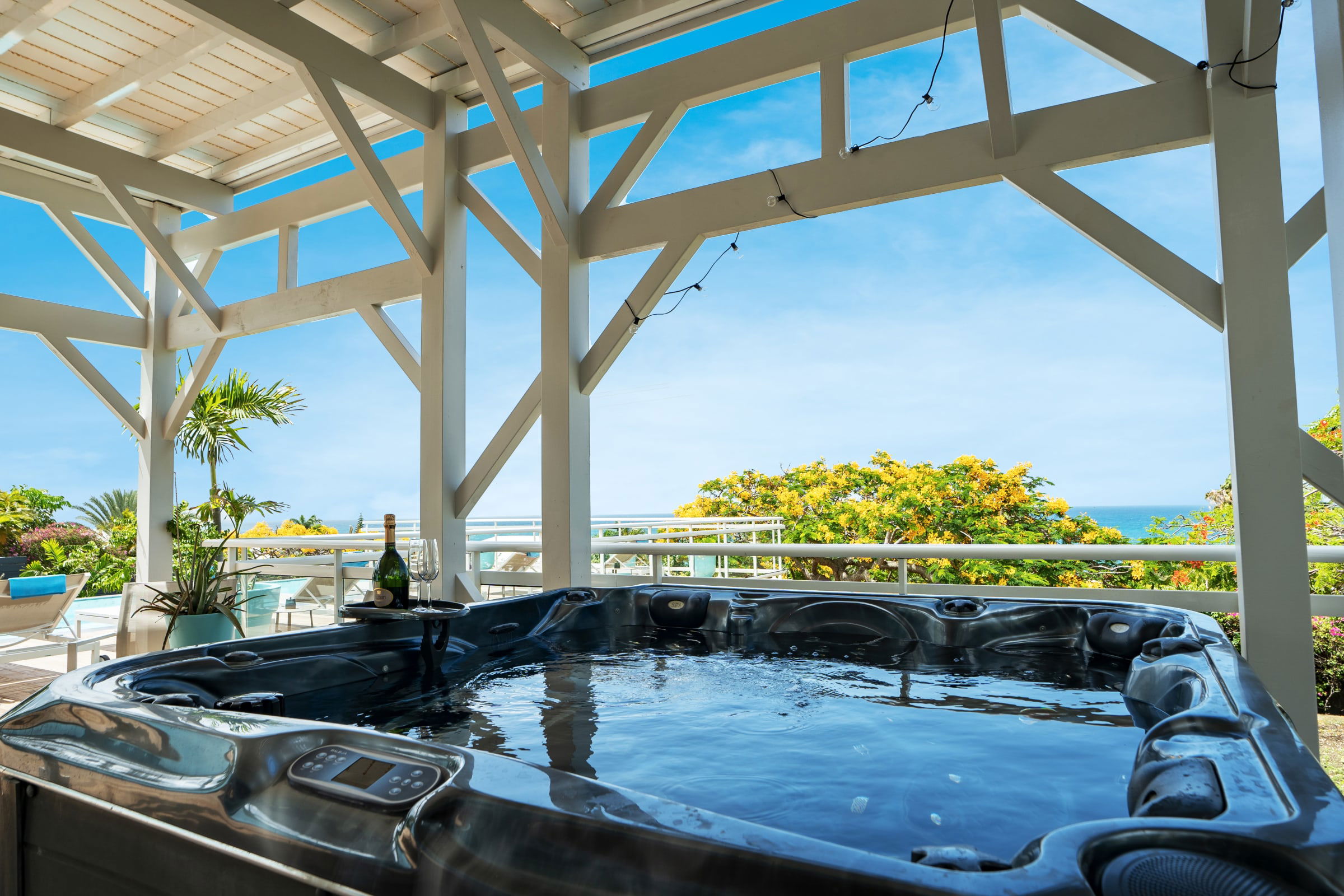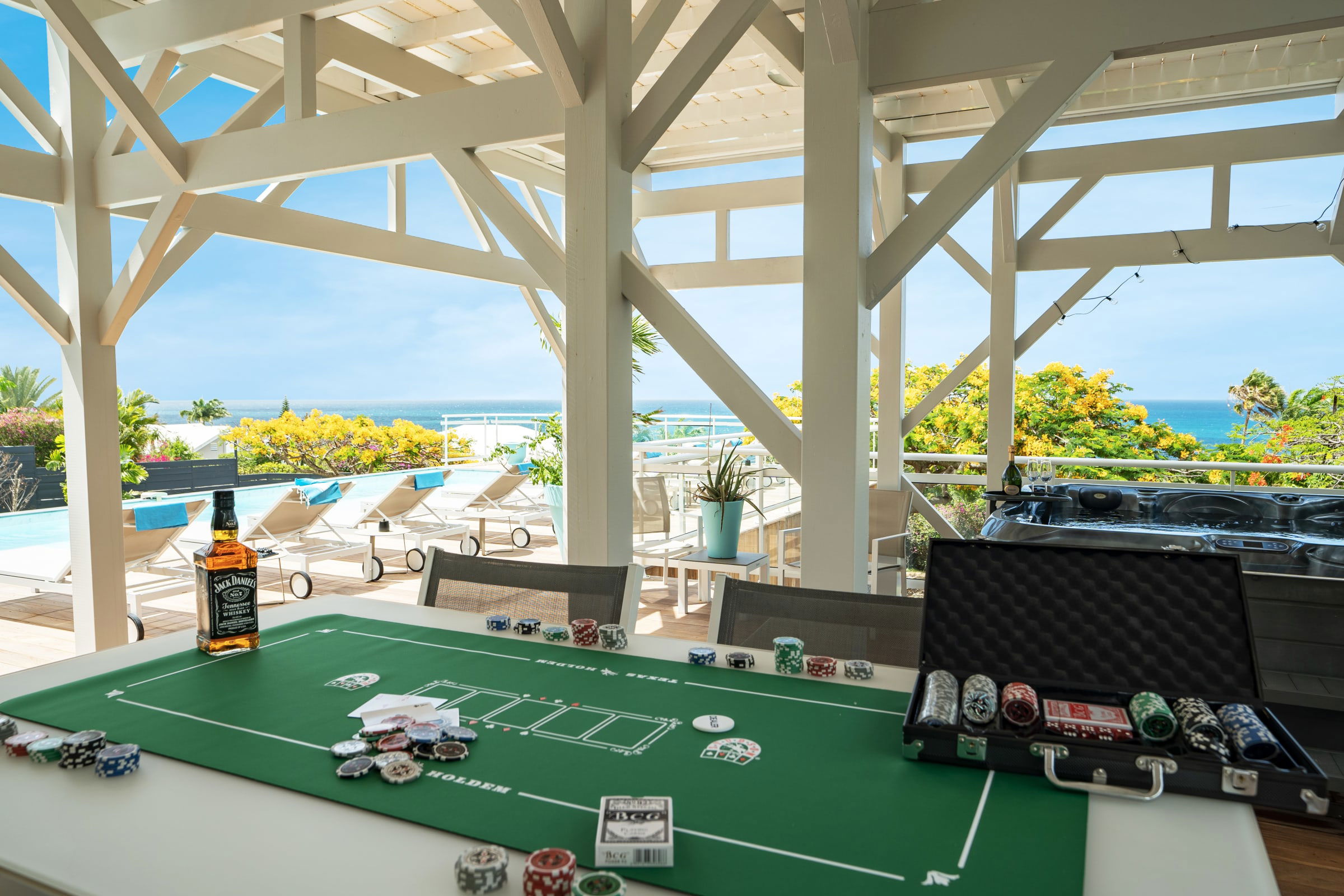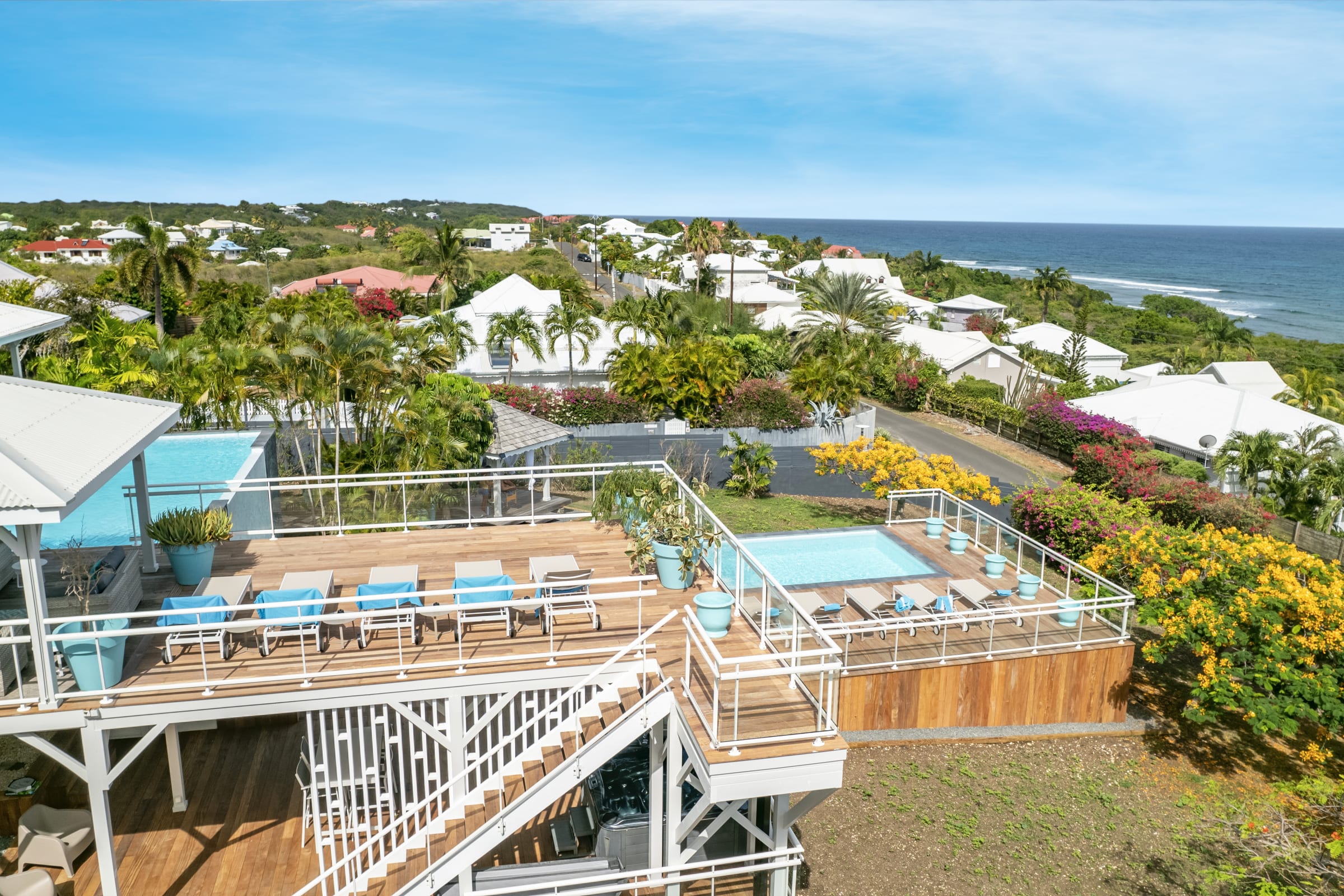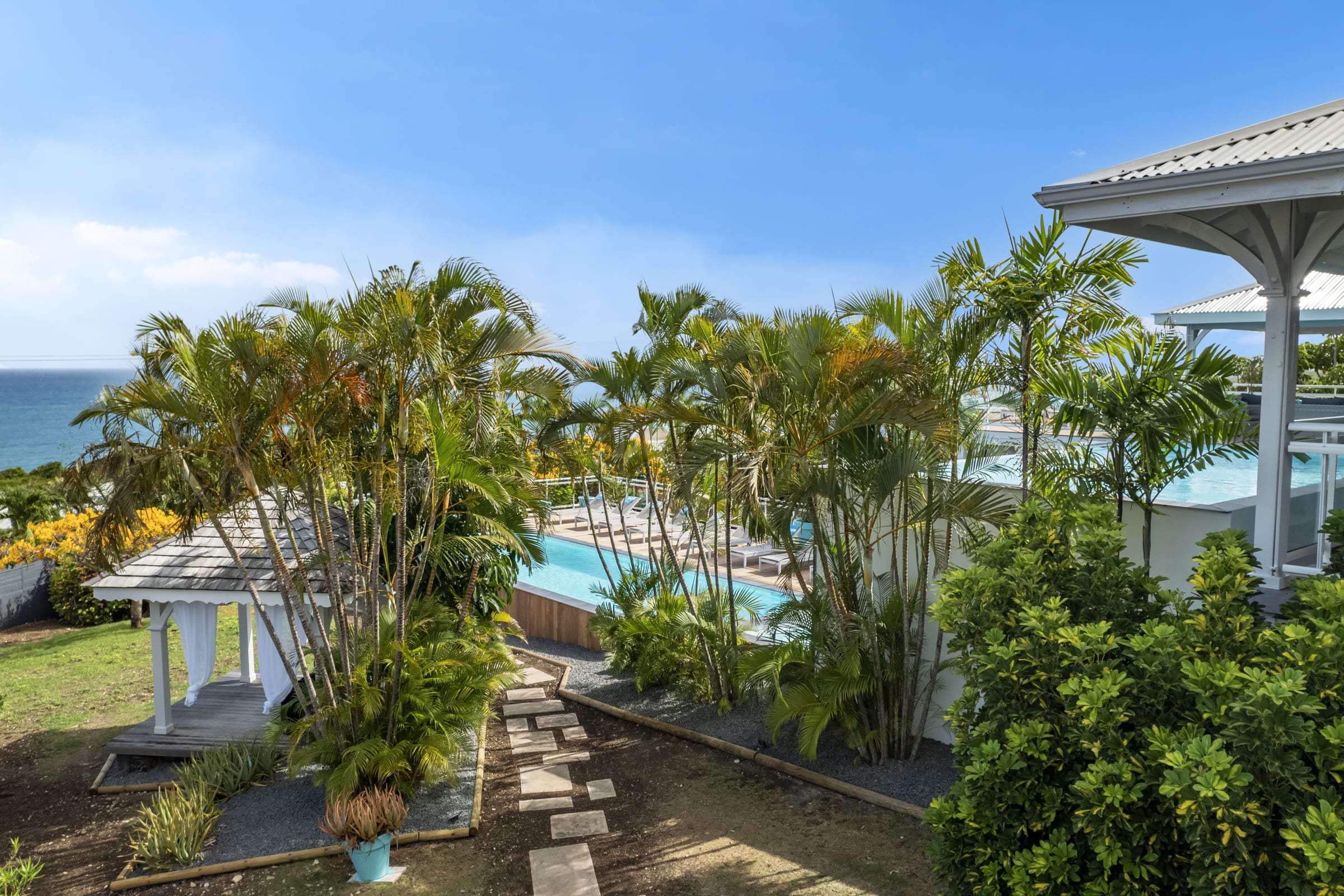 Relax near the 2 pools (5X9 overflow) (4X12) and the children's pool or enjoy a massage under the 2 carbets of 28 m2 swept by the Trade winds.