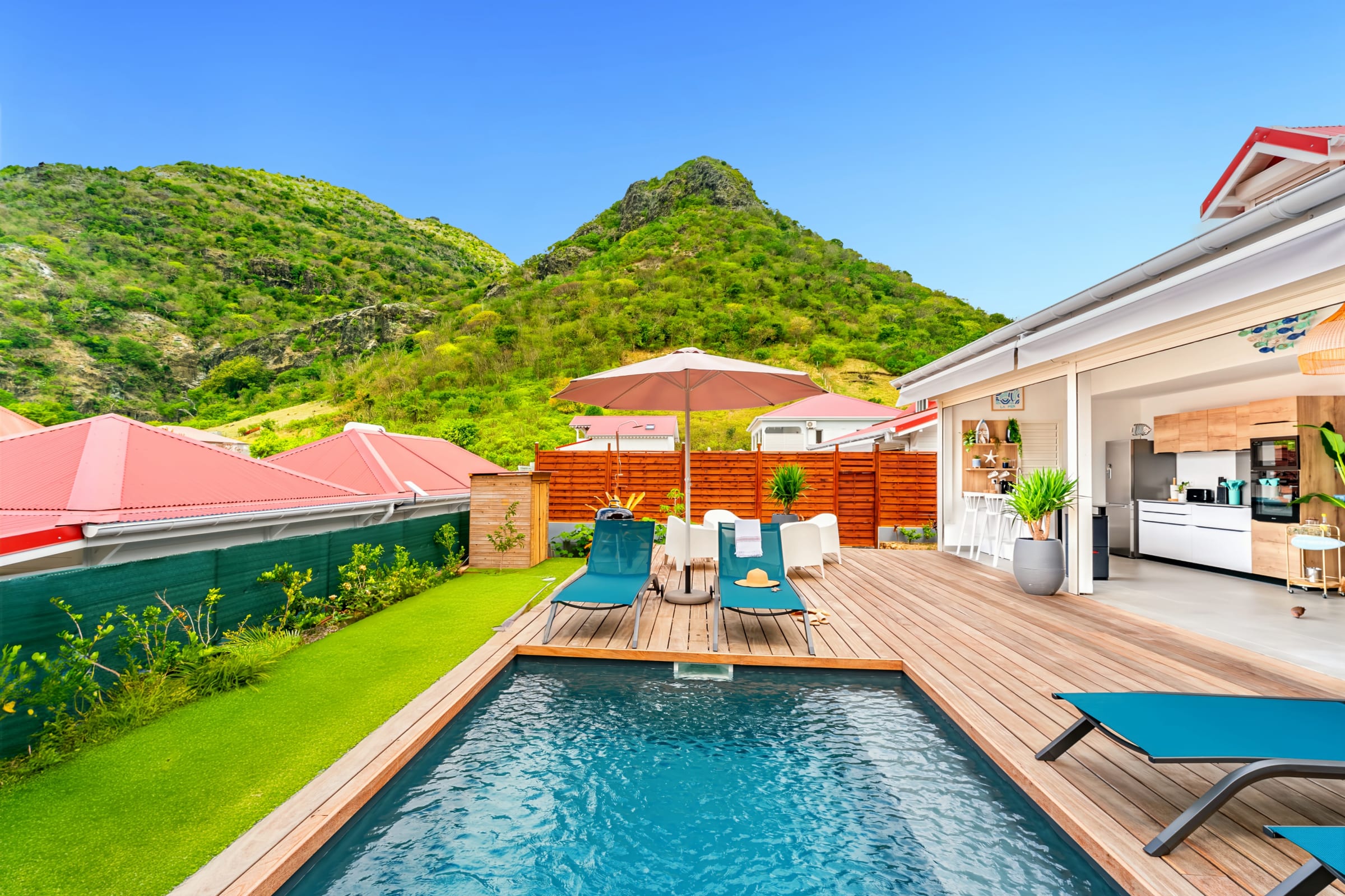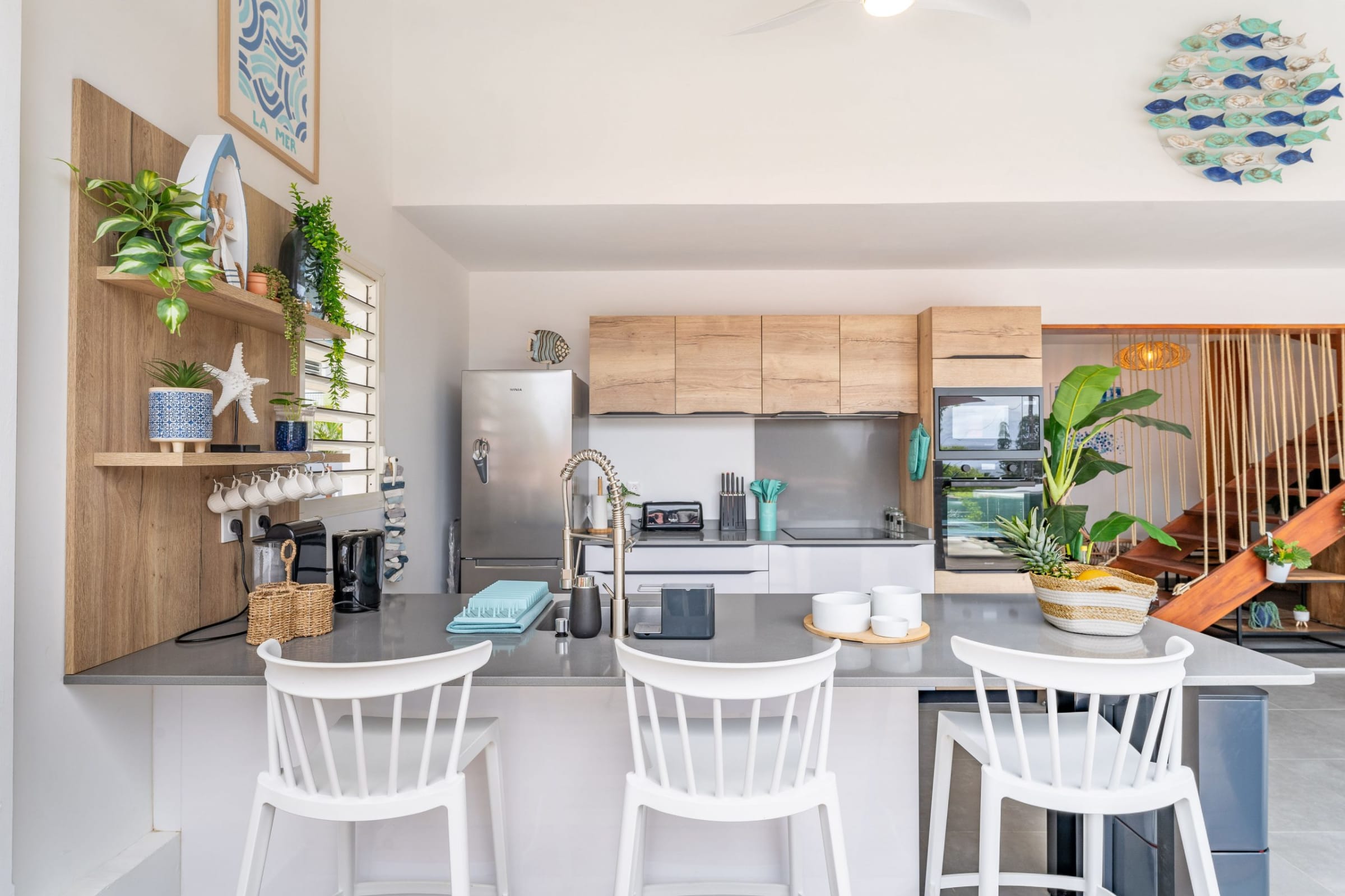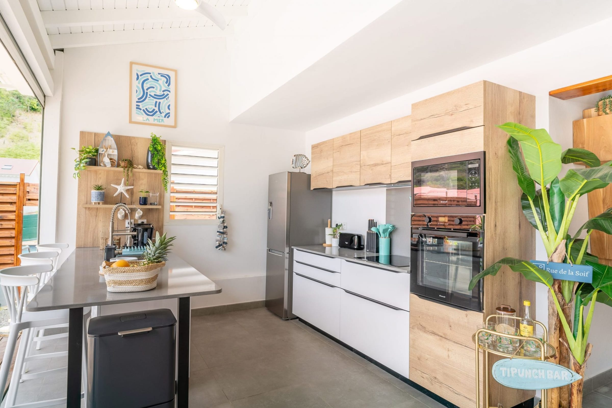 The perfectly equipped kitchen harmoniously combines functionality and pleasure. It gives access to the terrace, where a dining table for eight people awaits you under the blue Caribbean sky. An extension, complete with a swimming pool, deckchairs and a coal barbecue, completes this idyllic setting, perfect for moments of conviviality with family or friends.